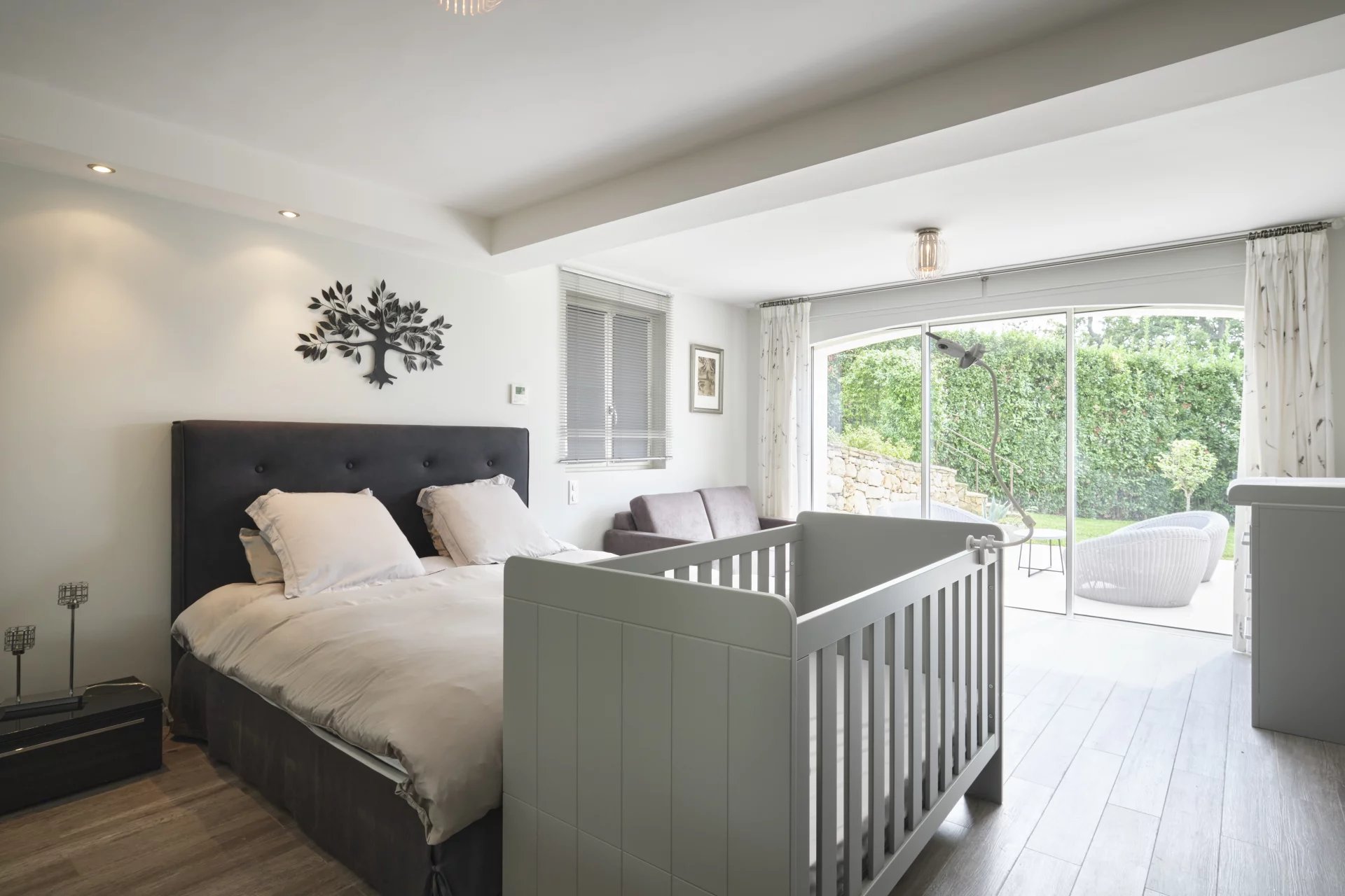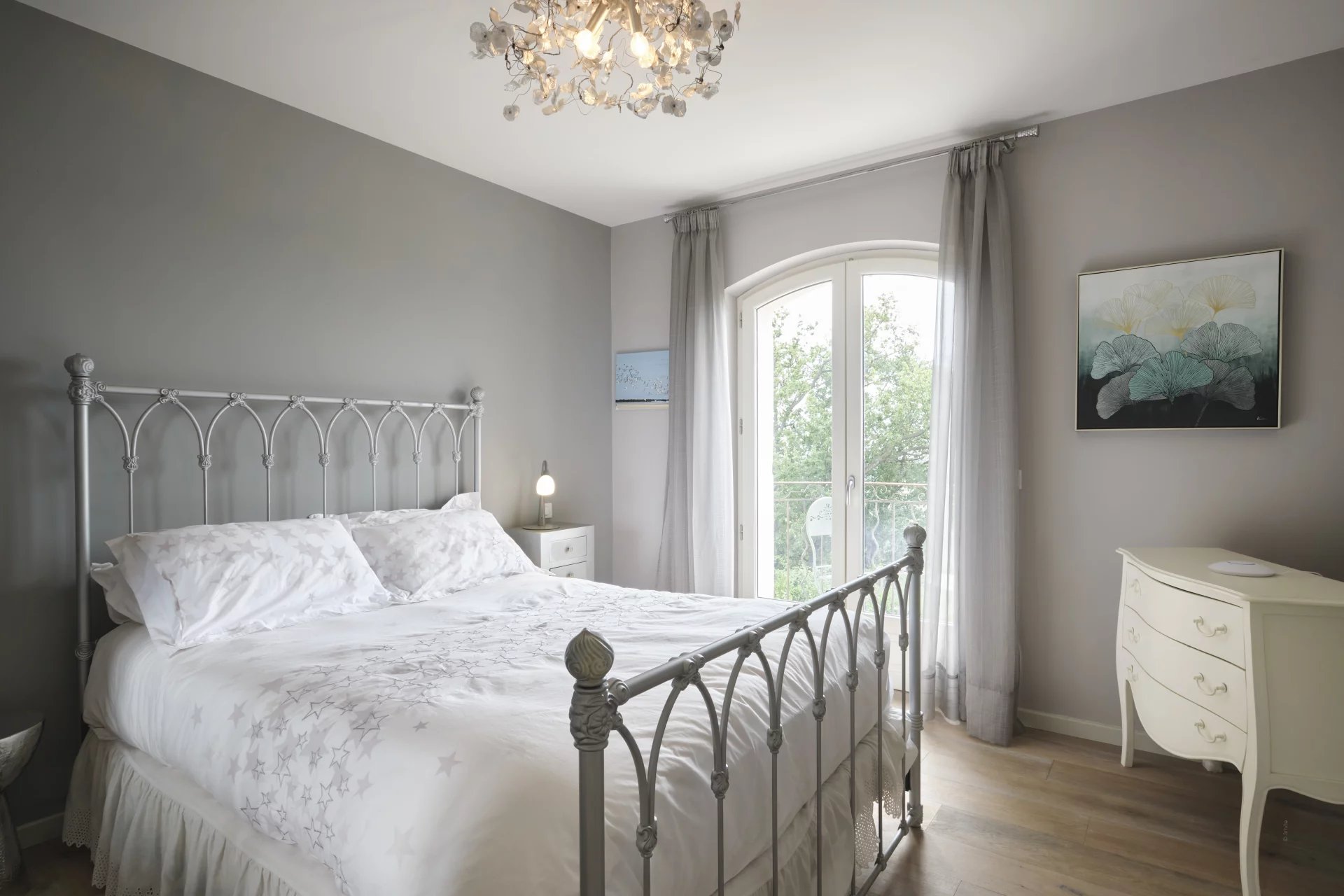 A few steps lead up to the master suite with en-suite bathroom, dressing room and a beautiful private terrace with breathtaking views of the bay of Mandelieu and the charming village of Chateauneuf de Grasse.