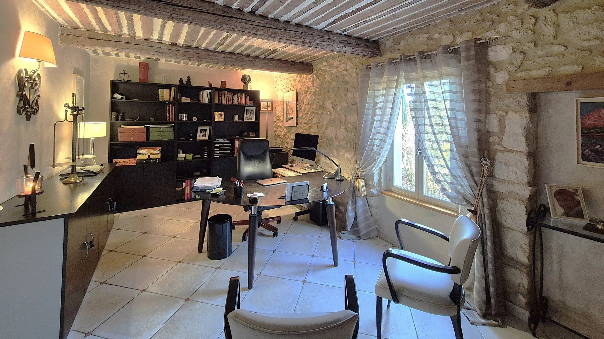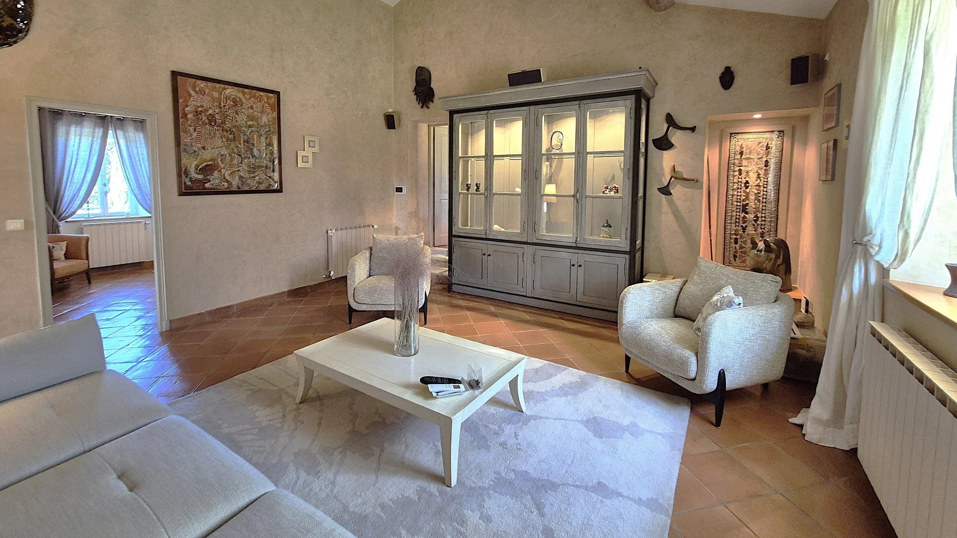 Outside, the 7,486 m2 grounds are fully enclosed and landscaped with a vegetable garden and an olive grove and an automatic watering system from a borehole.