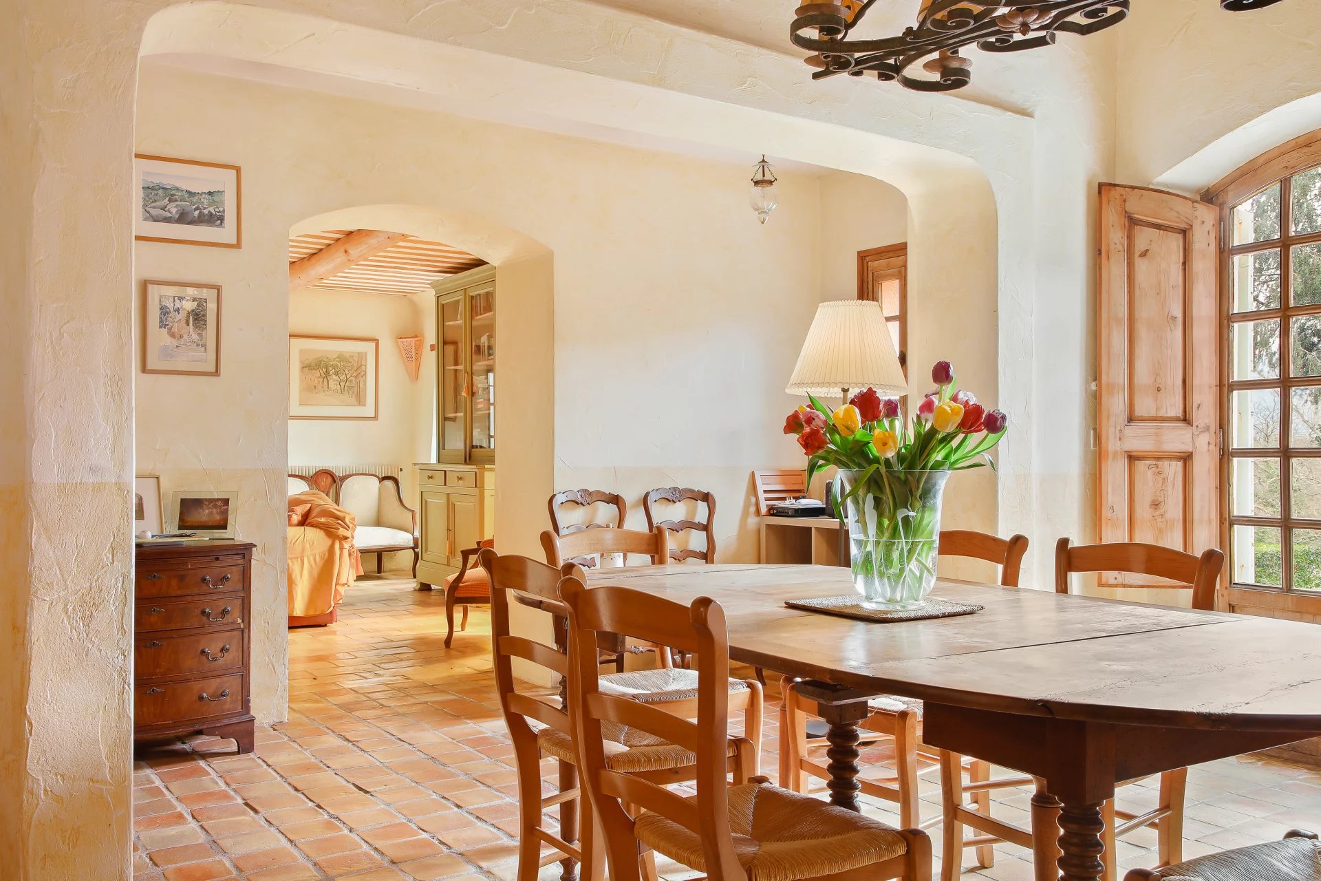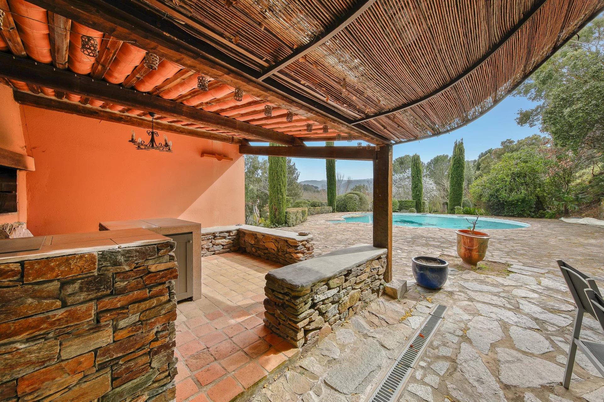 The country house is surrounded by pretty stone terraces so that everyone can enjoy the exceptional tranquillity. There is a round saltwater swimming pool and a fully shaded summer kitchen for outdoor dining.