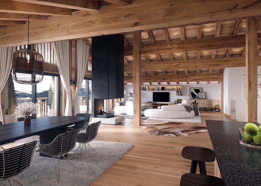 This elegant condominium is made up of three chalets comprising a total of 10 apartments. Each unit includes a covered parking space, an outdoor parking space, a ski locker, and access to a shared bike room. The positioning of the chalets offers breathtaking, unobstructed views of the Aravis mountain range and the iconic Mont Charvin.