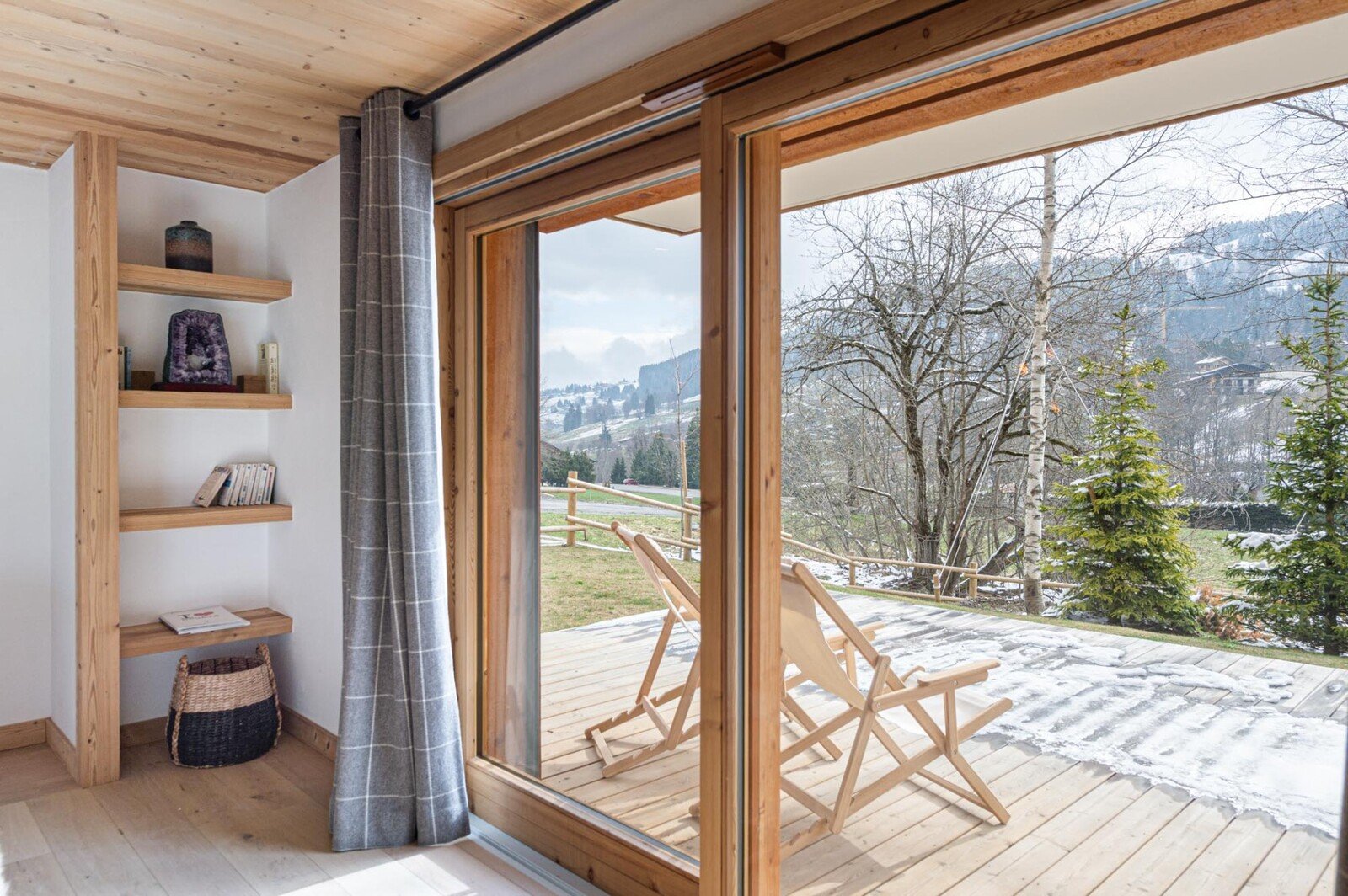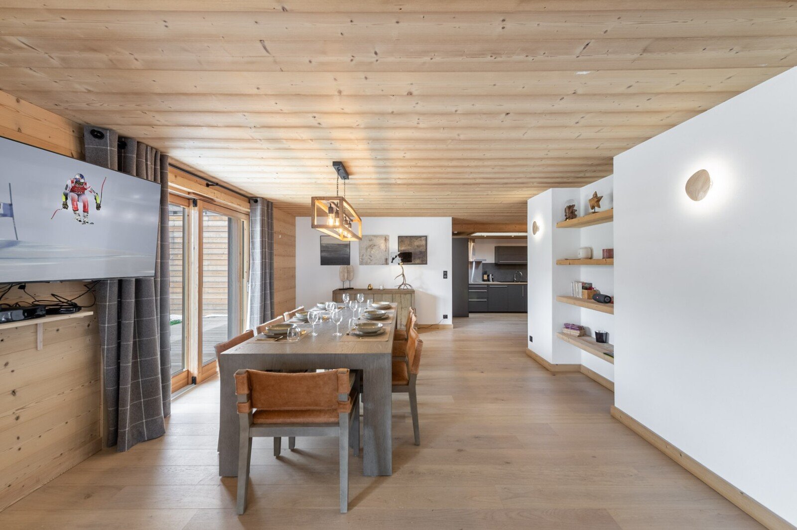 You’ll love the generous living area, which is bathed in light thanks to its many bay windows, the lounge with fireplace, the dining room and a large equipped Open Kitchen. The wood-panelled walls and ceiling add to the chalet feel. The space opens onto an unoverlooked terrace, perfect to enjoy the panoramic mountain views.