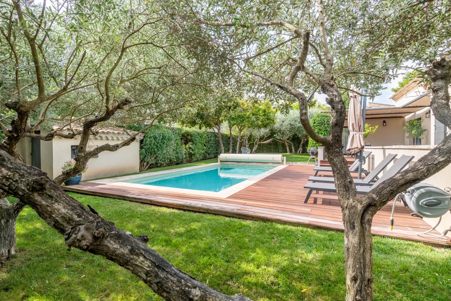 You’ll find a separate 46 m2 apartment, ideal for visiting family or friends, comprising a lounge with kitchen area, a bedroom and shower room. The 900 m2 garden is nicely planted and boasts an 8 x 4 m pool.