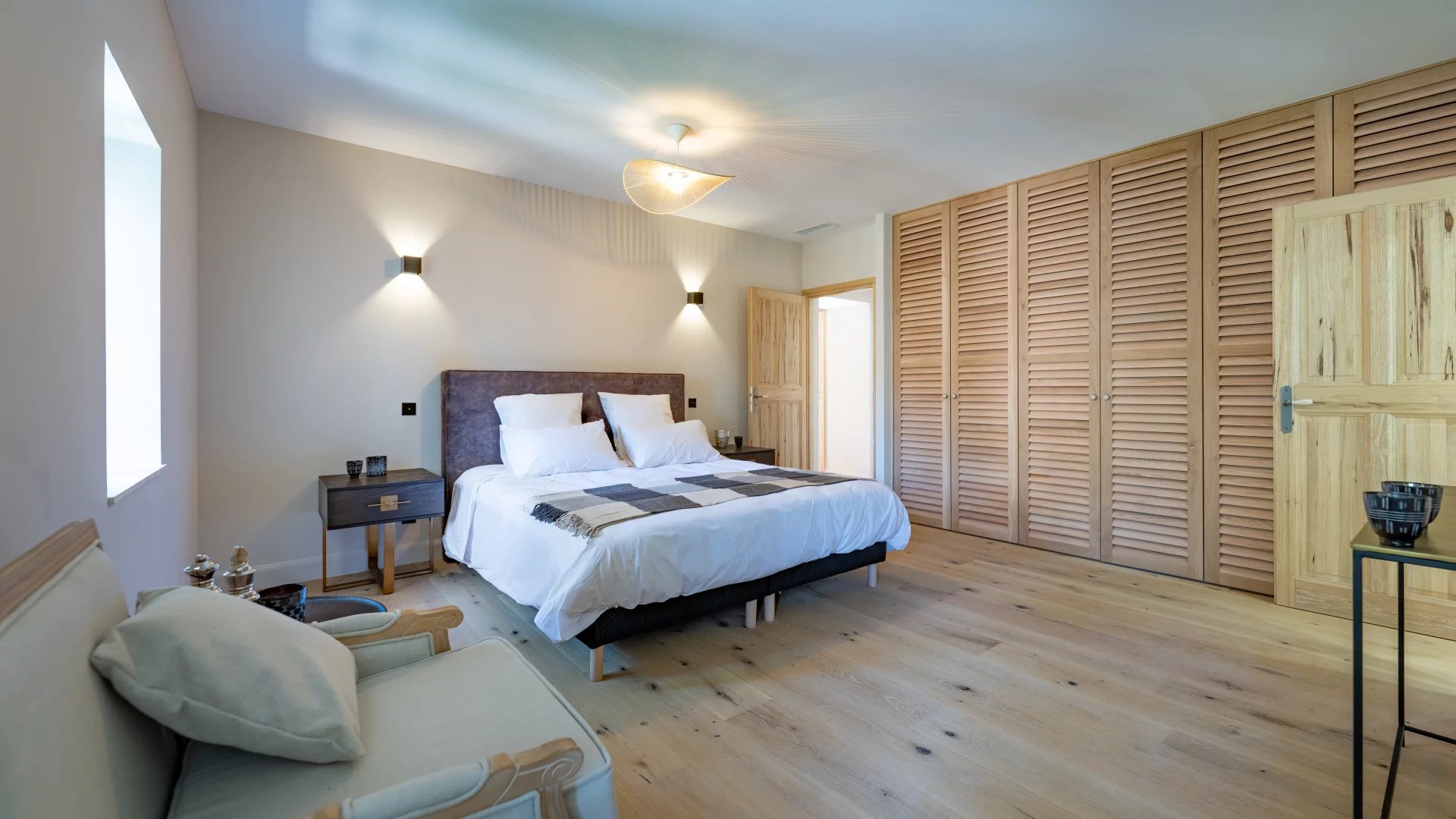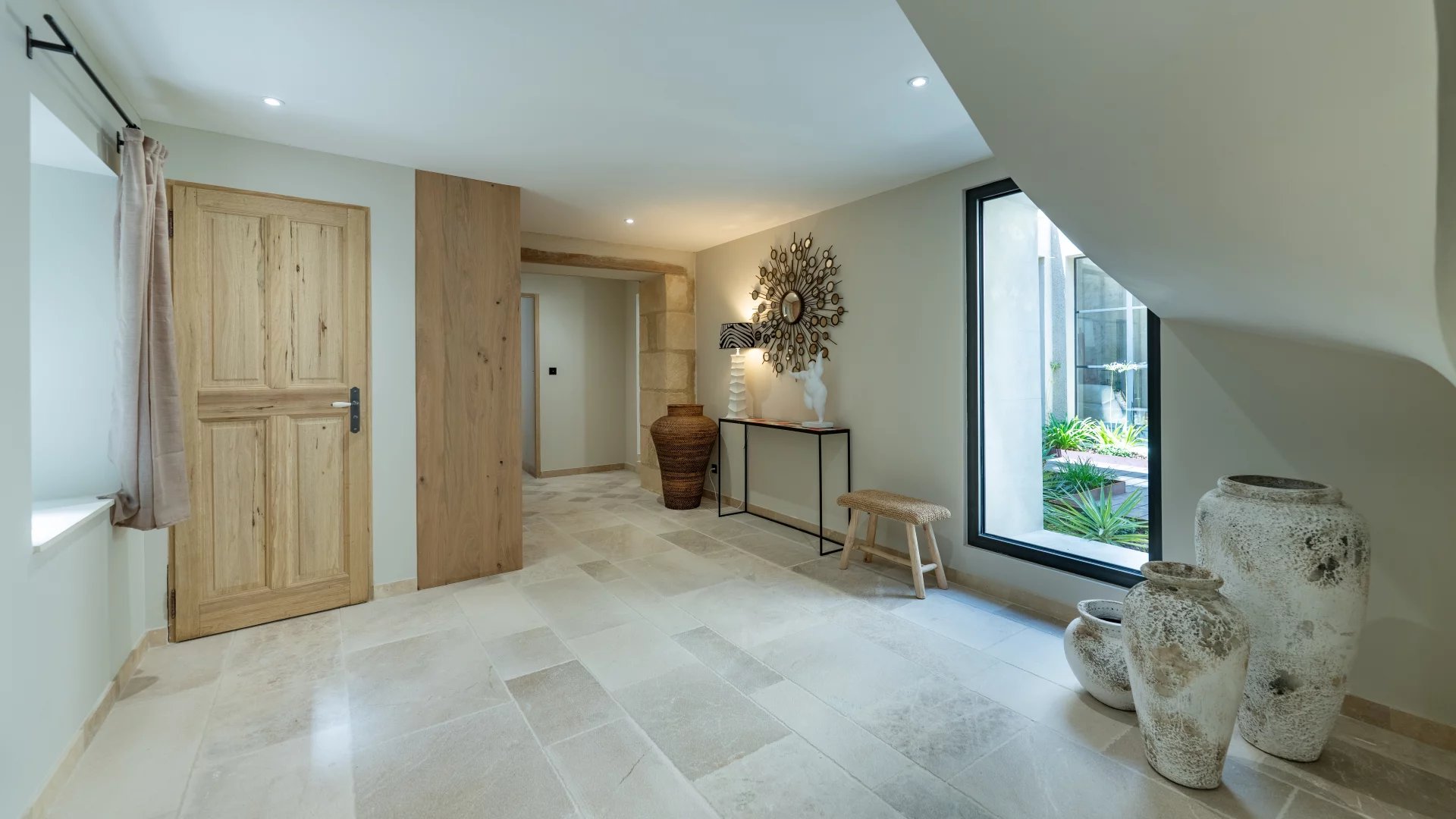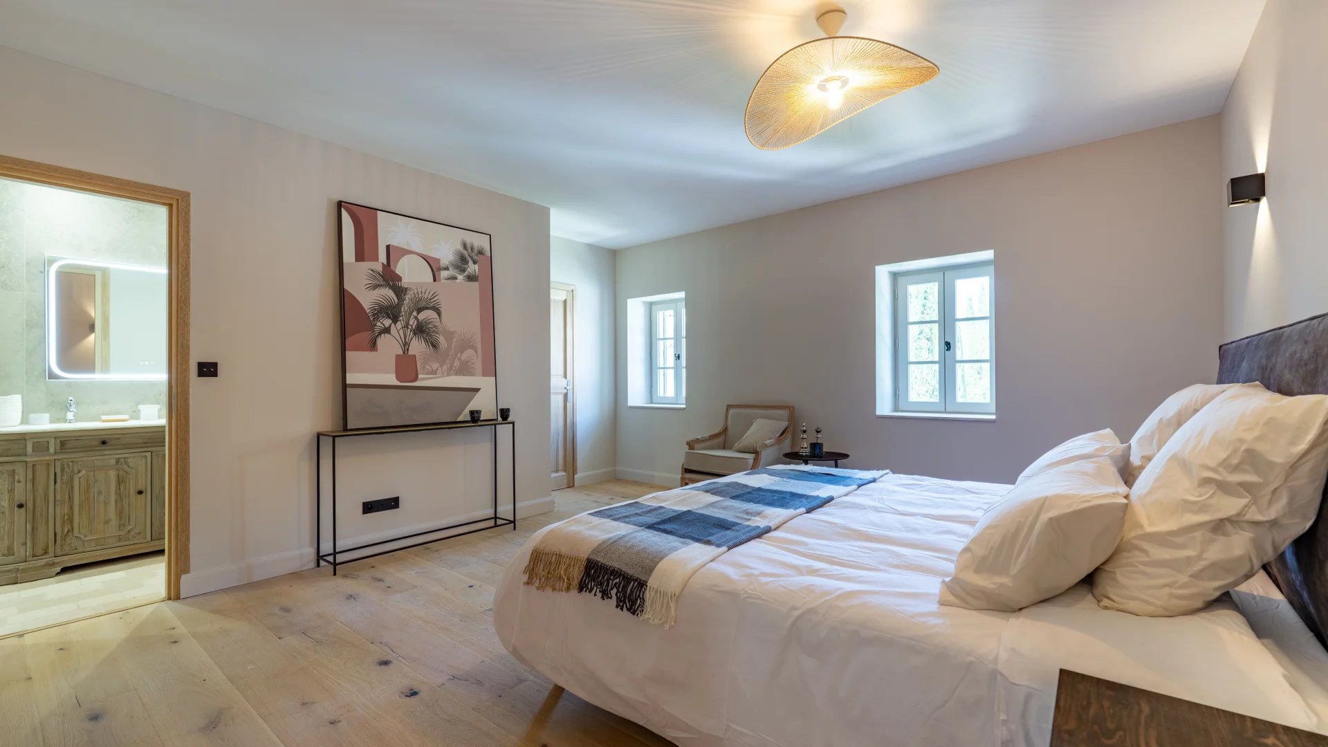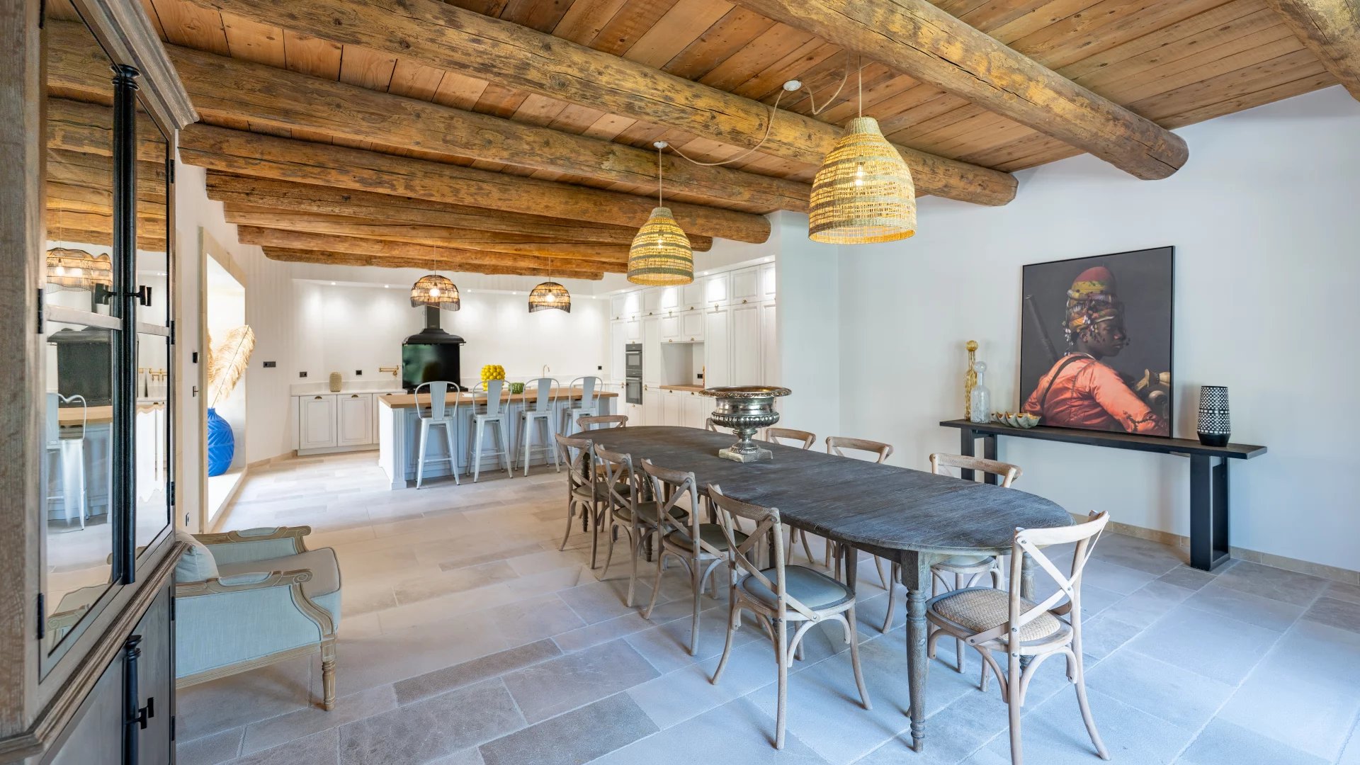 Spanning over 310 m2, the house opens onto a magnificent double-height living room with exposed beams, creating a grand yet inviting atmosphere. The spacious kitchen and dining area set the stage for convivial gatherings, while six en-suite bedrooms — including a ground-floor suite and an independent guest suite — offer privacy and comfort for family and friends.