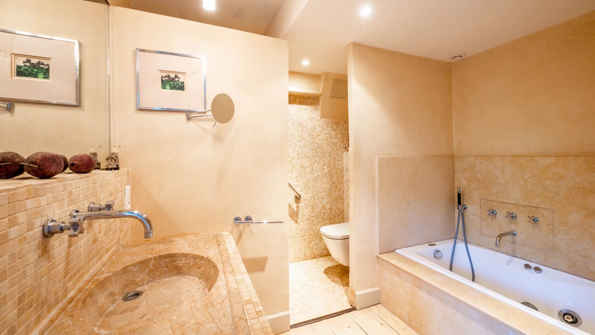 There is a total living area of over 470m2, with the main house enjoying generous volumes and plenty of natural light: here, on the ground floor, the accommodation comprises a stylish, well-fitted kitchen, a double reception room with fireplace, a library, a bedroom suite and a lovely orangery.