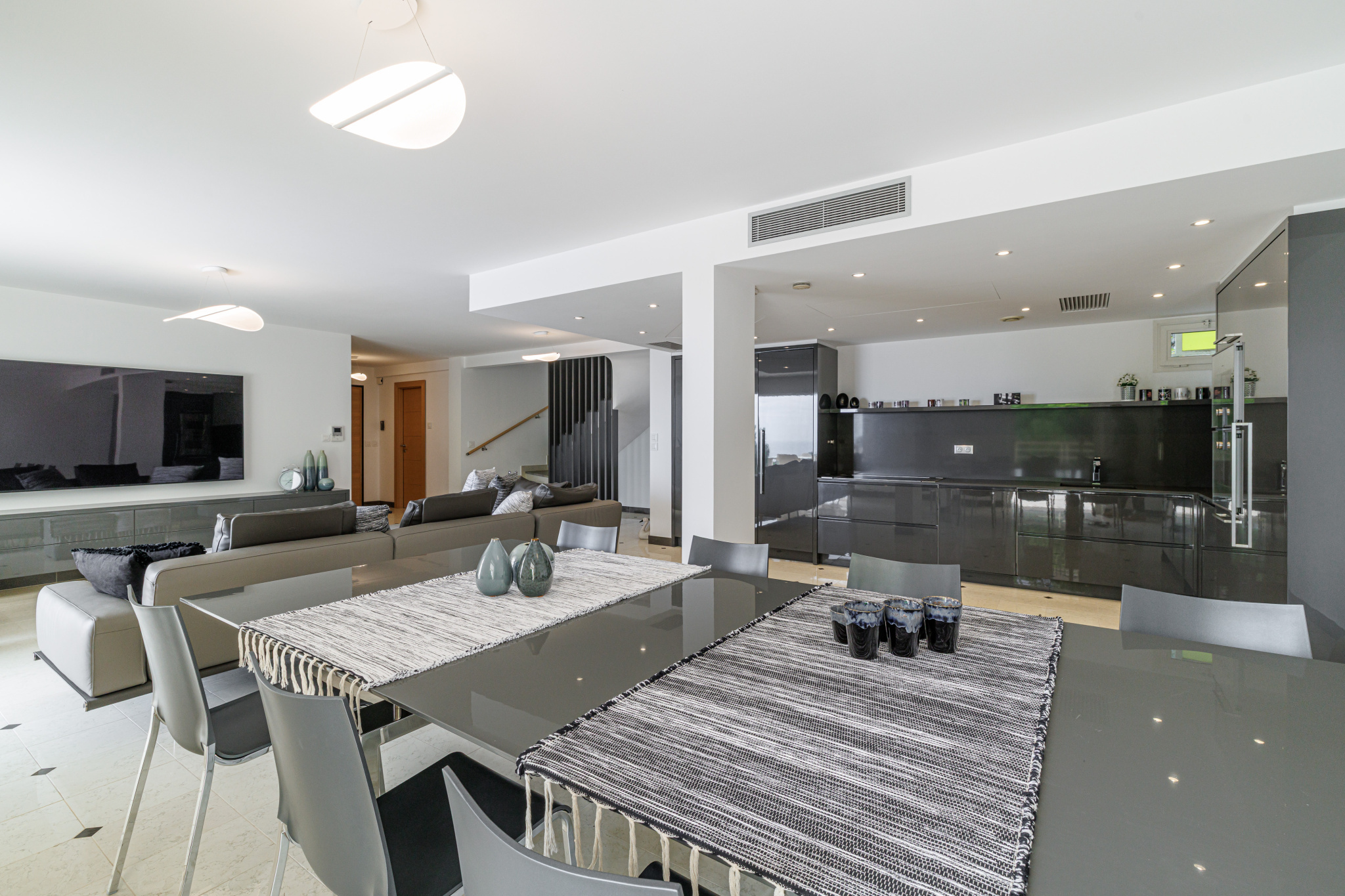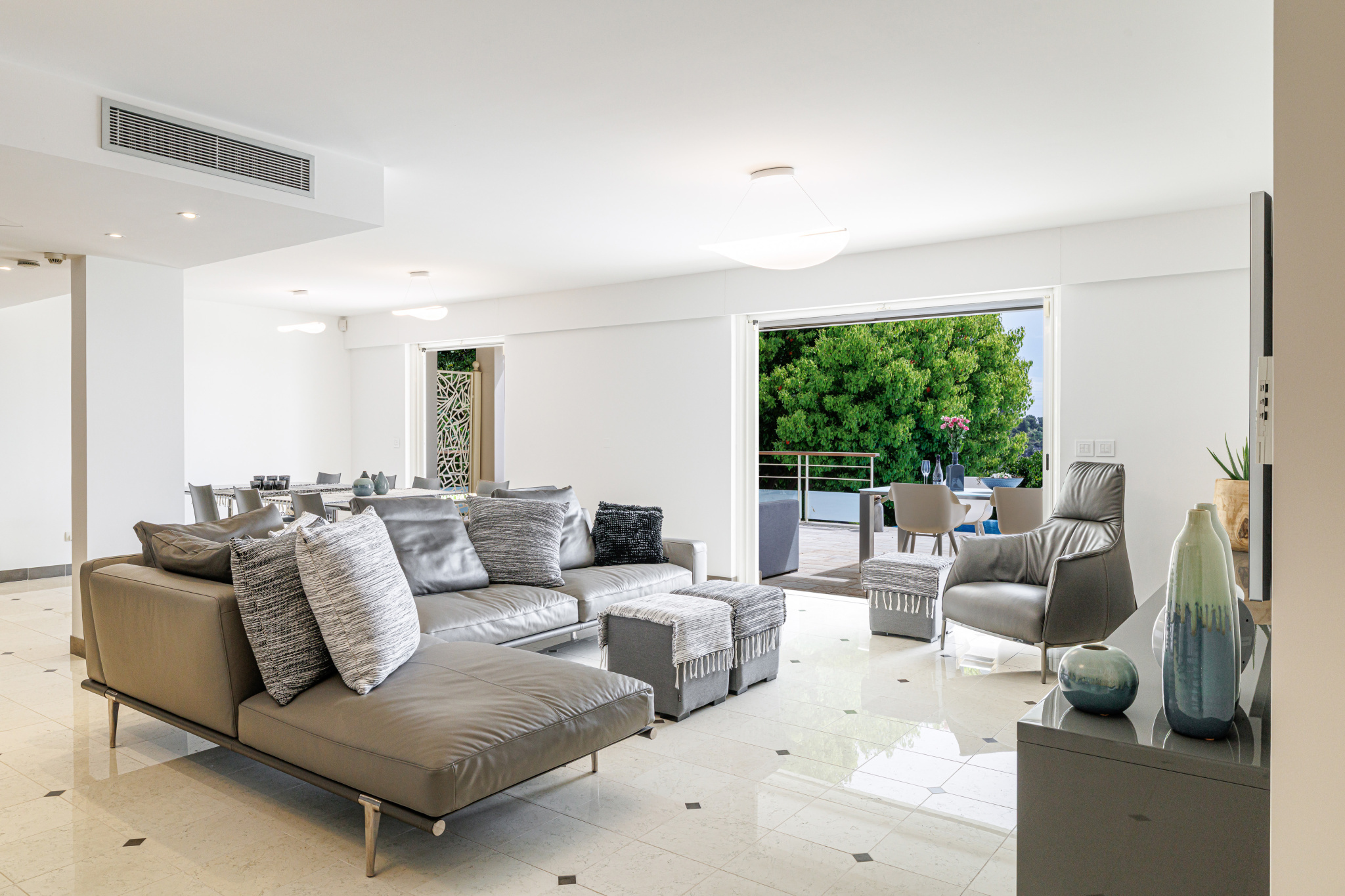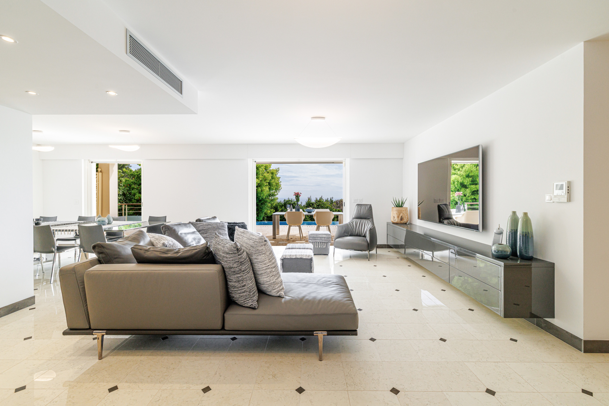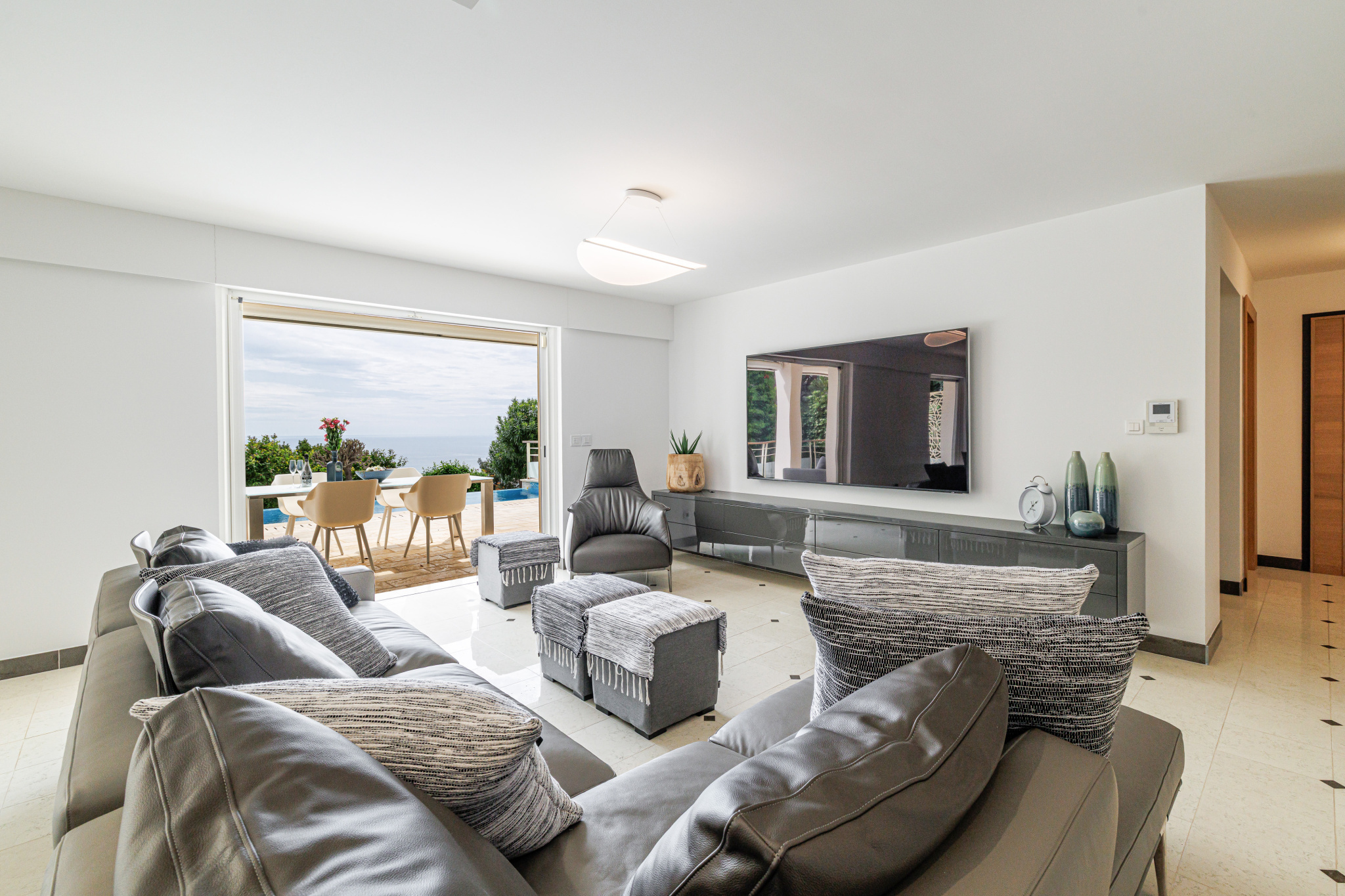 The villa opens onto a refined entrance leading to a vast, light-filled living room and generous dining area, designed for seamless indoor-outdoor living. A fully equipped designer kitchen completes this level, opening directly onto a spacious terrace and a stunning infinity pool overlooking the Mediterranean.