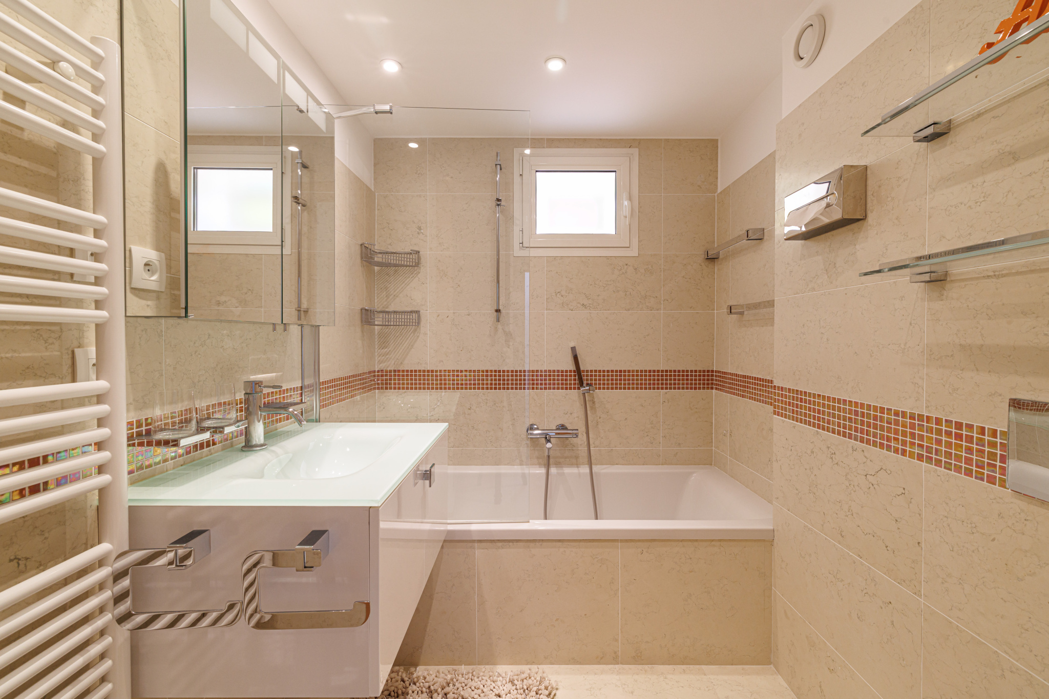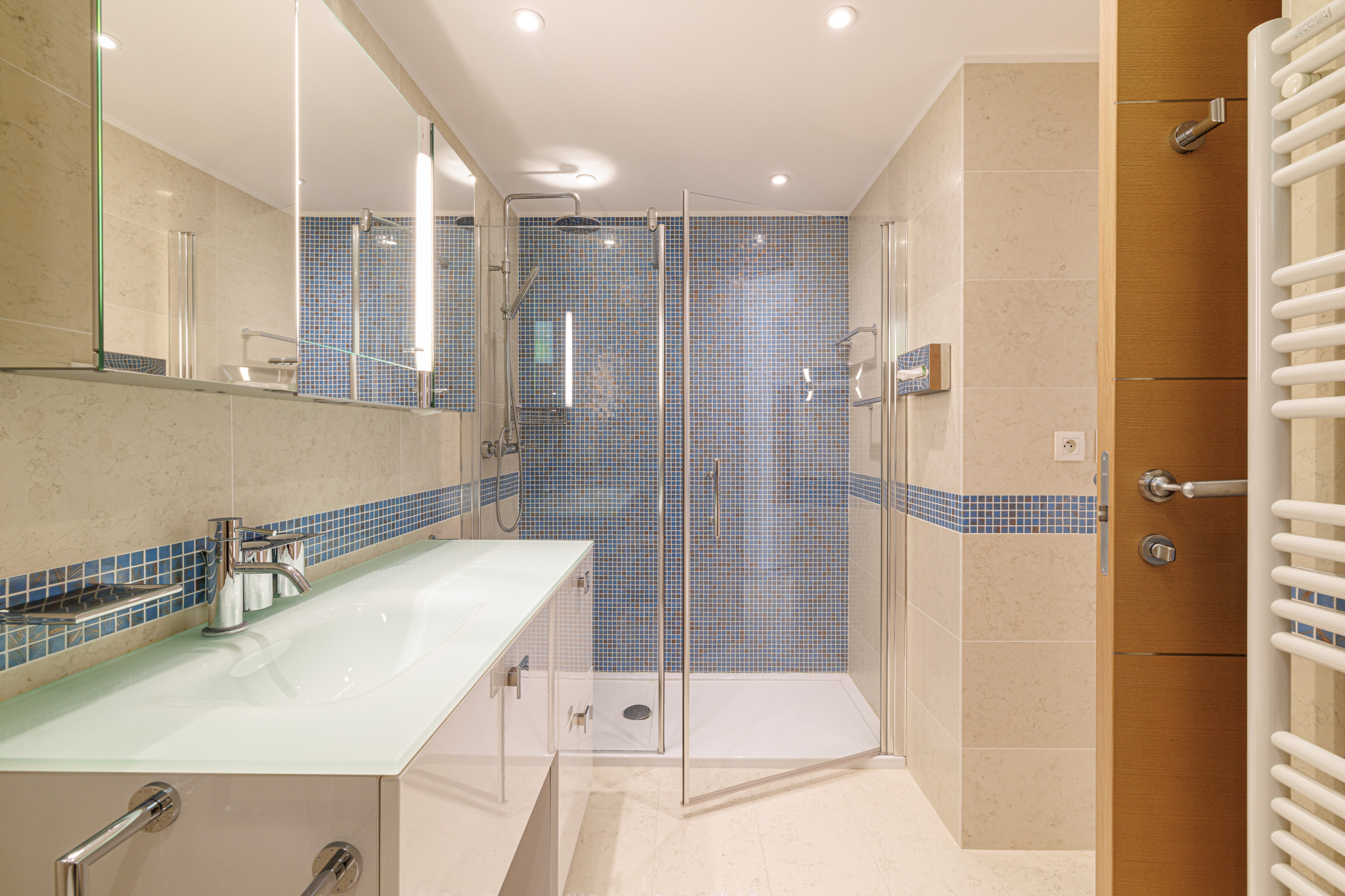 The upper floor features three elegant suites, each with its own dressing room, private shower room, and access to a large sun-drenched terrace.