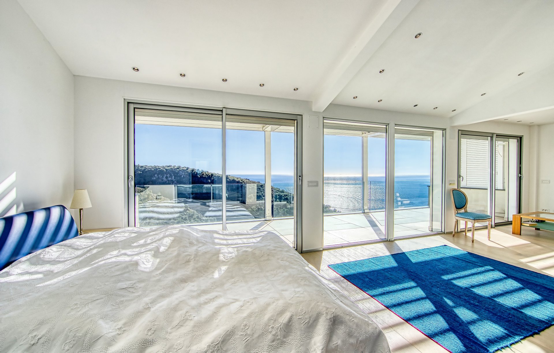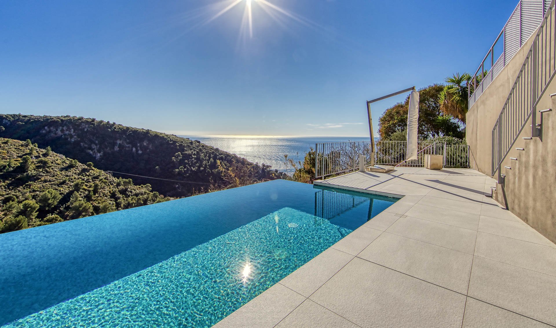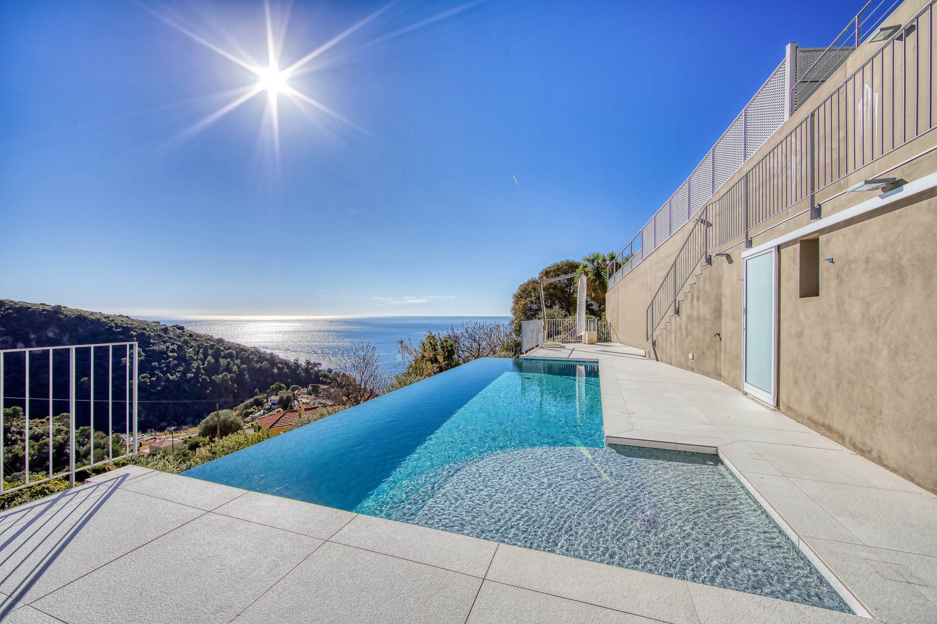 Quiet location and breathtaking sea views for this luxury contemporary villa newly renovated close to Monaco and divided onto 3 floors served by an elevator as follows: