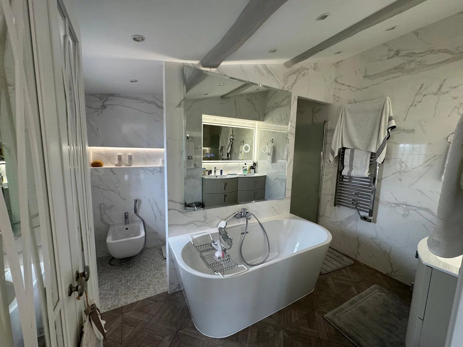 The main house welcomes you with a spacious living and dining area that opens onto a sun-drenched terrace, perfect for savoring the breathtaking sea and village views. A vast, fully fitted kitchen enhances the convivial atmosphere, while the elegant master suite offers a luxurious retreat with its full bathroom and dressing room. Two additional bedrooms, each with its own shower room, a guest WC, a large laundry room, and a pantry complete the main level.