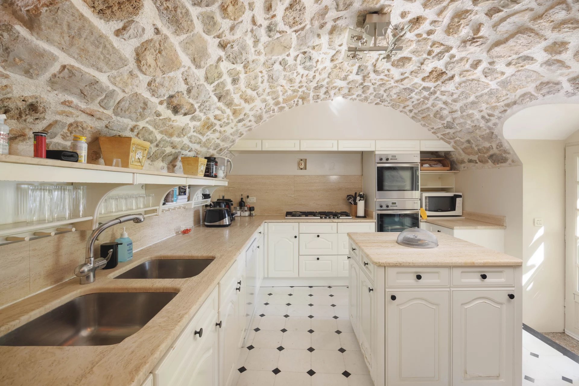 As soon as you enter, you are immediately immersed in history, surrounded by exposed stonework and vaulted ceilings that give the villa its authentic charm. This character continues in the spacious living room and bedrooms.