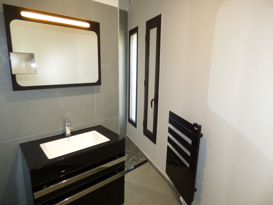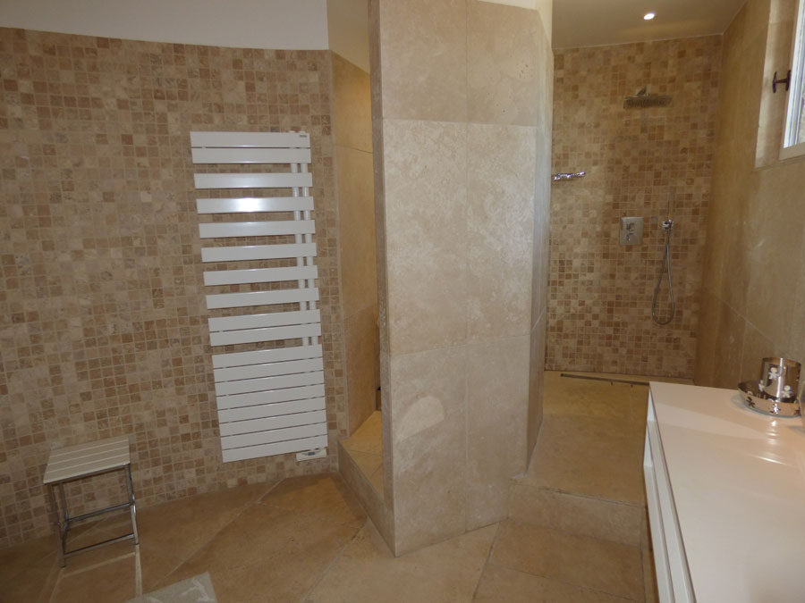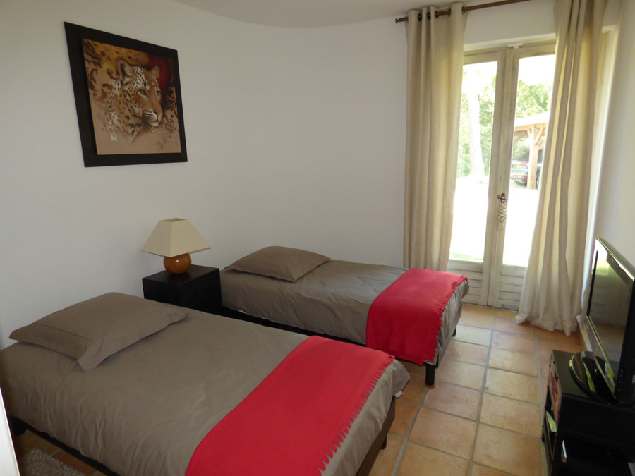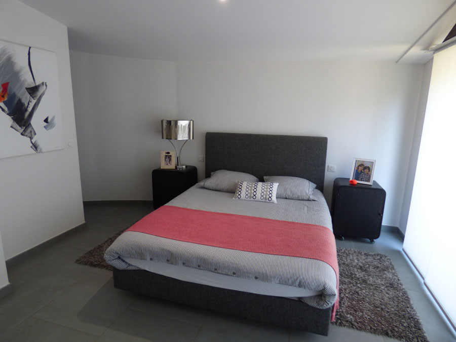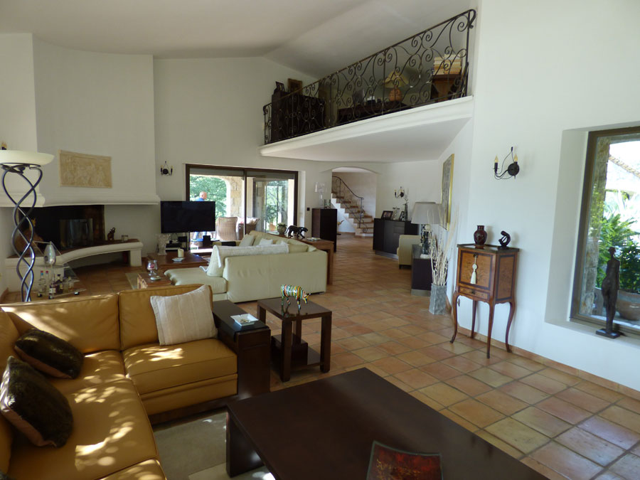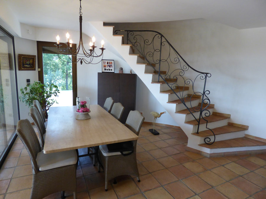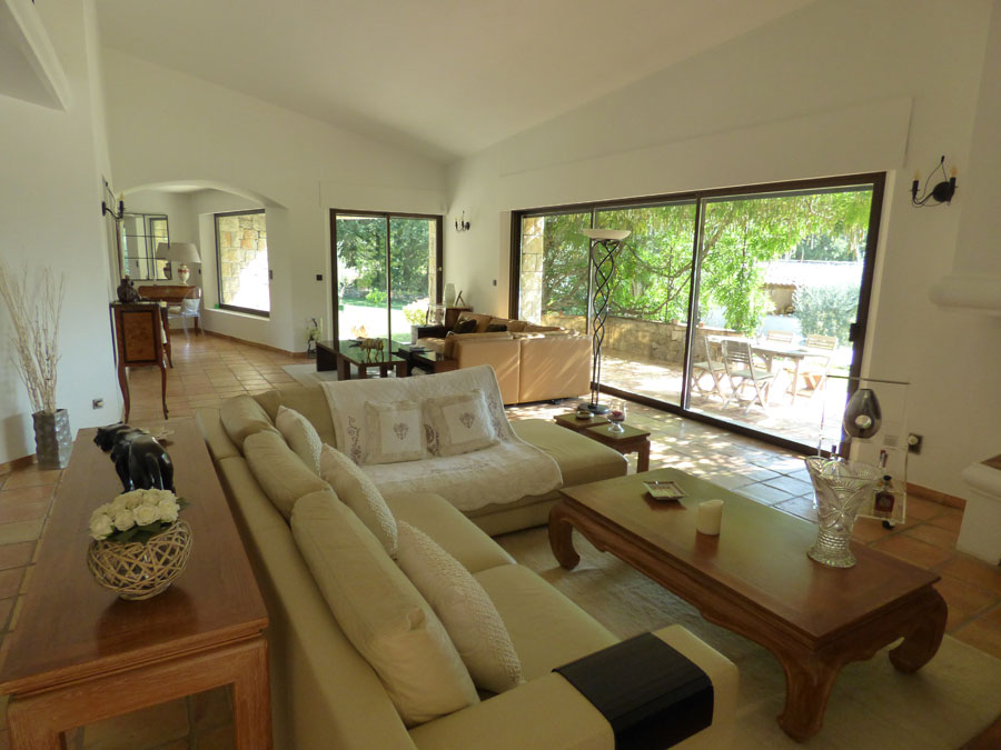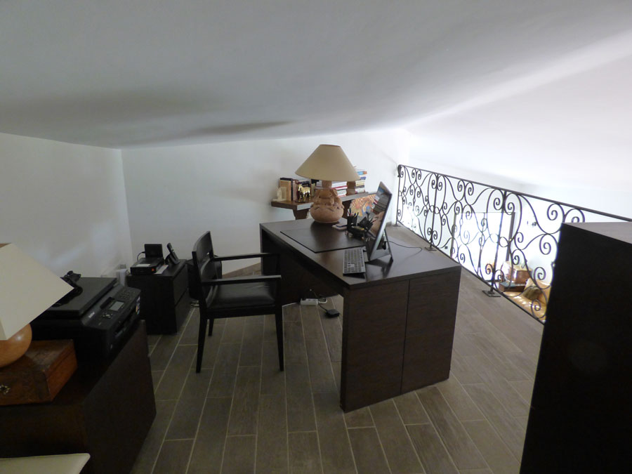 Entrance hall, separate toilet, two bedrooms (each 12m2), shower room, living room (80m2) with fireplace leading to a terrace, fitted kitchen opening onto the dining room (20m2) leading to a covered terrace, utility room, separate toilet; One bedroom (25m2) + shower room. Upstairs: one bedroom (25m2), bathroom + shower, mezzanine/office.