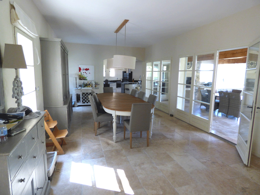 Entrance hall, powder room, fitted American kitchen + utility room, dining room opening onto a large covered terrace with barbecue, living room with fireplace, master bedroom with bathroom and dressing room, separate toilet, lounge with an interior Courtyard, access to a double garage + workshop.