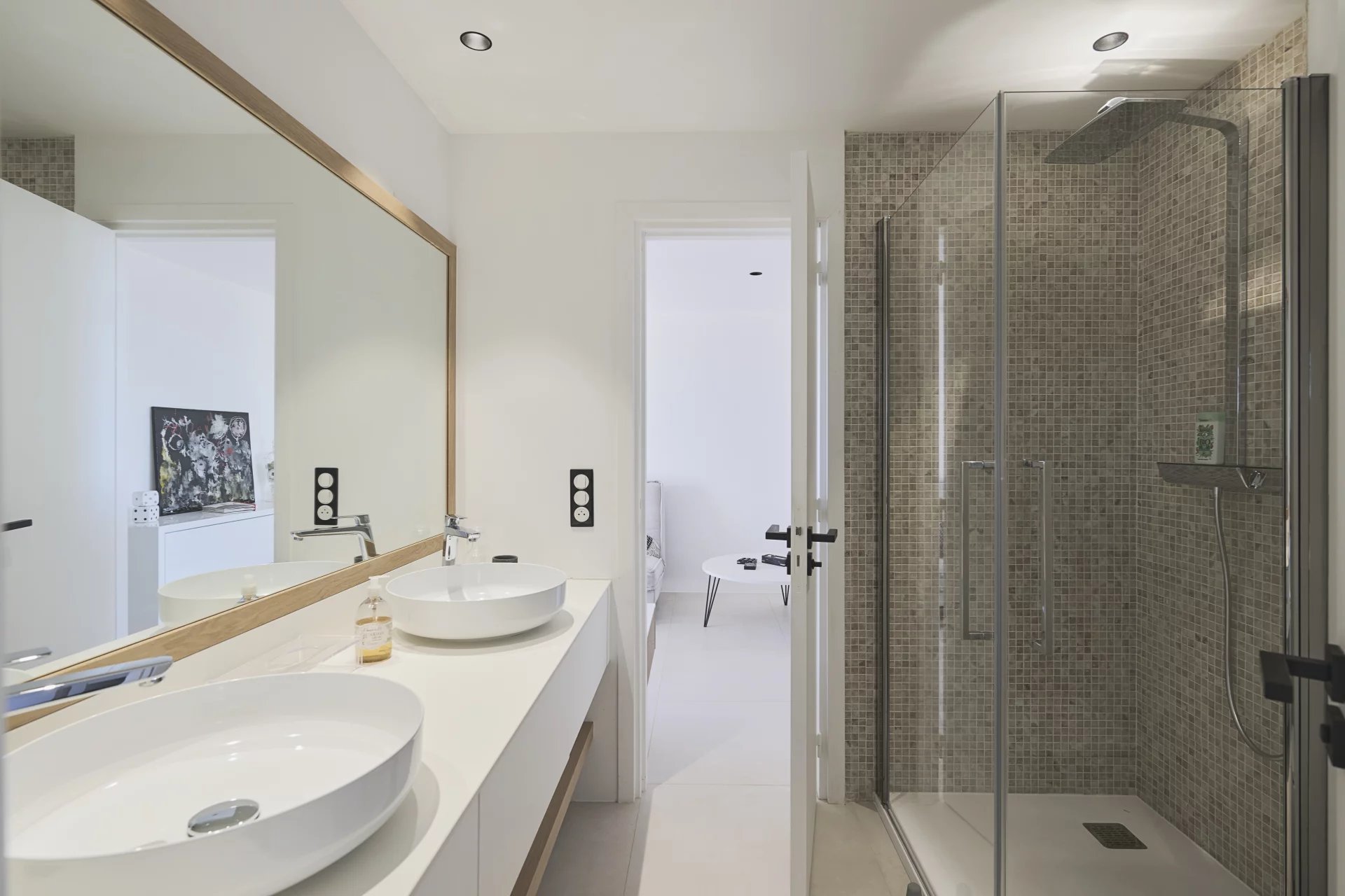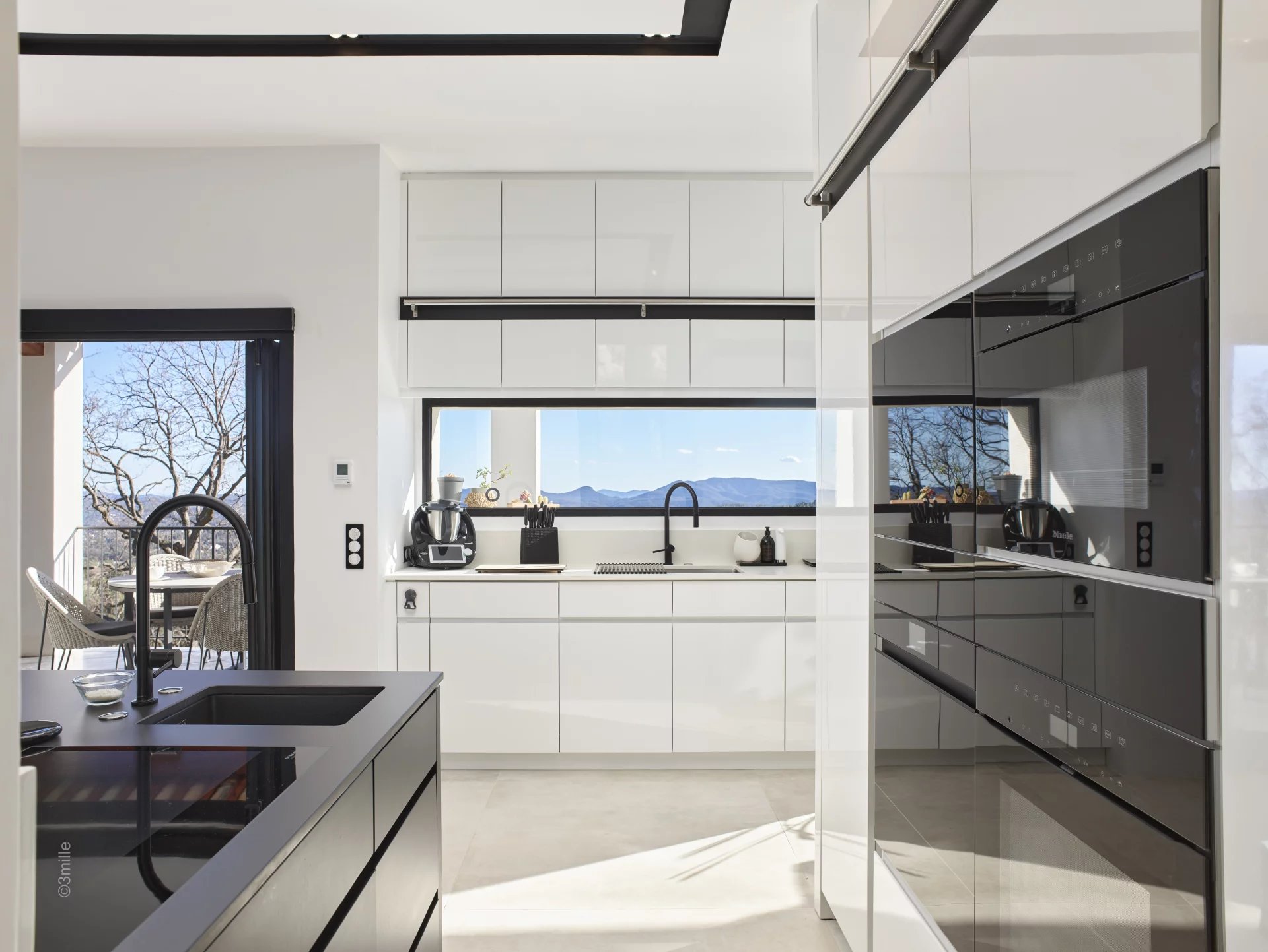 The main residence, spread over three levels, expertly combines modernity and traditional style in its design. The living room-dining room, complete with an American kitchen, offers a magnificent space with a sloping ceiling that extends onto a terrace. The lower level includes a master suite, two bedrooms with en-suite bathrooms, and an artist’s workshop. The house also features a large office, laundry room, cellar, and garage for four vehicles.