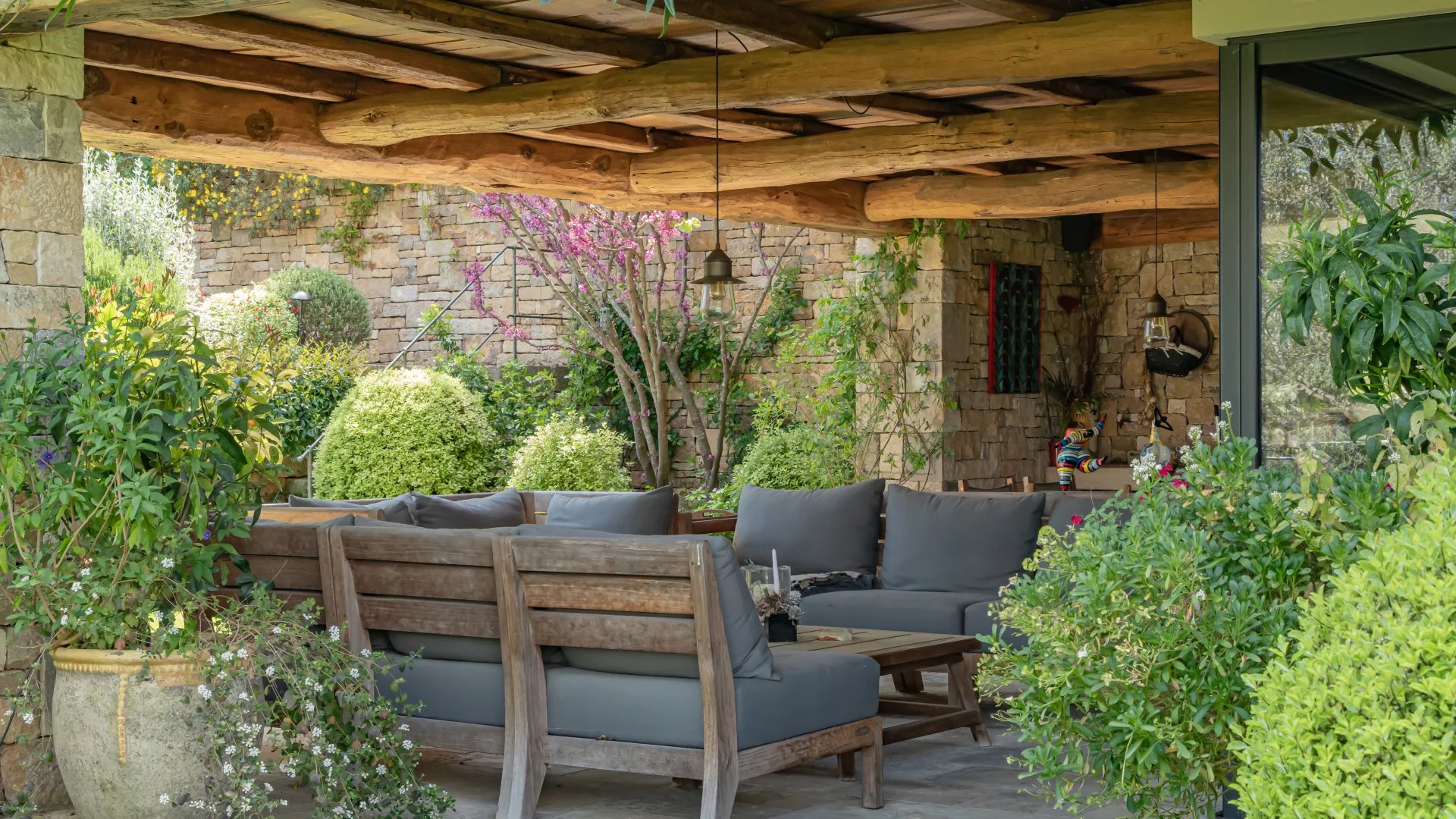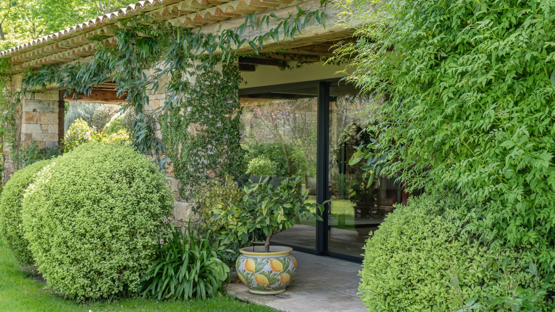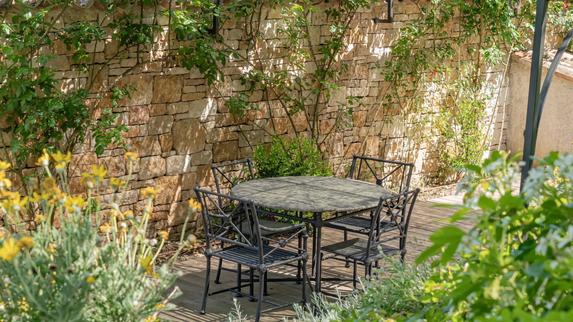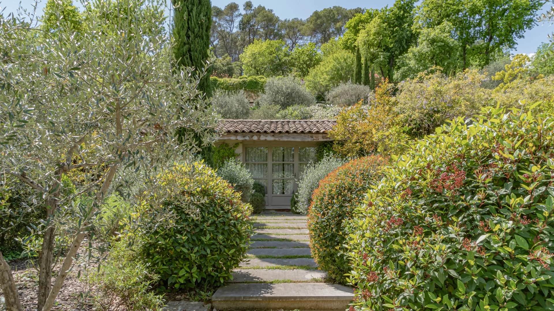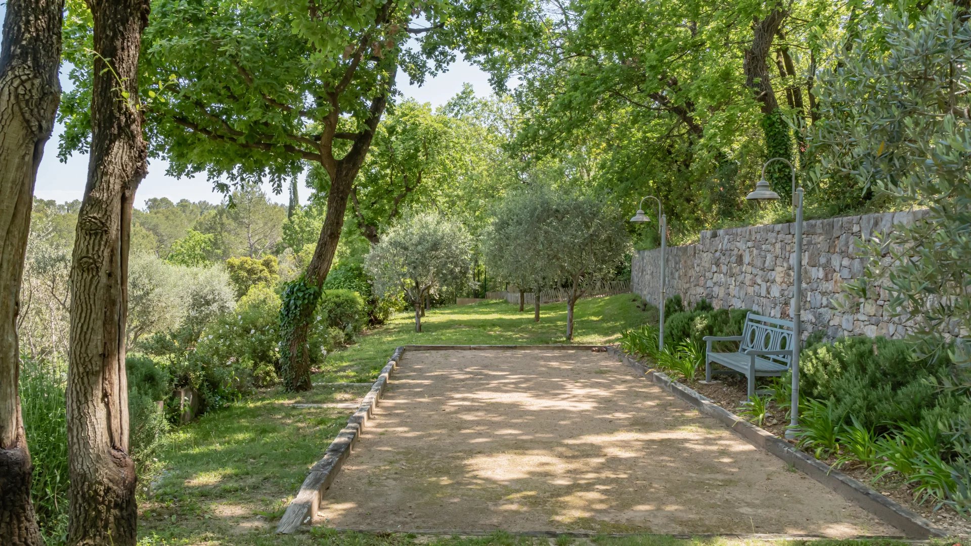 The exterior rivals in elegance: an 18-metre-long swimming pool, a 20 m2 pool house, several terraces, a pétanque court, a golf practice range on the roof, ponds, a vegetable garden and a sumptuous Mediterranean garden designed by a landscape architect, featuring century-old olive trees, fruit trees, aromatic plants and flower essences.