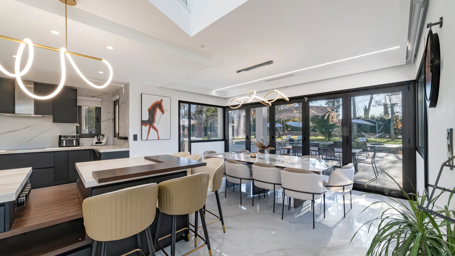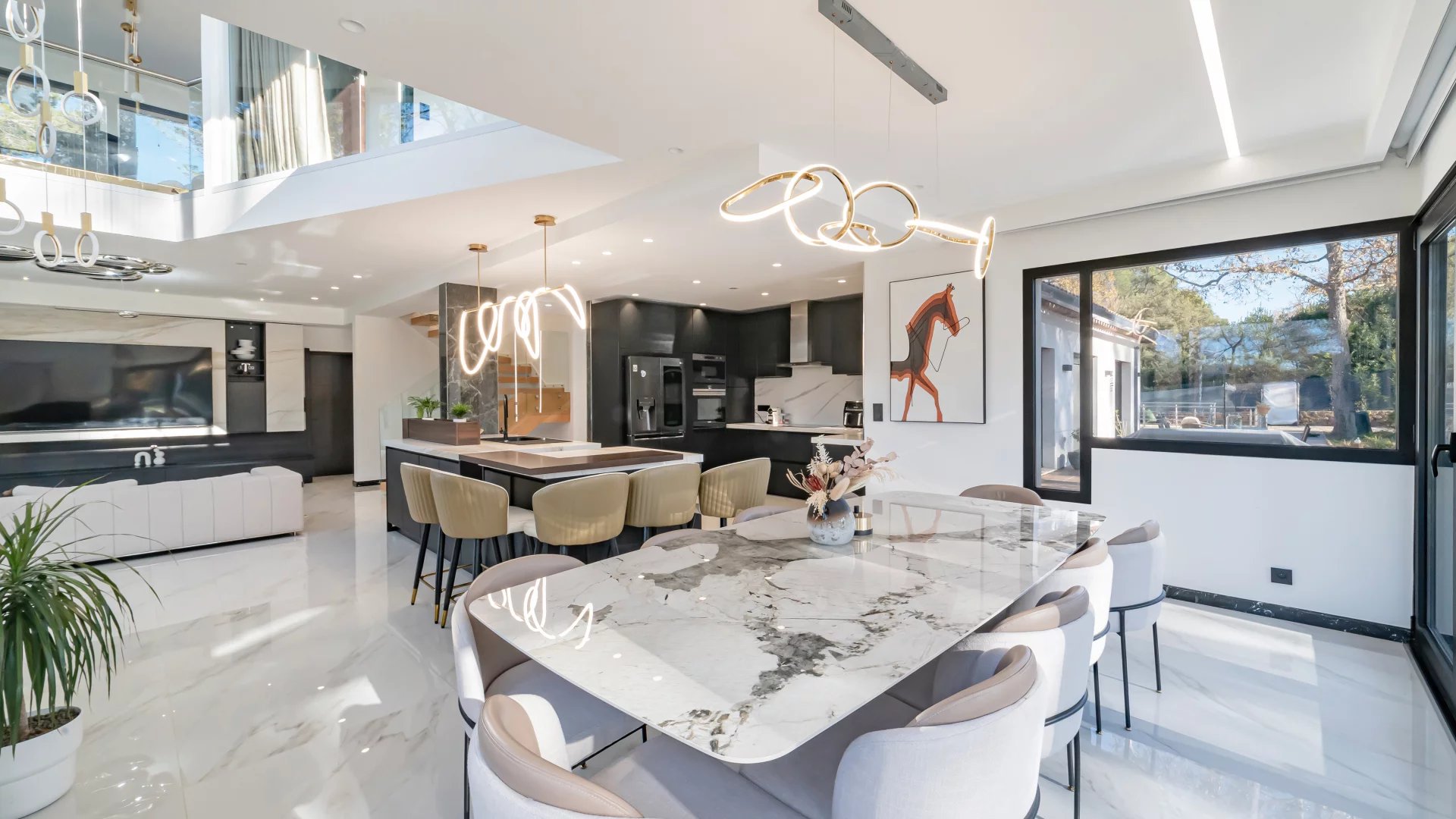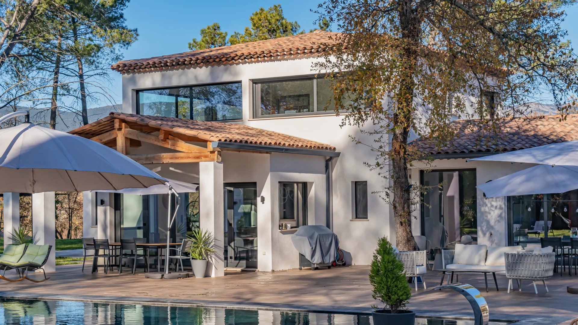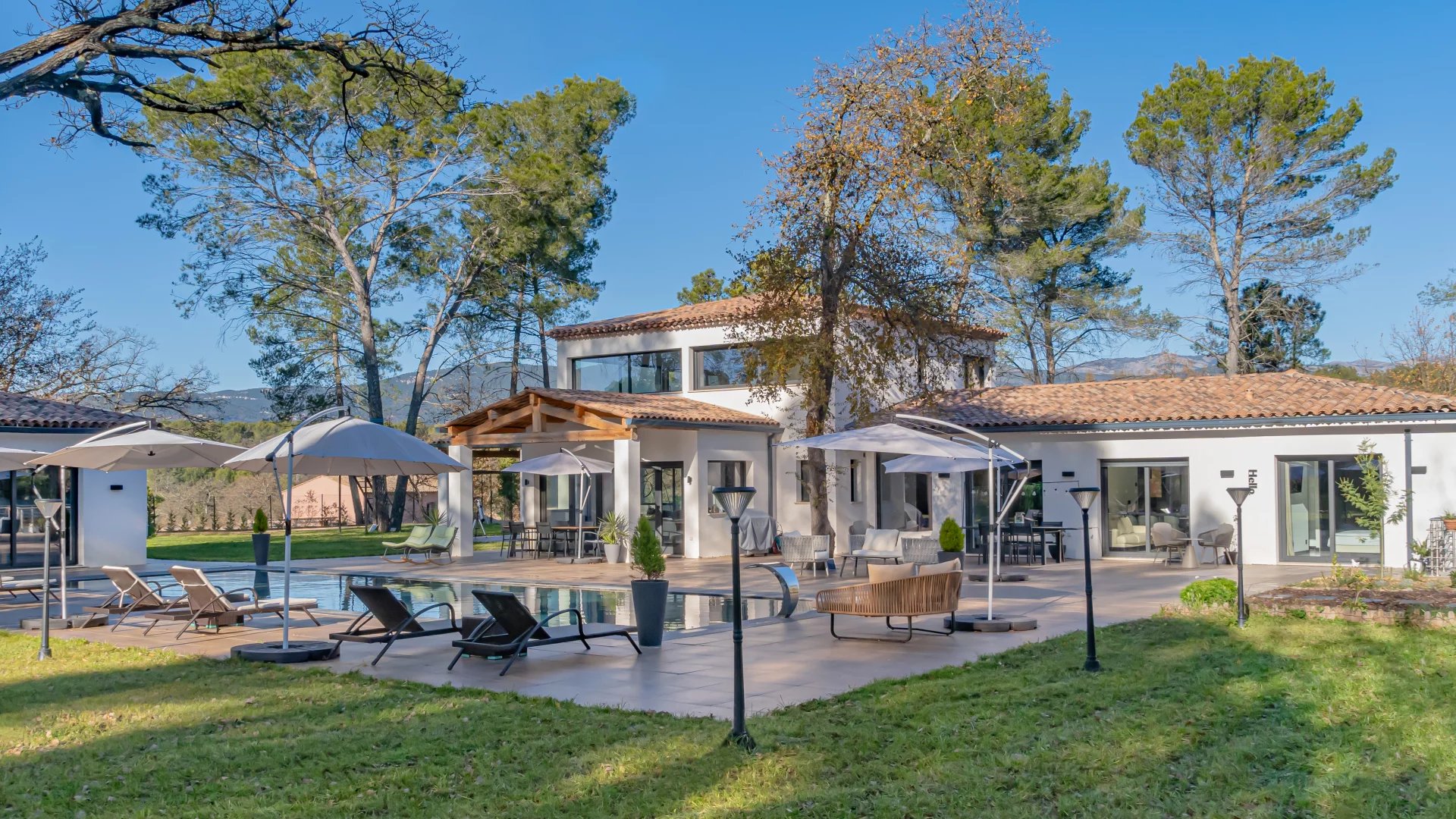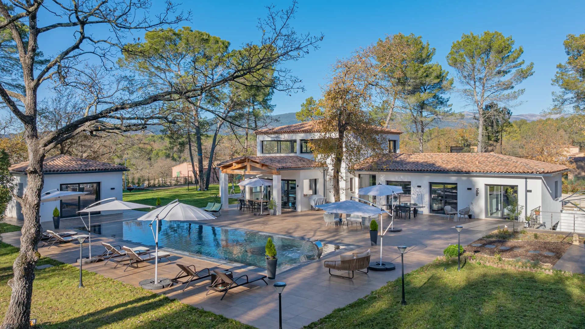 In a quiet residential area close to the Terre Blanche estate, architect-designed villa built in 2023 offering 370 m2 living space on a 4200 m2 flat plot.
