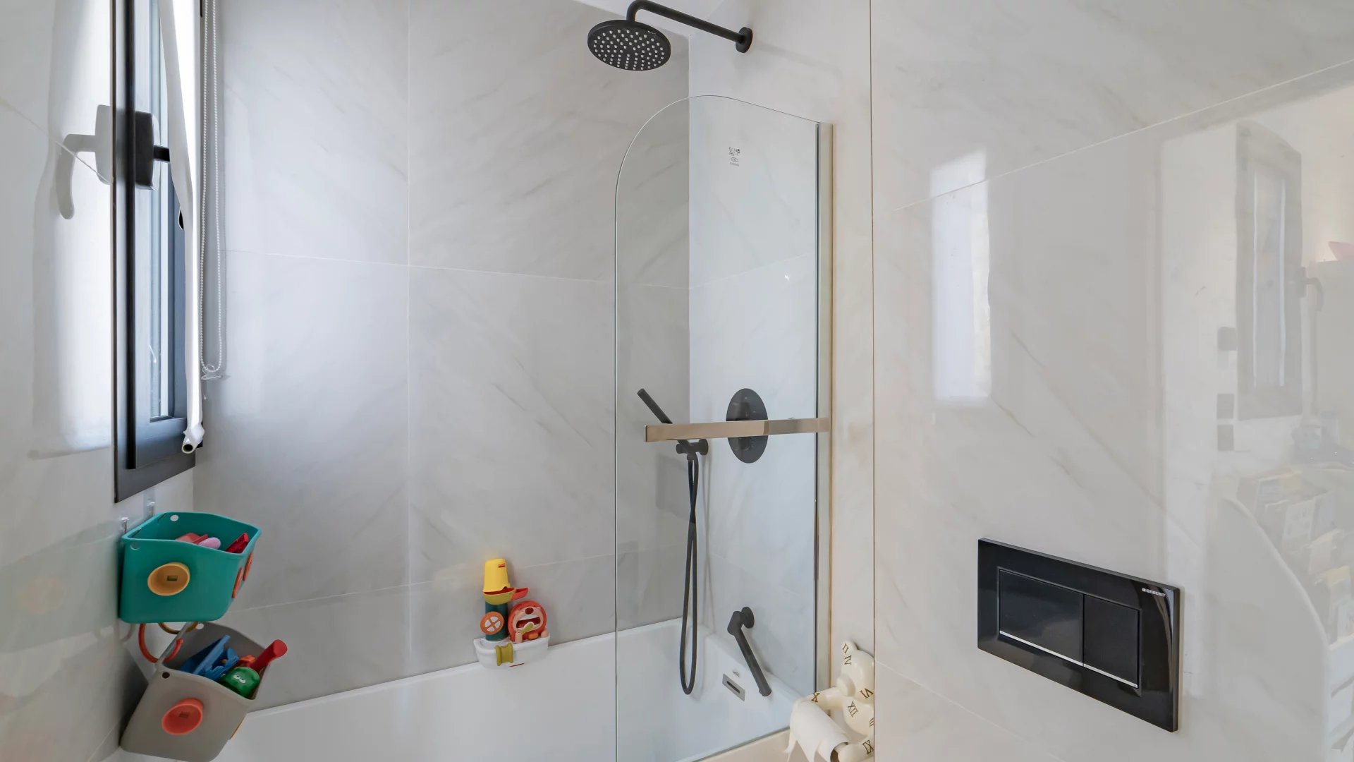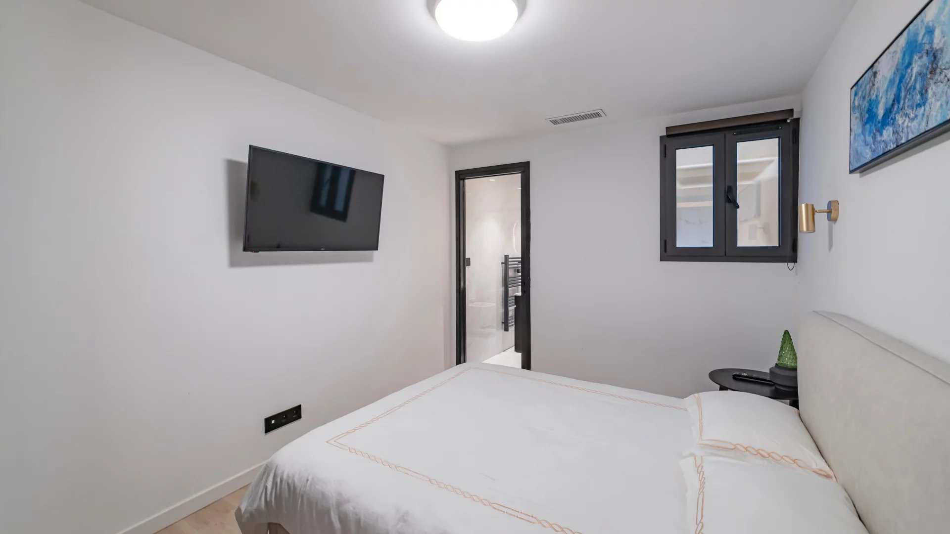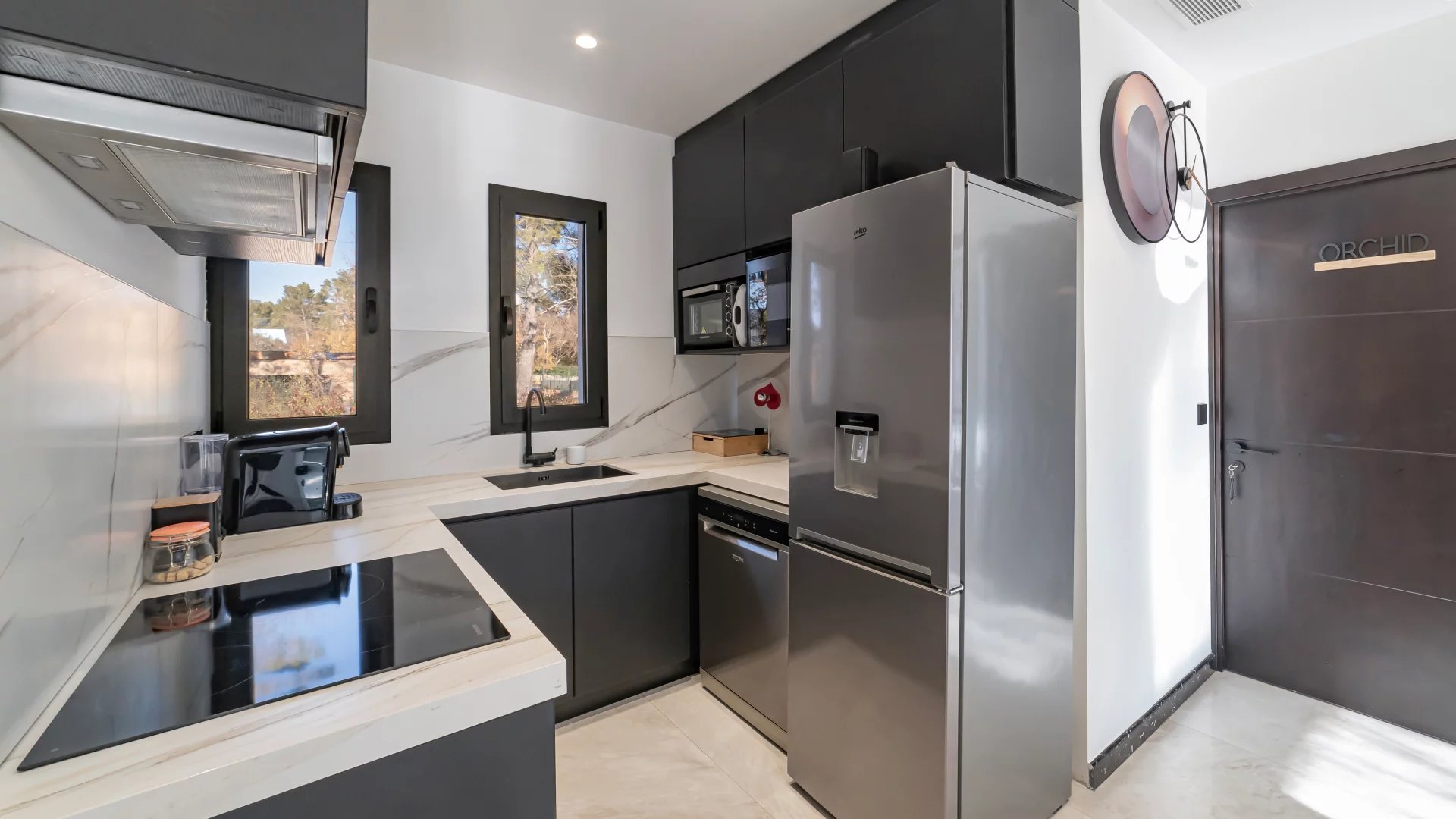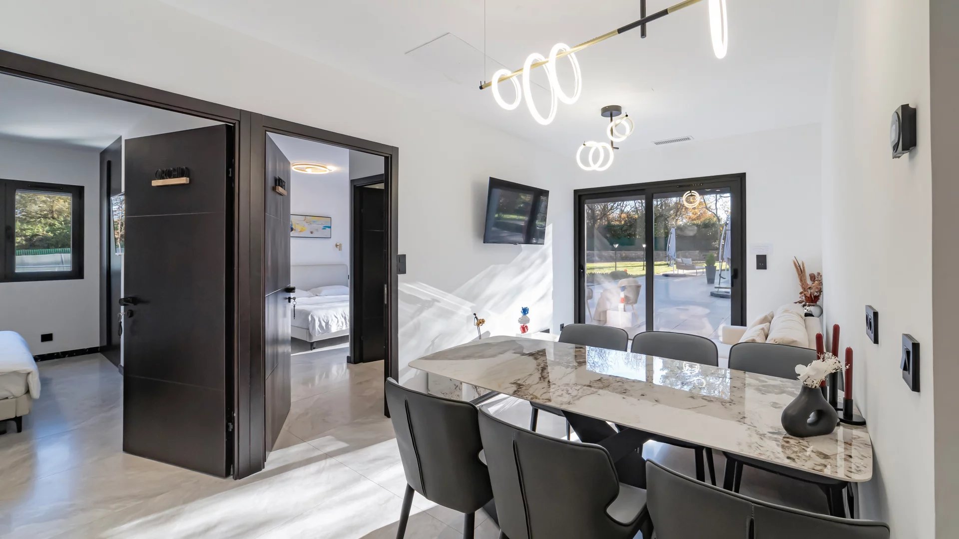 The villa is composed of two parts, which separate at the entrance. On one side you’ll find 3 bedrooms with their own shower rooms, as well as a living area and kitchen.