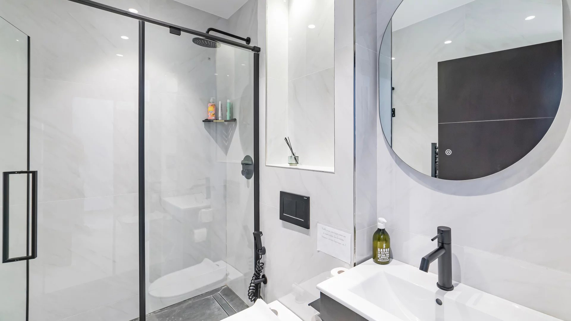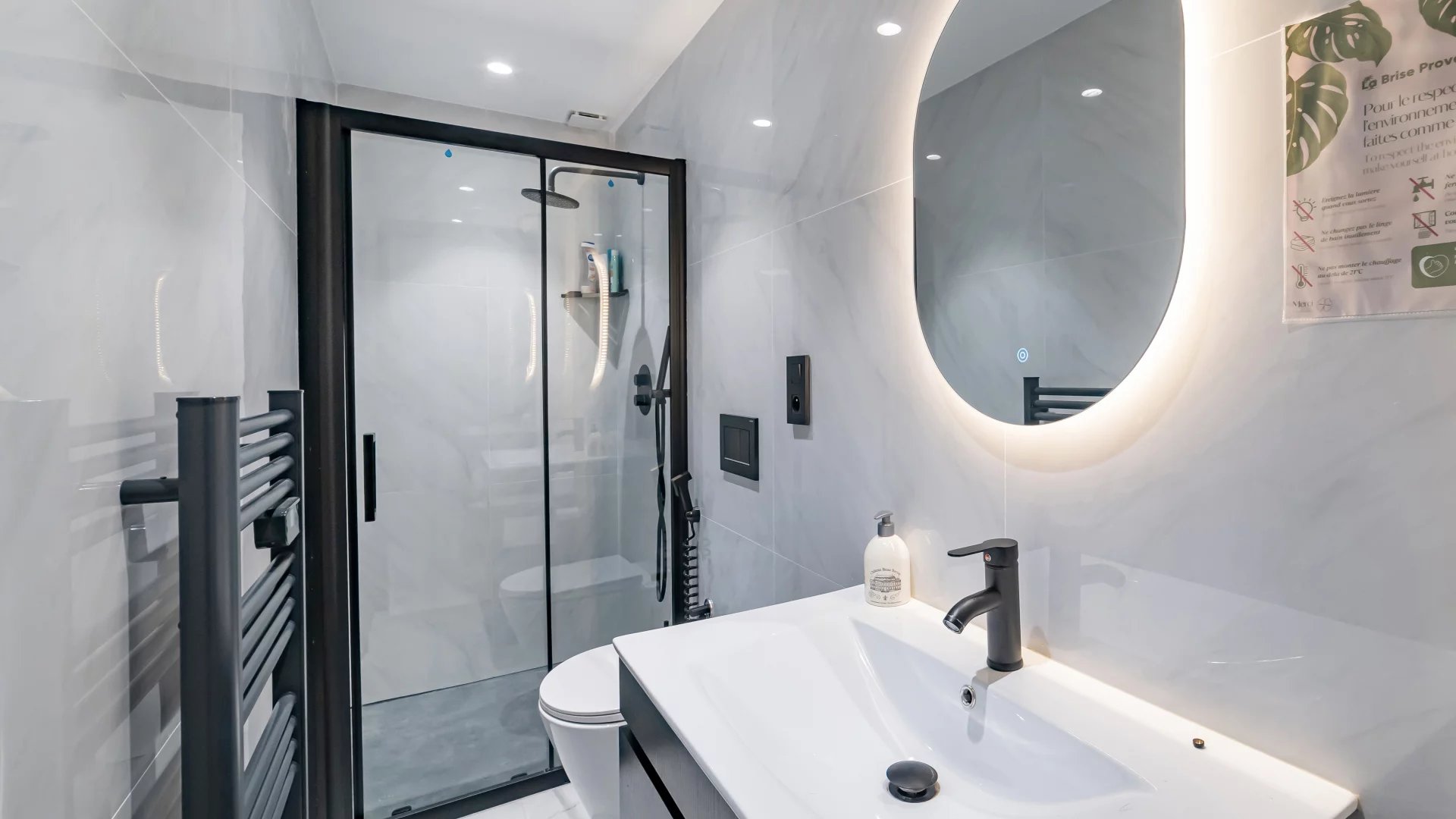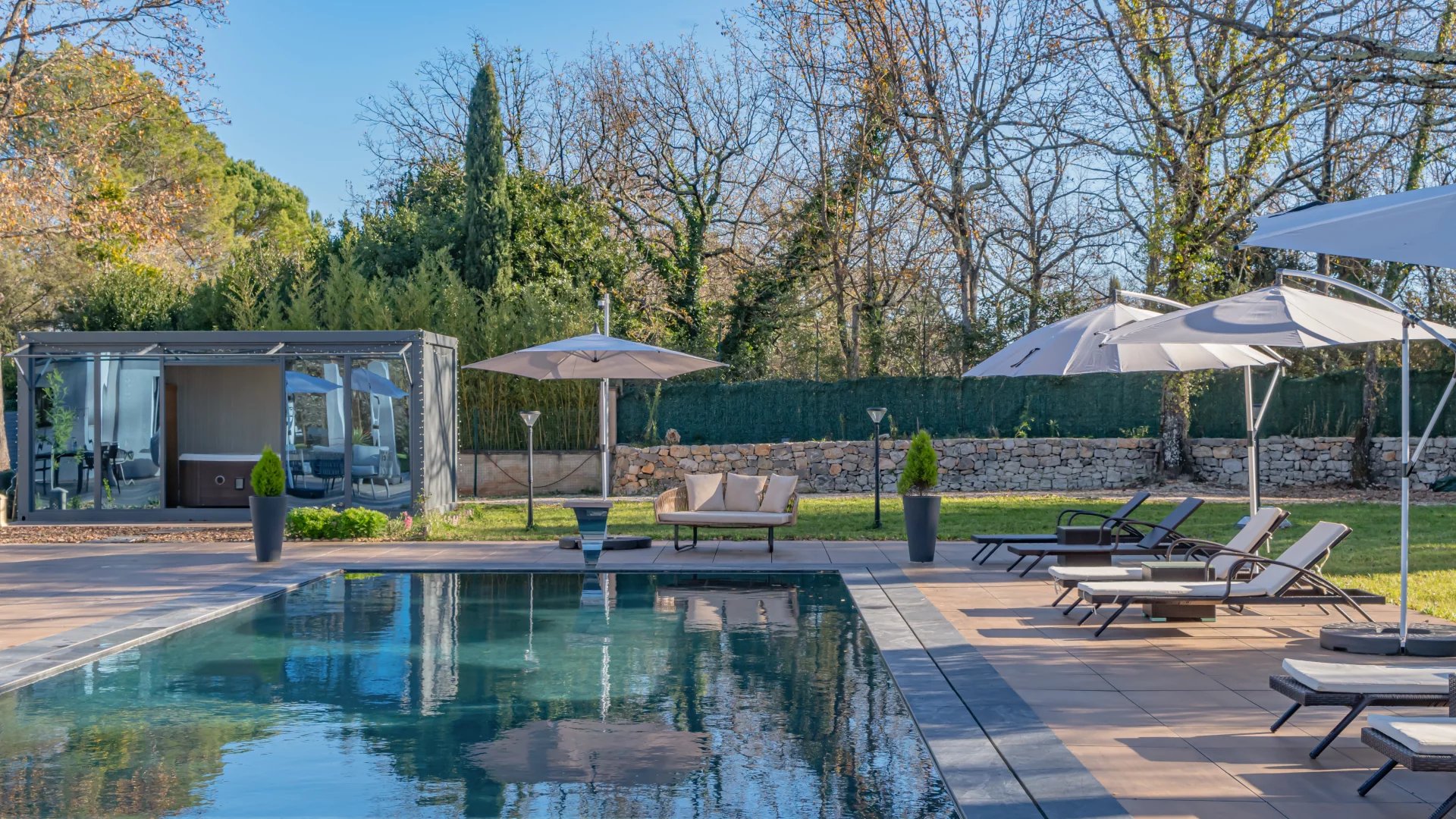 On the other side, the main part comprises a large reception area with a living room, dining room and kitchen equipped with quality materials and opening onto a covered terrace. On the same level, a bedroom with en-suite shower room.