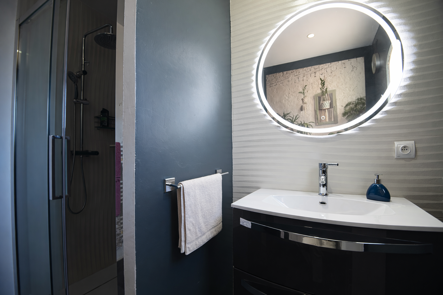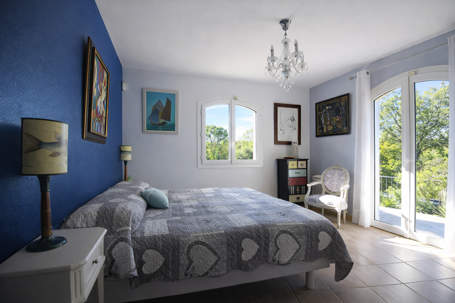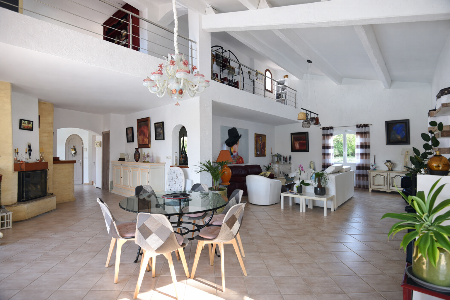 Upstairs, the mezzanine overlooks the living area and leads to a patio, two additional large suites with shower rooms, one of which benefits from a private terrace and a walk-in dressing room, as well as a separate WC. A double garage with workshop, laundry room, and cellar completes the outbuildings.