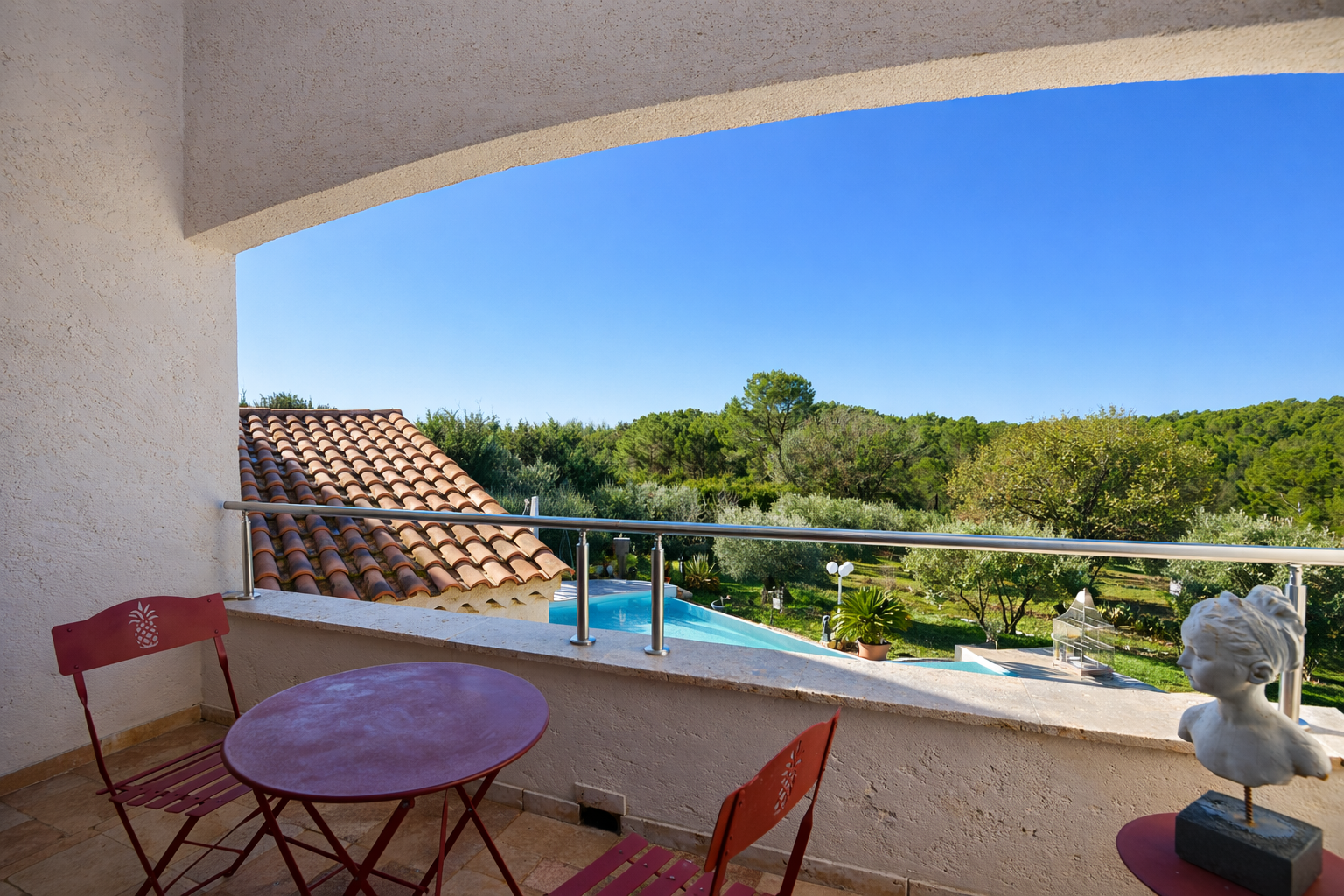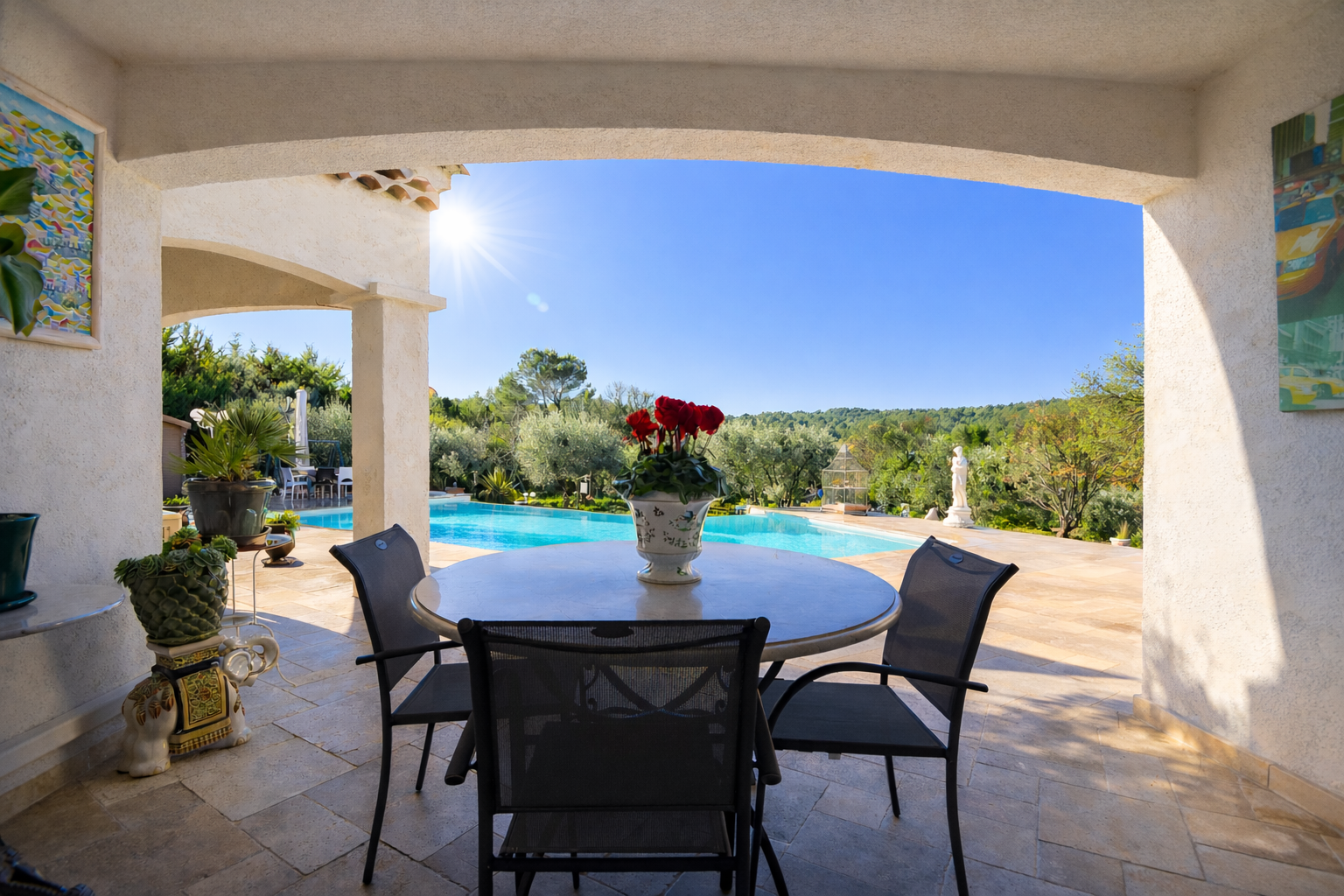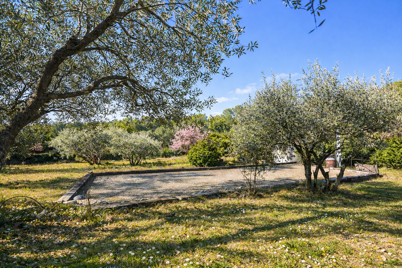Outside, a petanque court and two wooden chalets further enhance the ancillary spaces. Beautiful travertine terraces, both covered and uncovered, surround the villa and its infinity pool, inviting full enjoyment of the setting. The property is set on a fully enclosed plot of over 4,000 m2, attractively landscaped with Mediterranean species, offering a peaceful and well-kept environment. A pleasant parking area with automatic gate completes the features.