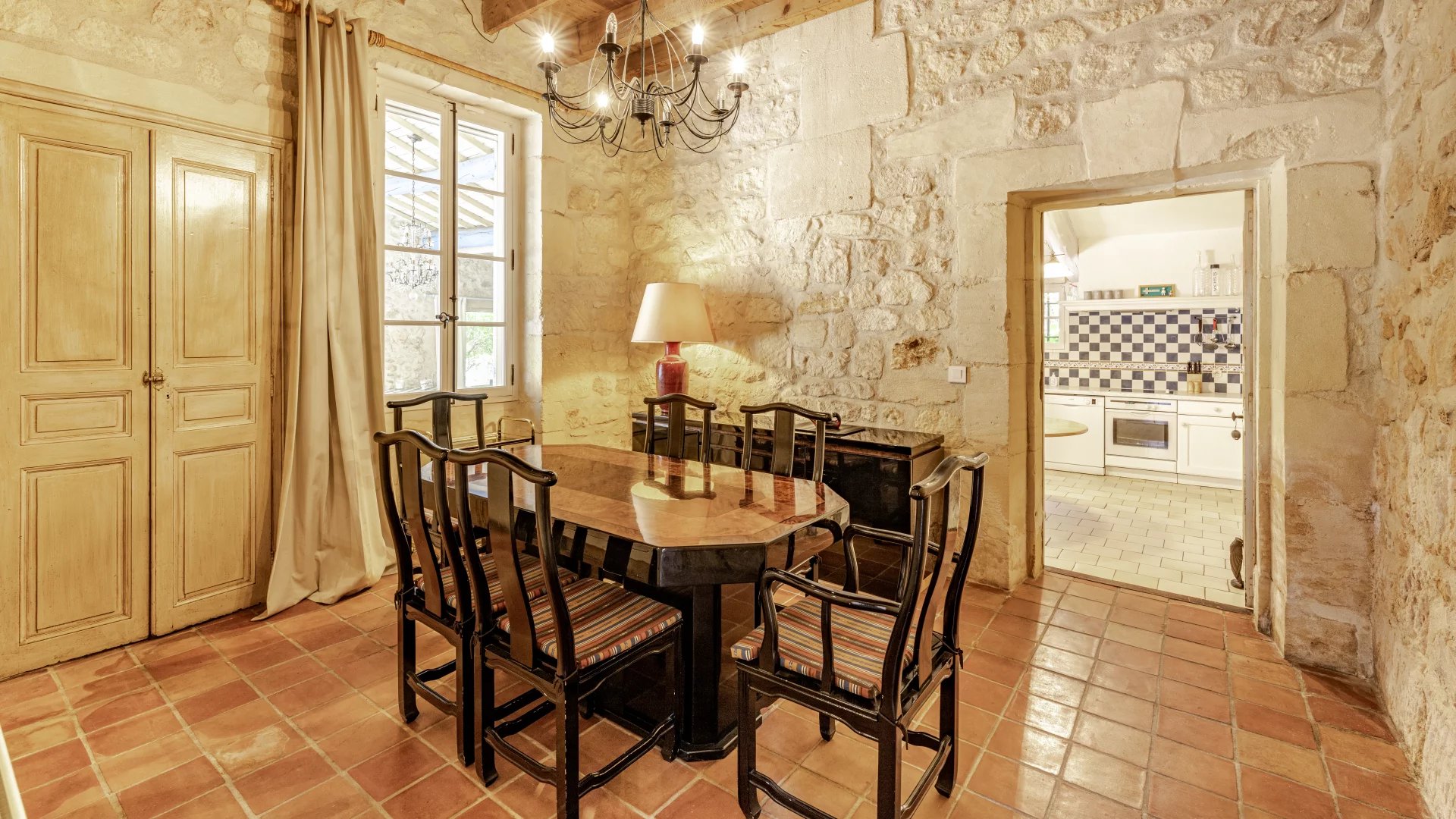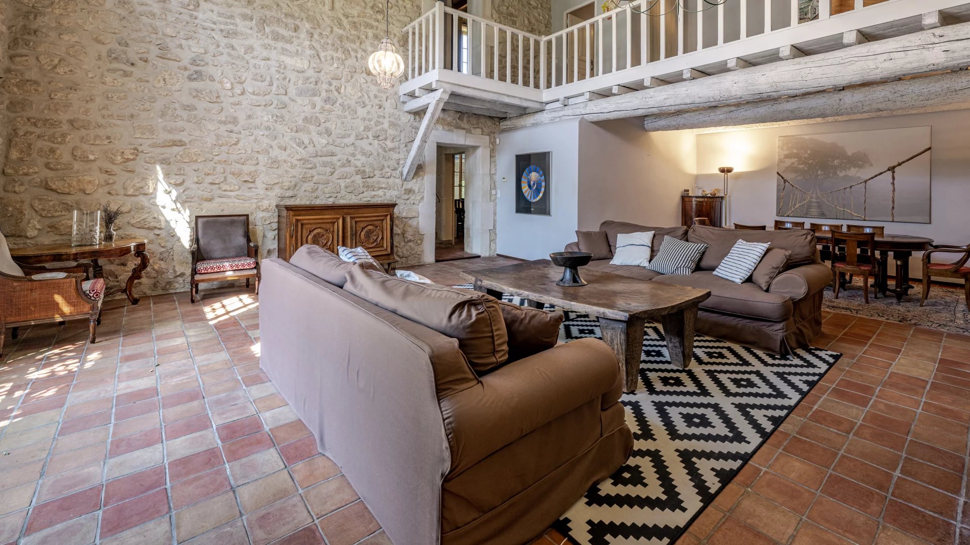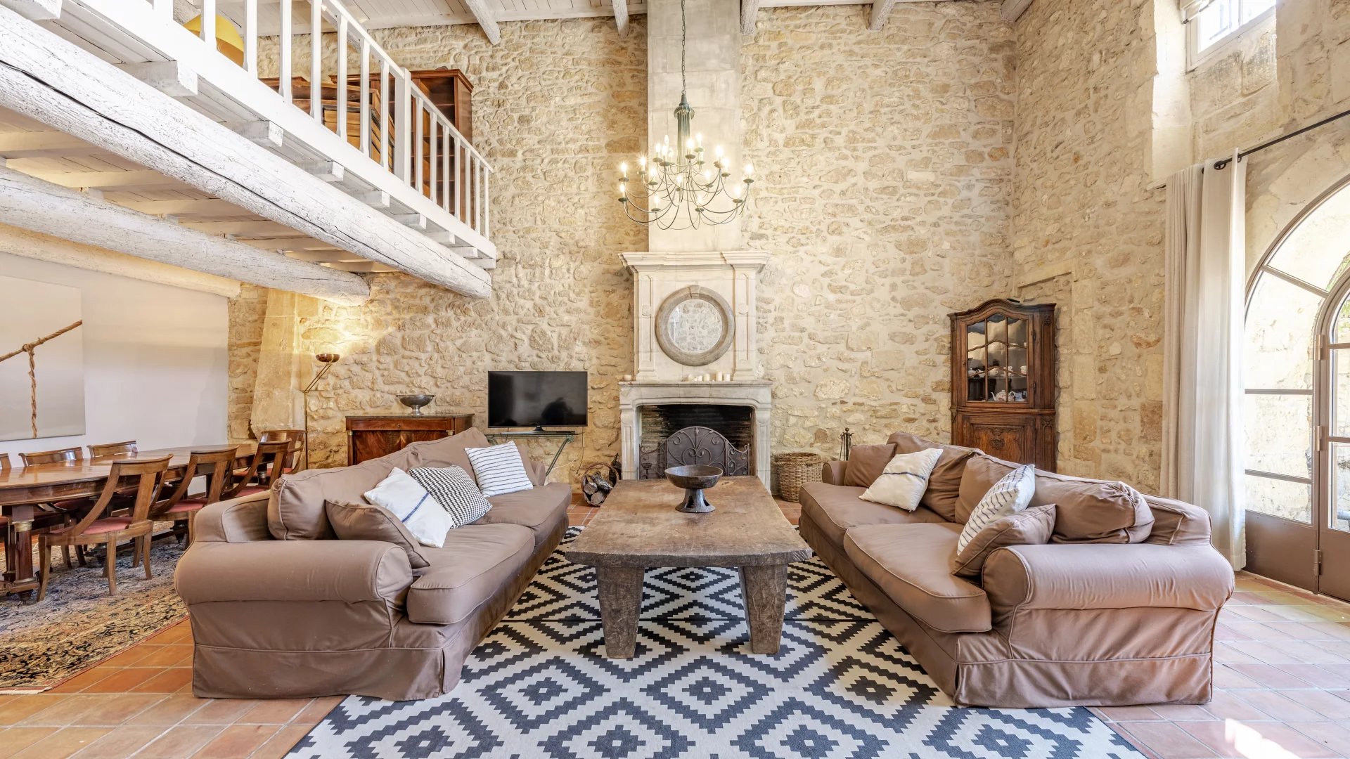 With a stone facade that makes an immediate impression and a living area of 285 m2 spread over 3 floors, the property offers generously proportioned accommodation throughout. The sitting room, with double-height ceiling, exposed beams and a magnificent stone fireplace, extends to around 64m2. Also on the ground floor is a spacious entrance hall, a large kitchen that opens into the dining room and a luminous winter salon.
