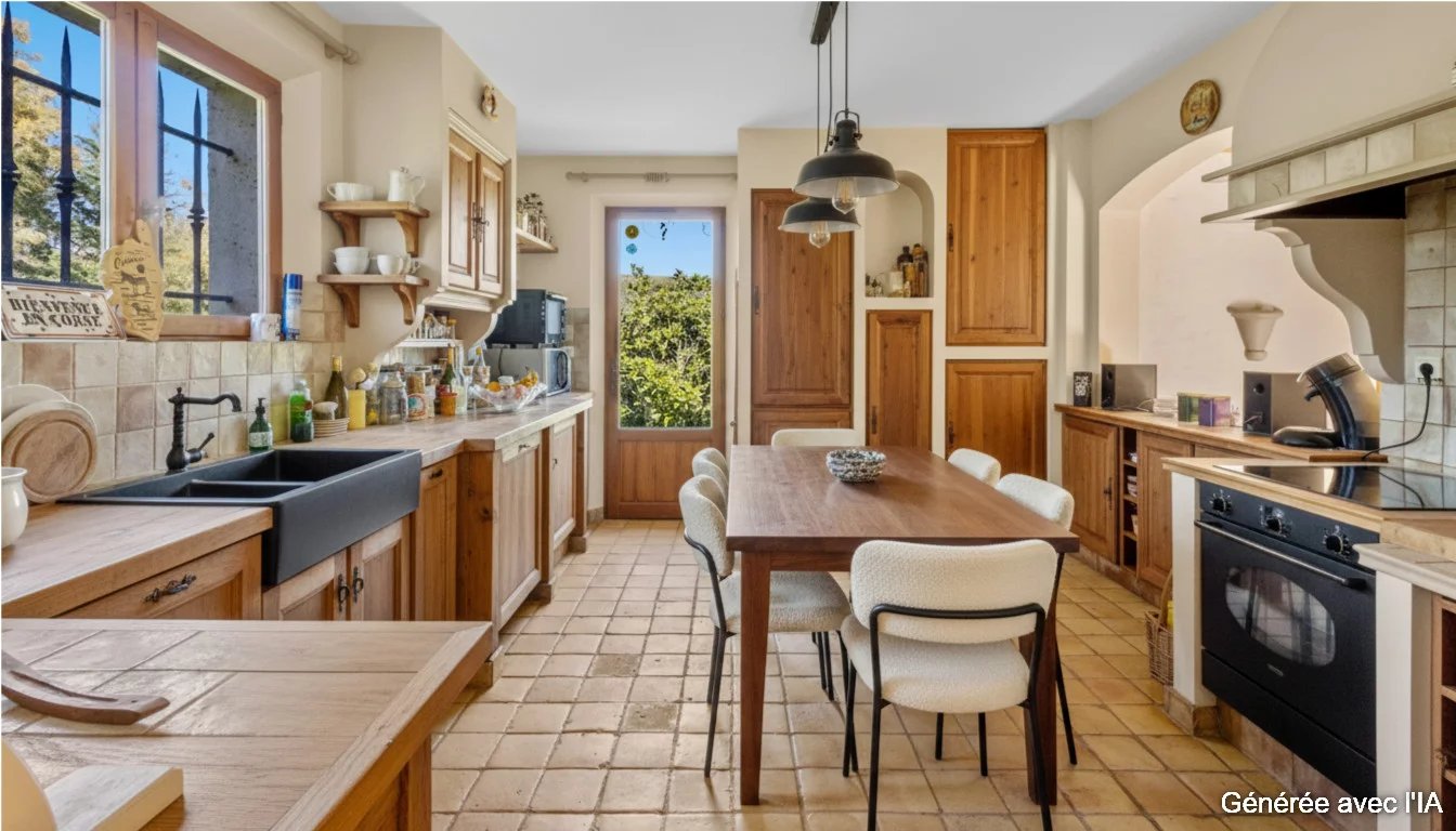 The villa features a living room with fireplace, a dining area, and a kitchen, as well as 7 bedrooms spread over two levels. It also includes 2 bathrooms, 1 shower room and 4 WCs, providing ample space for a large family or a hospitality project.