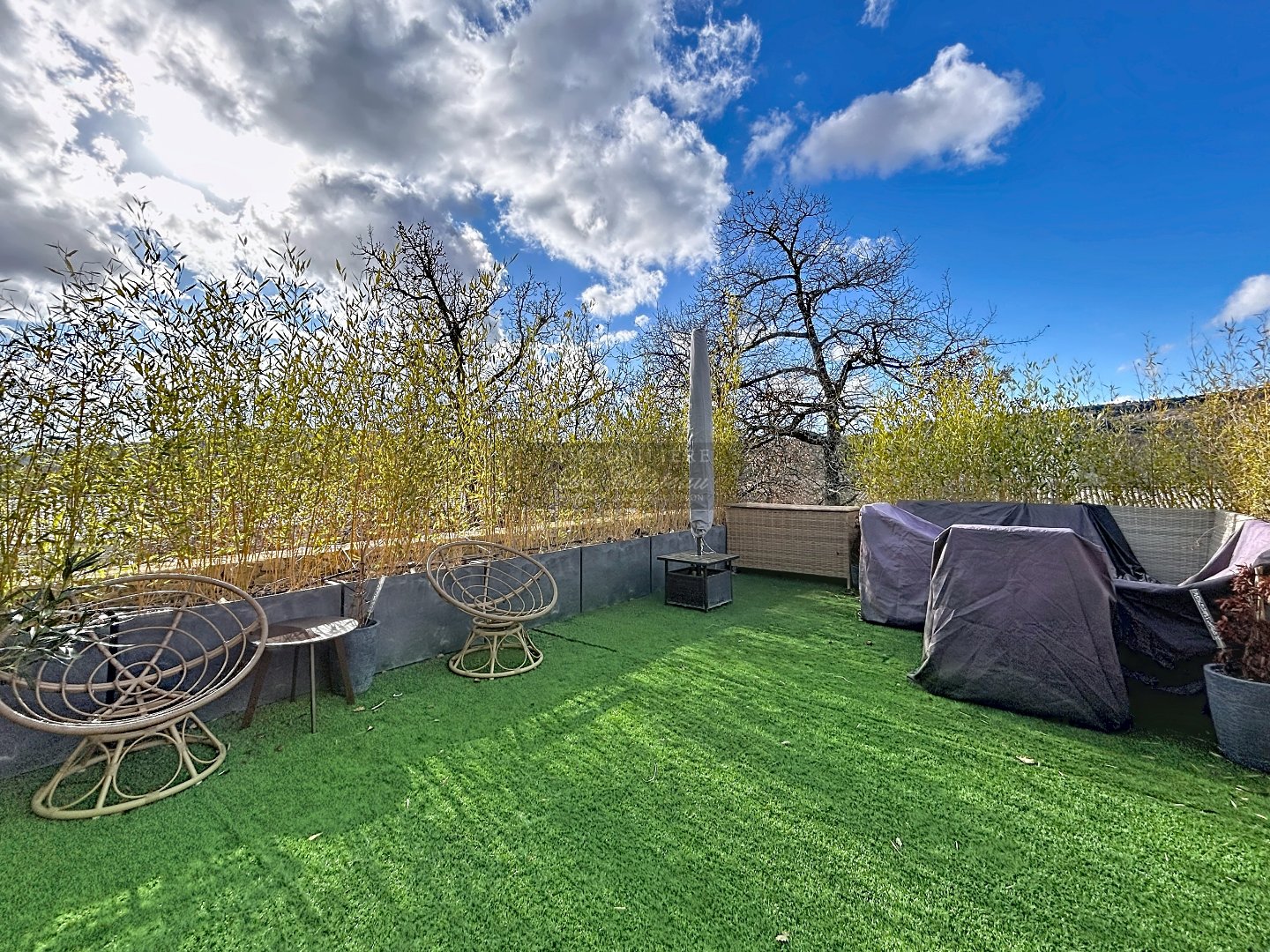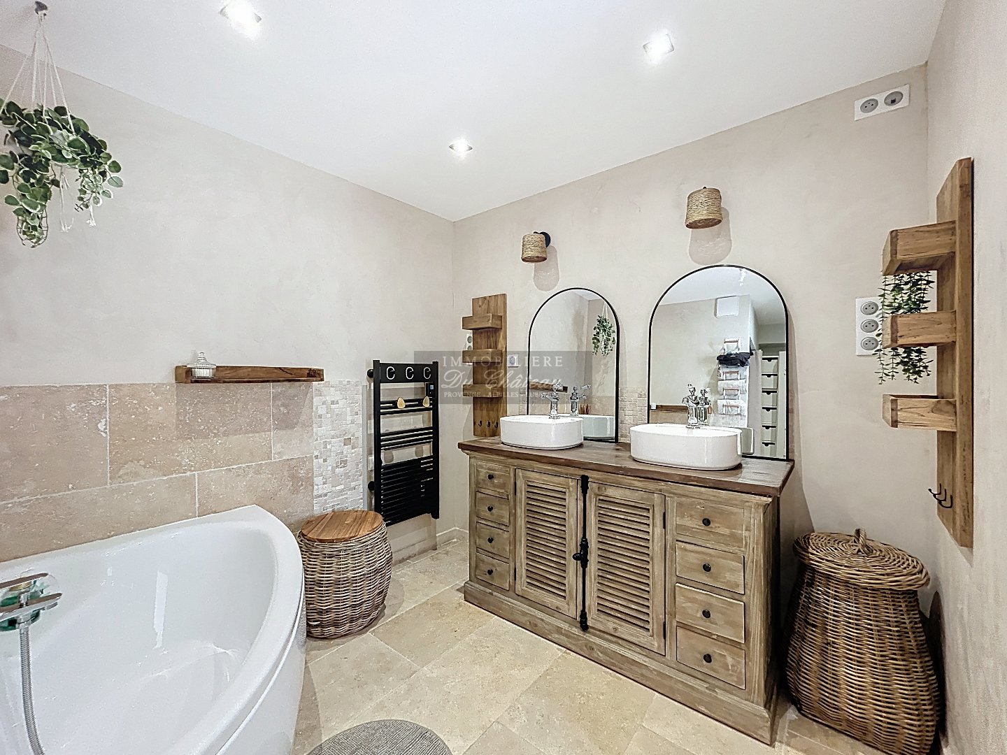 Upstairs, two large bedrooms open onto a shared terrace, along with a bathroom with double vanity and an open space that can serve as a sleeping area or office (and can be closed off), leading to a terrace with unobstructed views of the village of Gordes. Each bedroom benefits from reversible air conditioning.