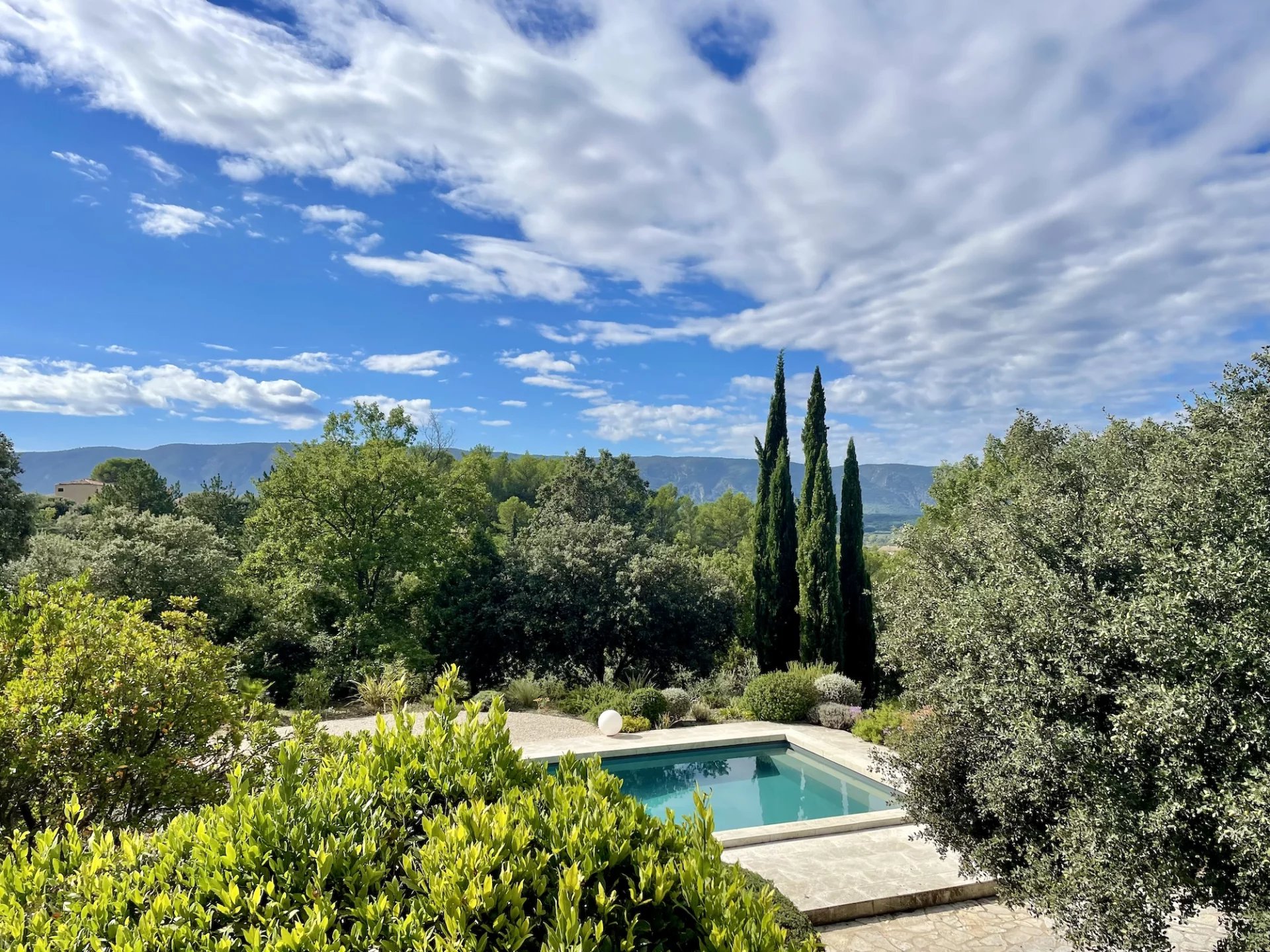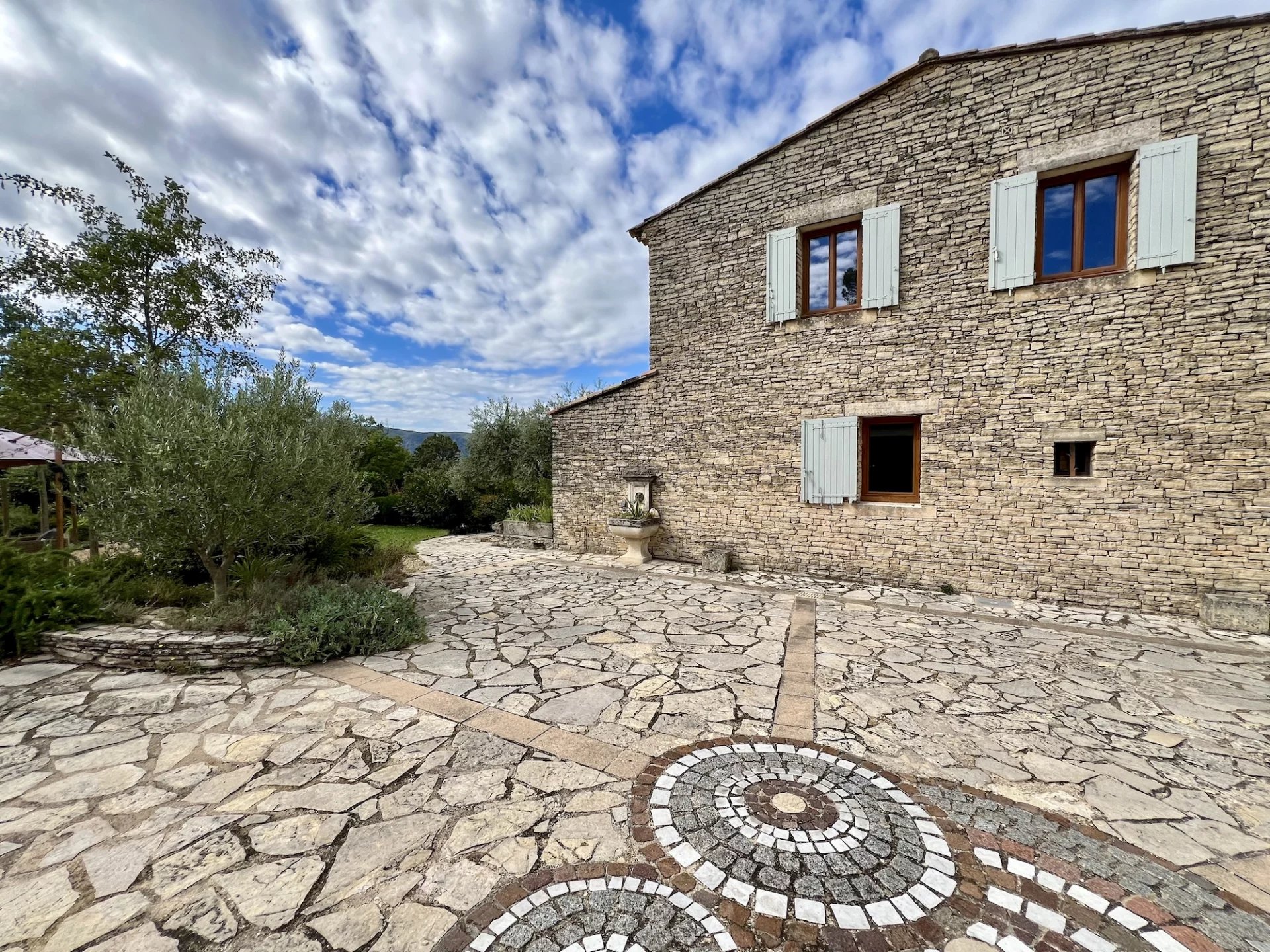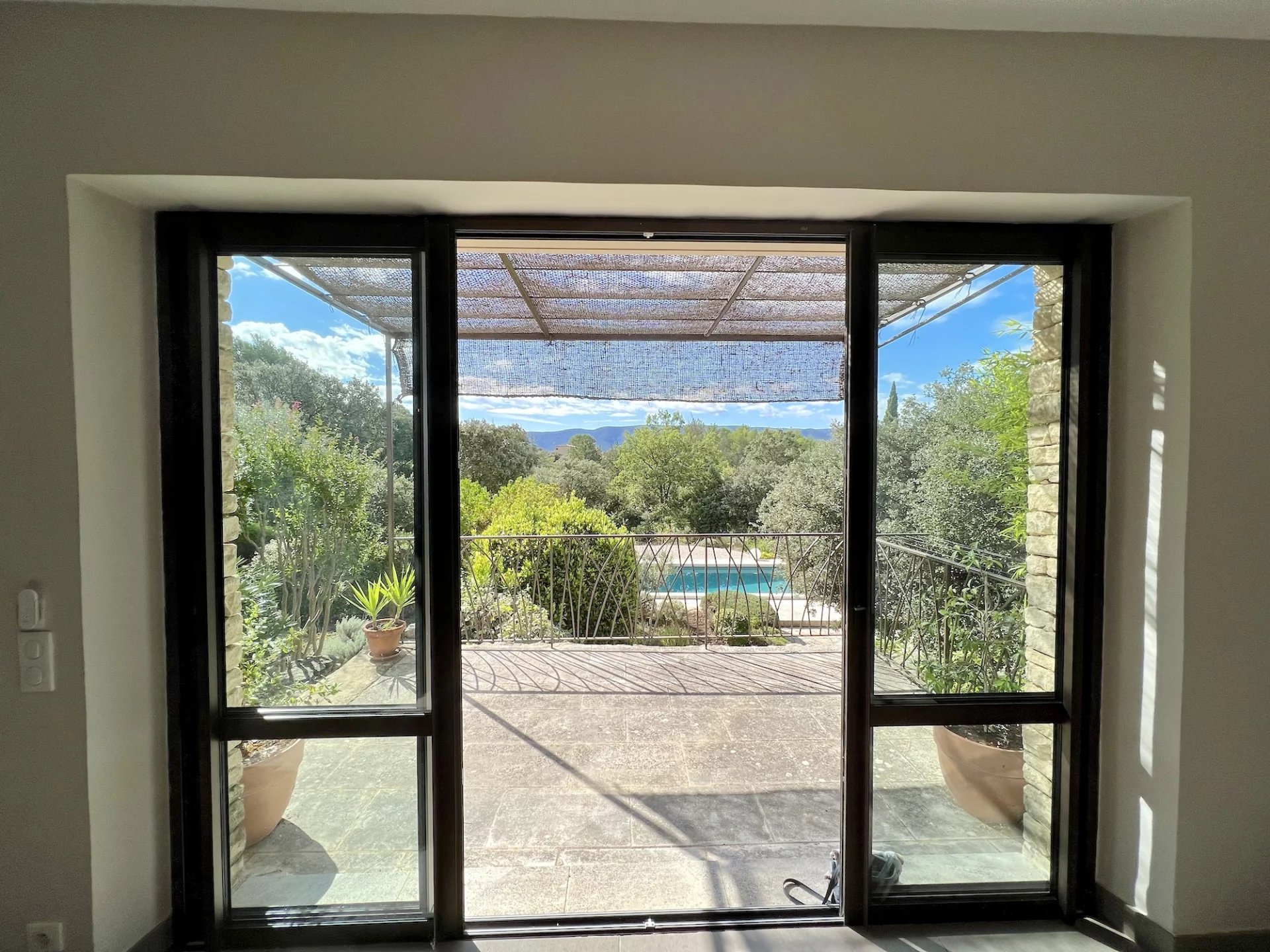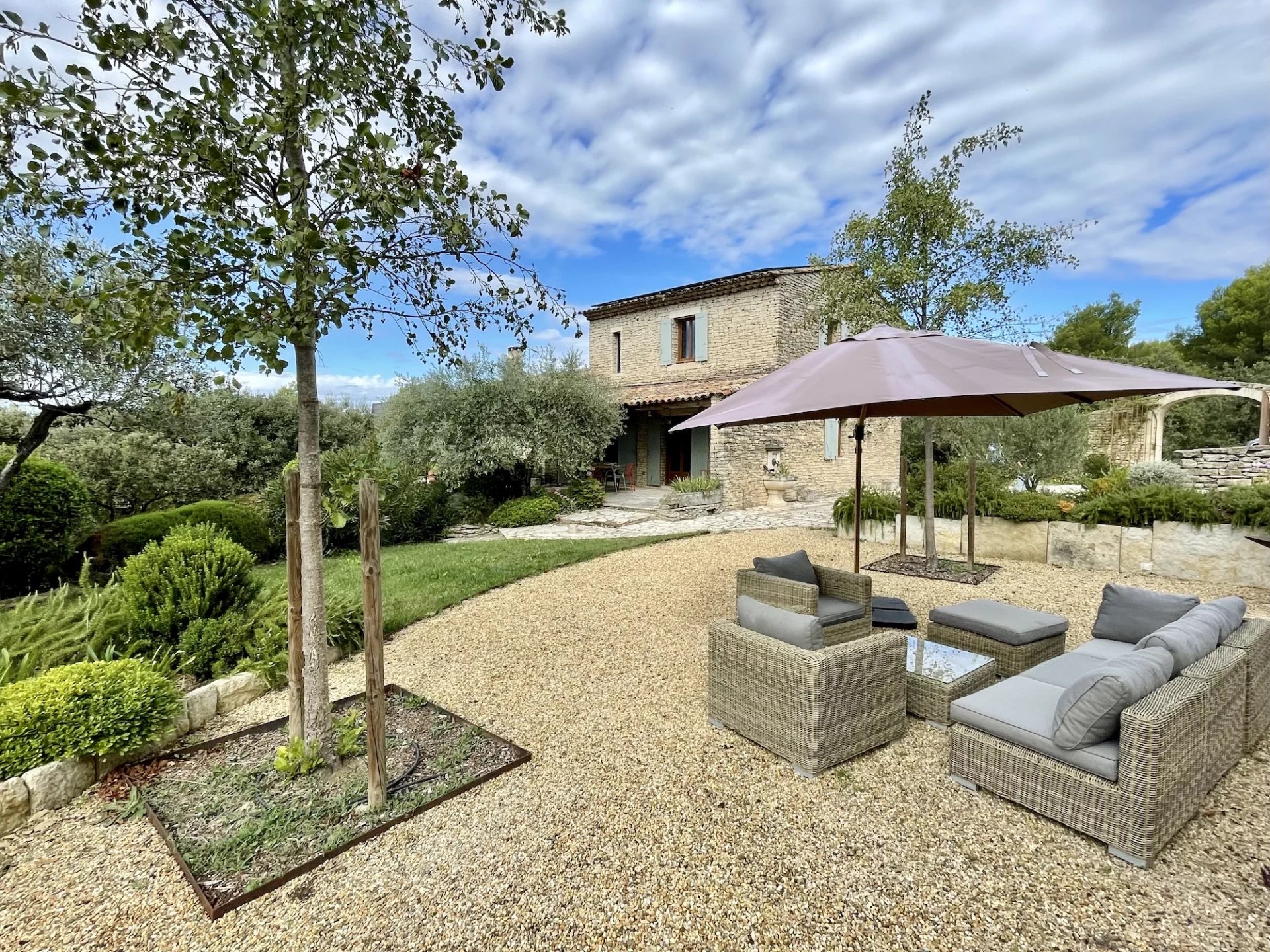 The gently sloping land of 9,280m2 is landscaped around the house and then planted with Provencal species. Several terraces, one of which is covered, another with an arbor and a swimming pool, decorate the house. A workshop/orangery, a garage for 2 cars and a small stone shed as well as a car port complete the package.