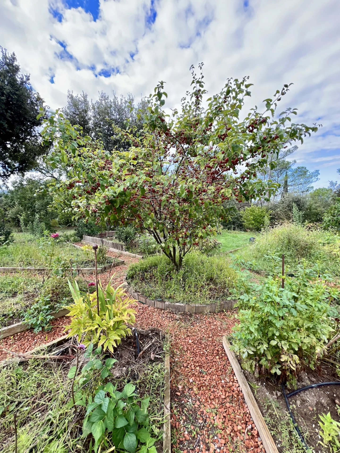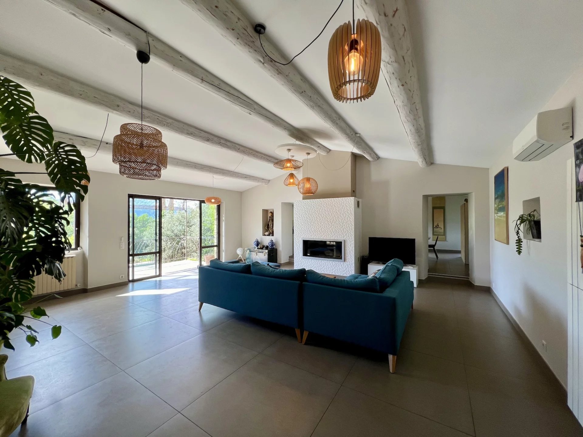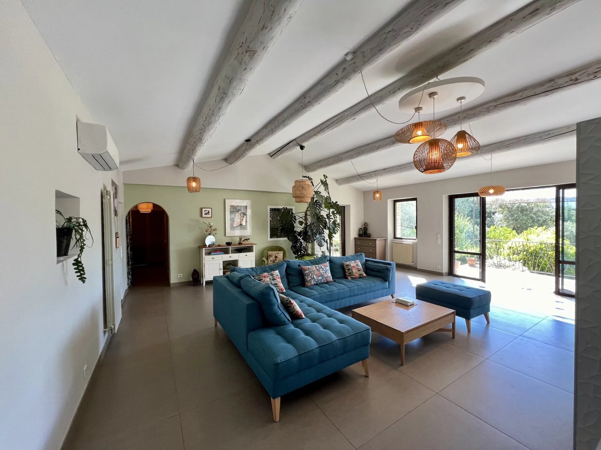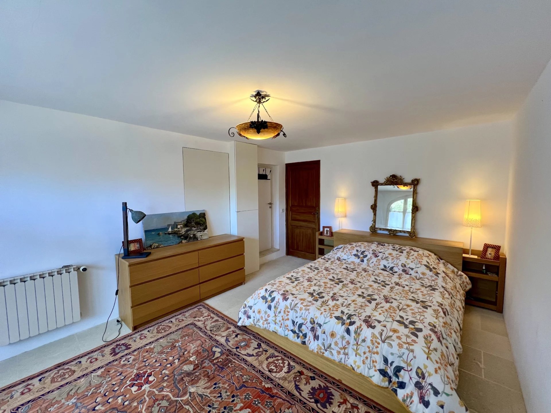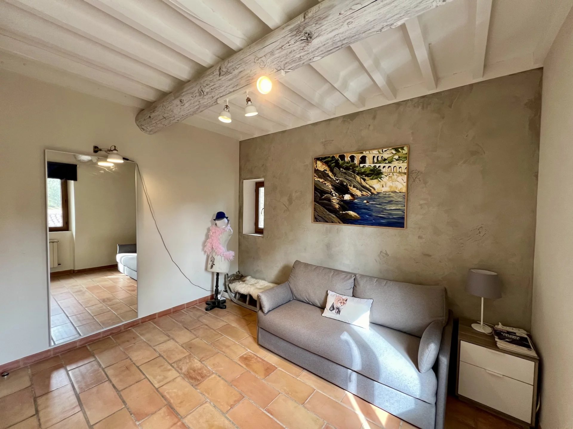 Facing due south, leaning against the hill, it is a house from the 1980’s, enlarged in the 1990’s and restored in 2013 which develops on 3 levels between a main house and an outbuilding: