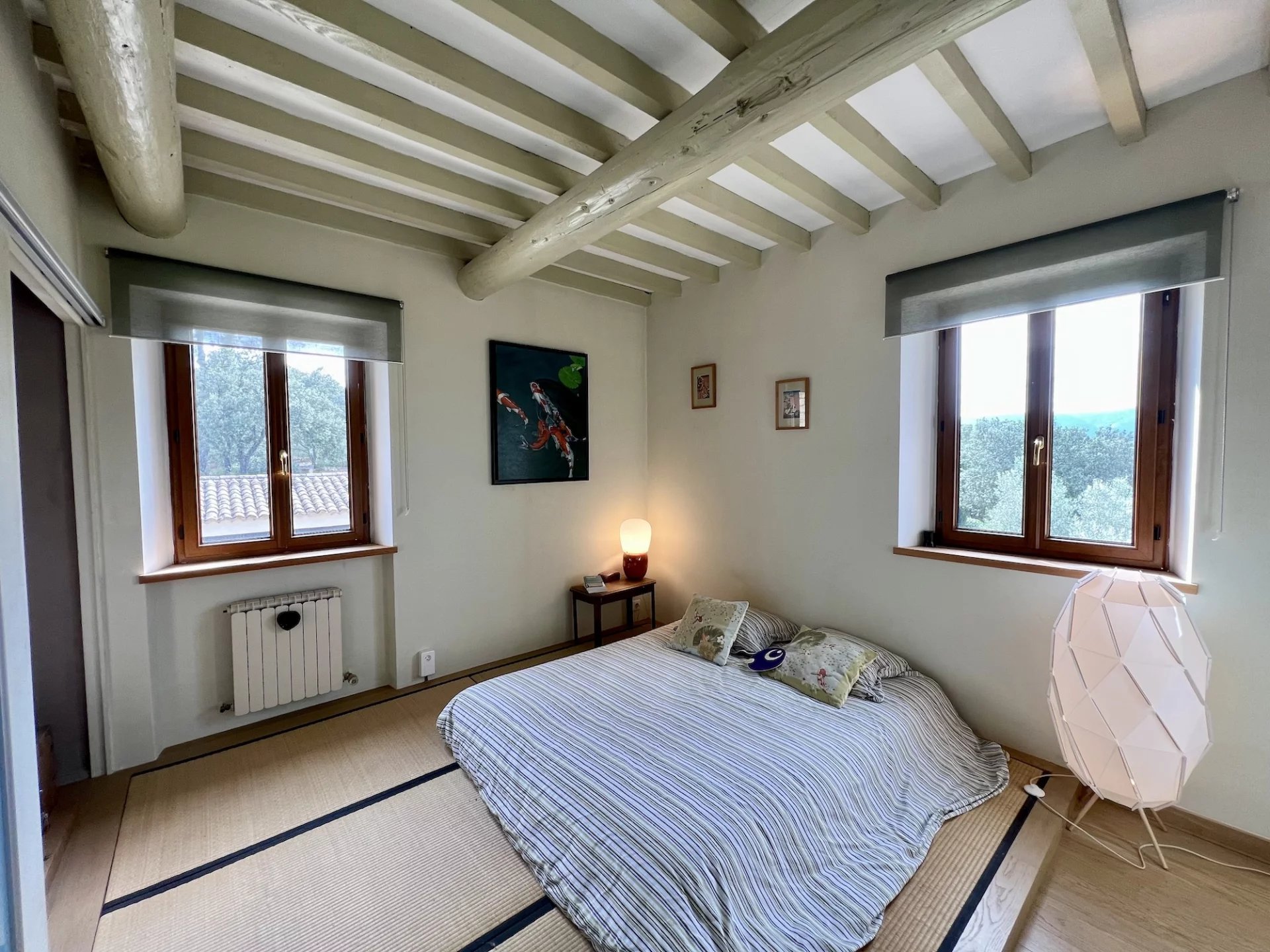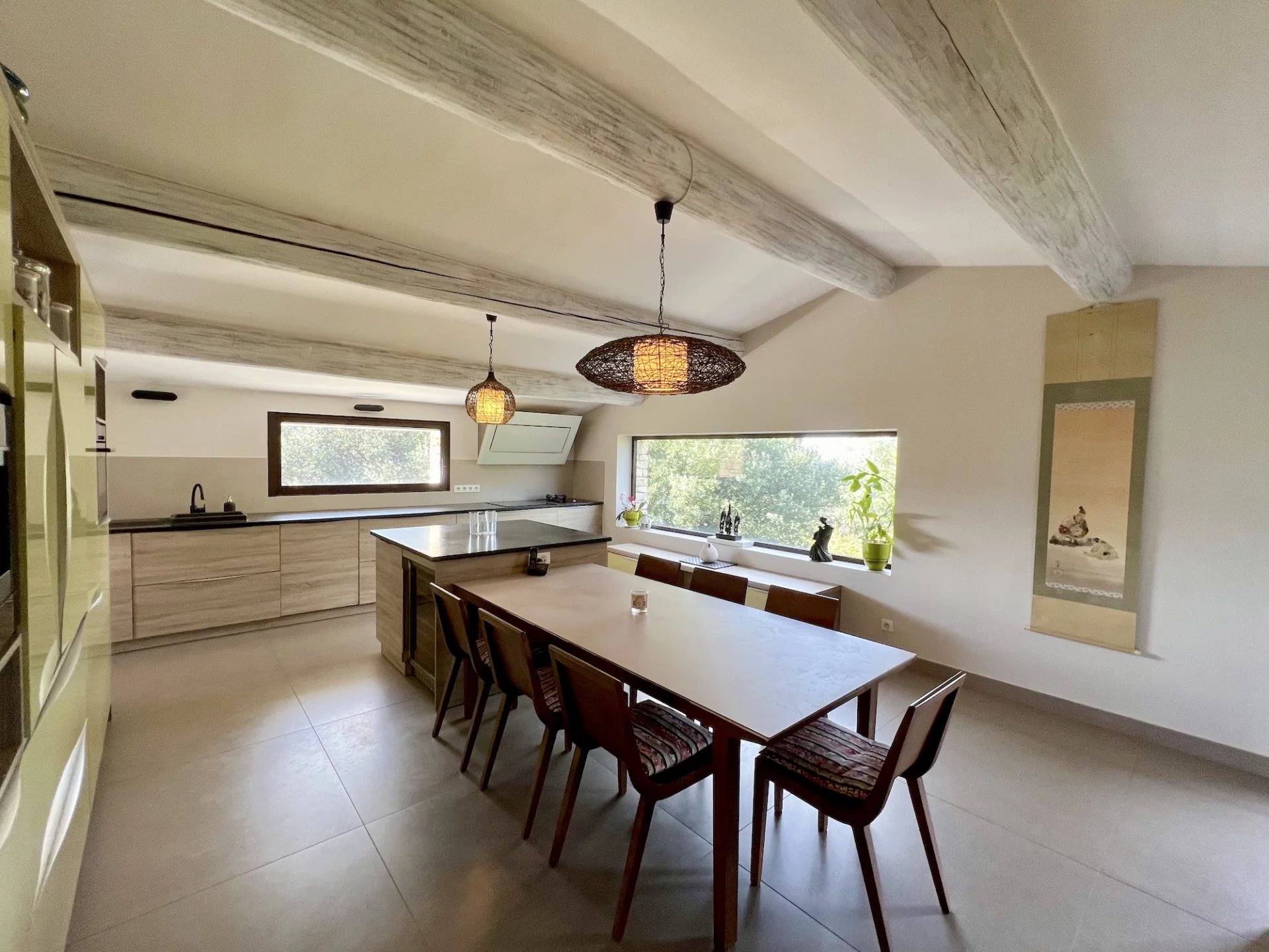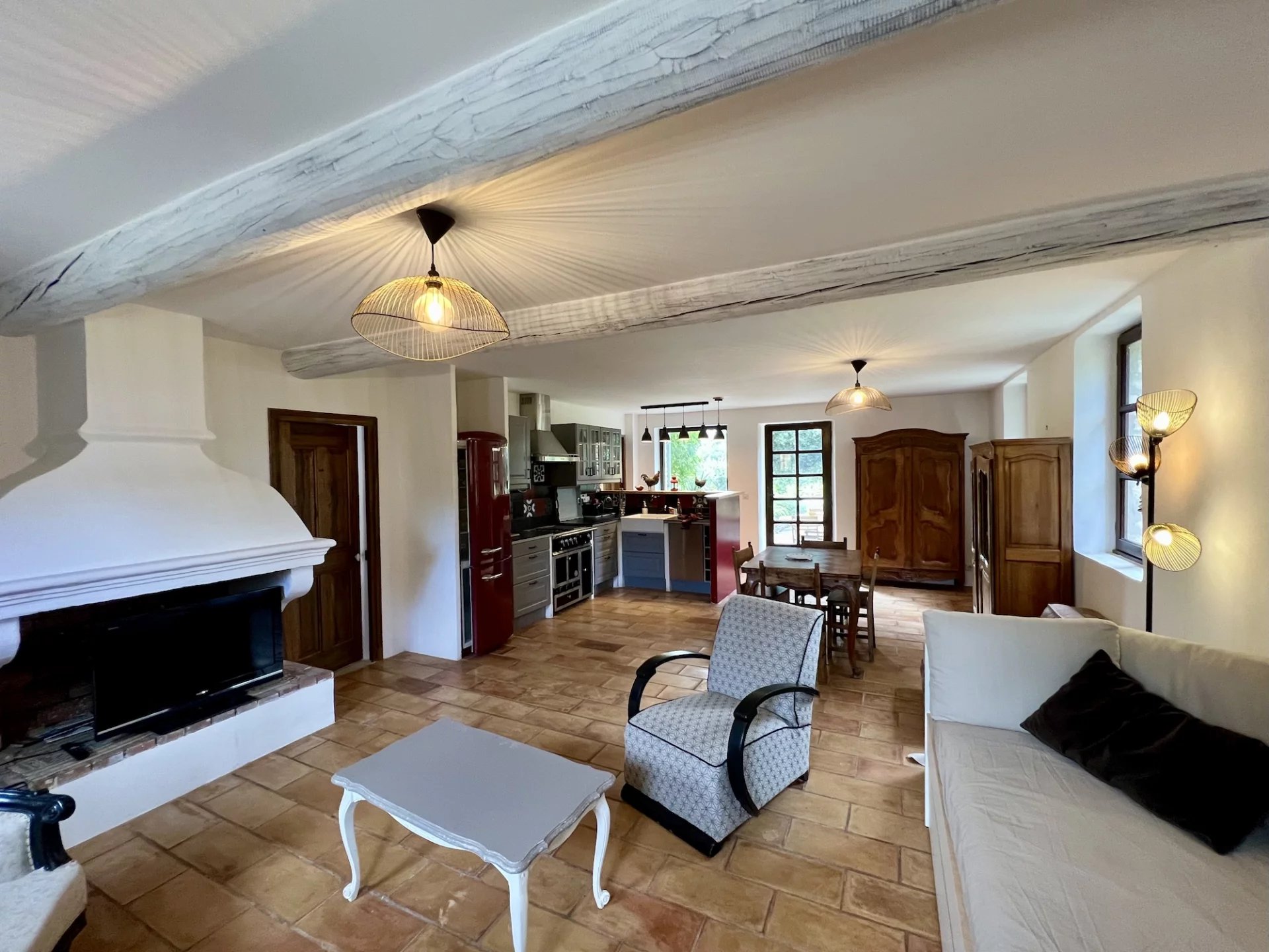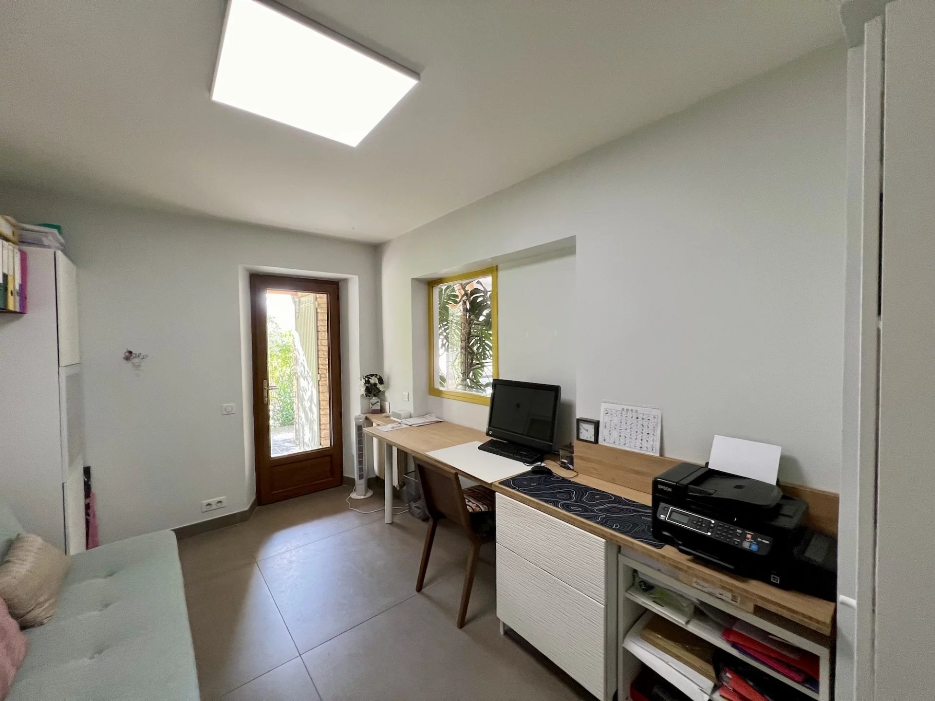 * Ground floor: a large bright living room with fireplace (insert), a fully equipped kitchen, an office, a bedroom with cupboards, an en-suite bathroom (sink, “Japanese” bathtub and shower) and a toilet with wash hands.