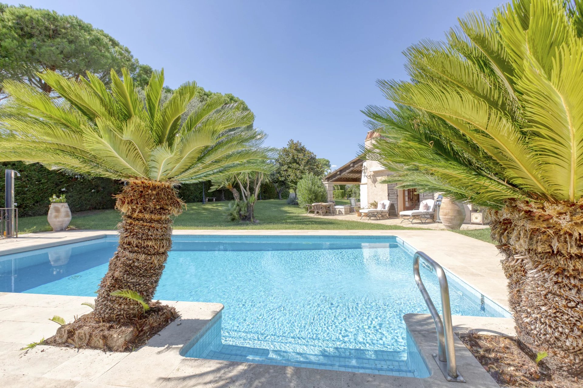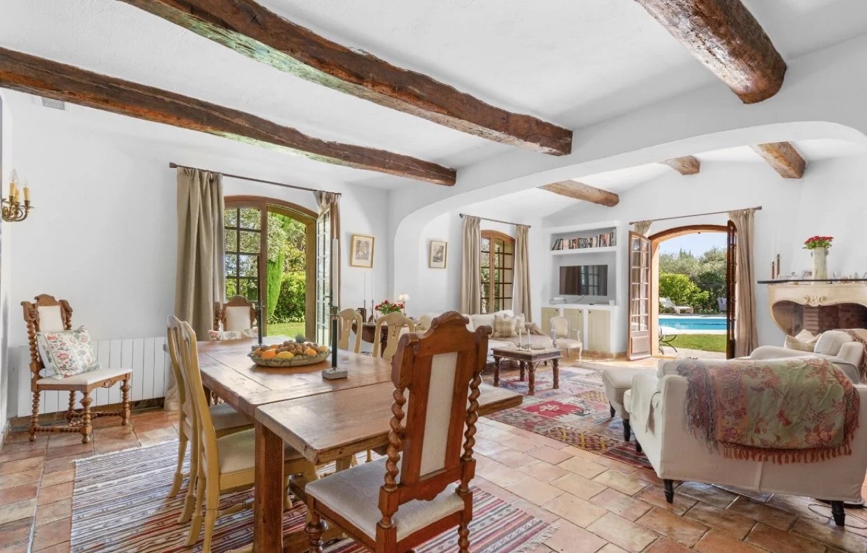The villa exudes Provencal charm with its noble materials, including stone floors from an 18th-century Italian castle, a stone facade, and wooden details.