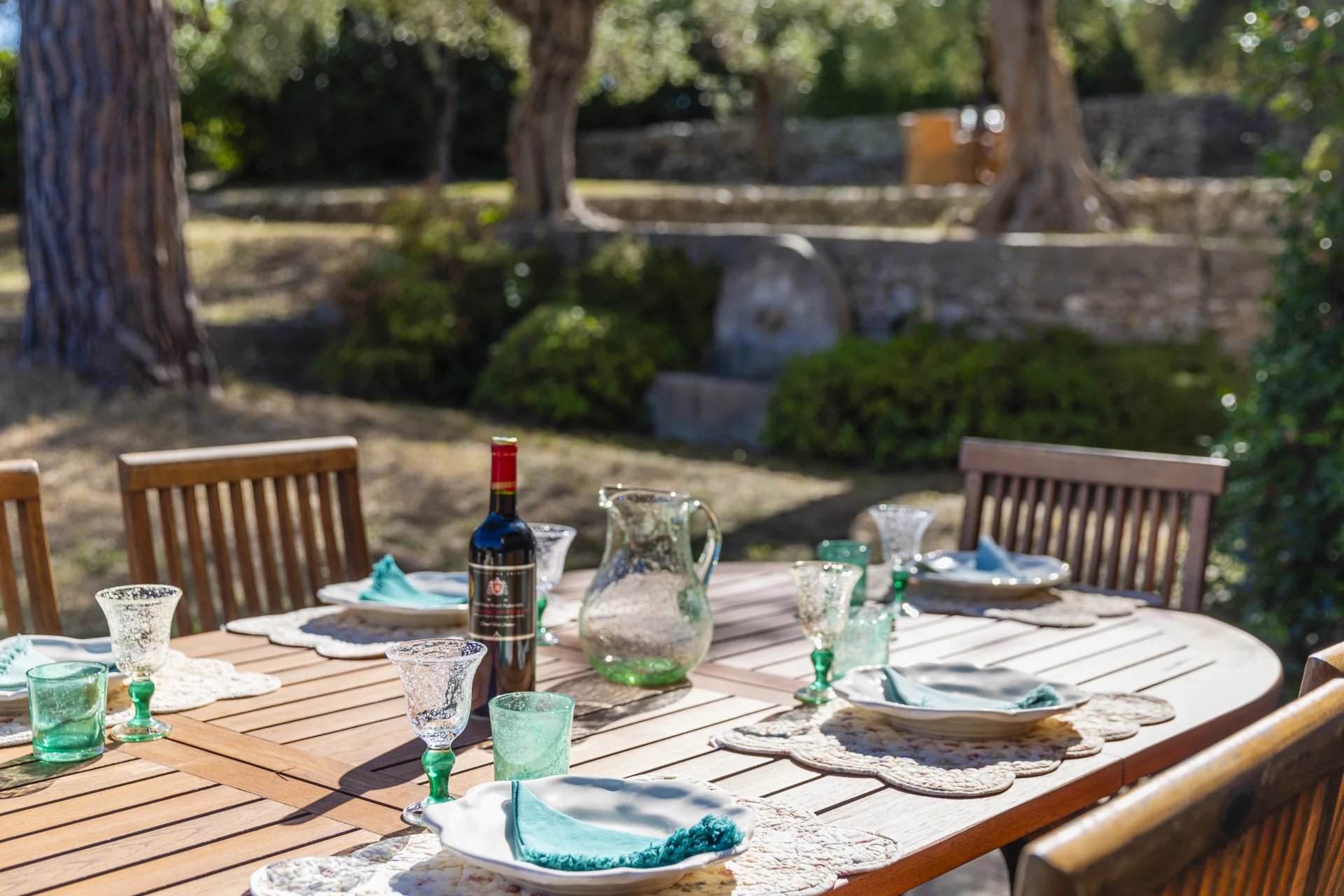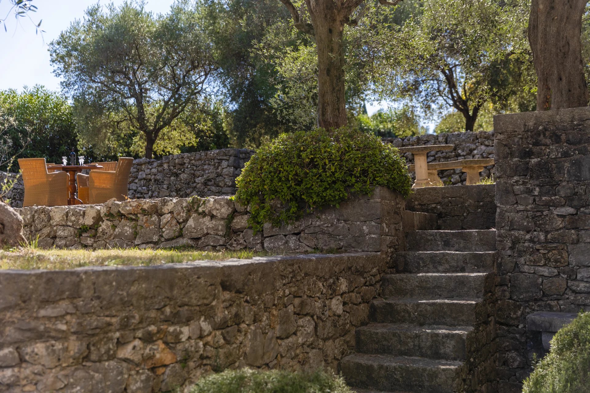 The property spans approximately 7,000 m2 and features a lovely swimming pool and a beautifully landscaped garden with stone walls, several seating areas, and over 40 olive trees, some of which are illuminated in the evening.