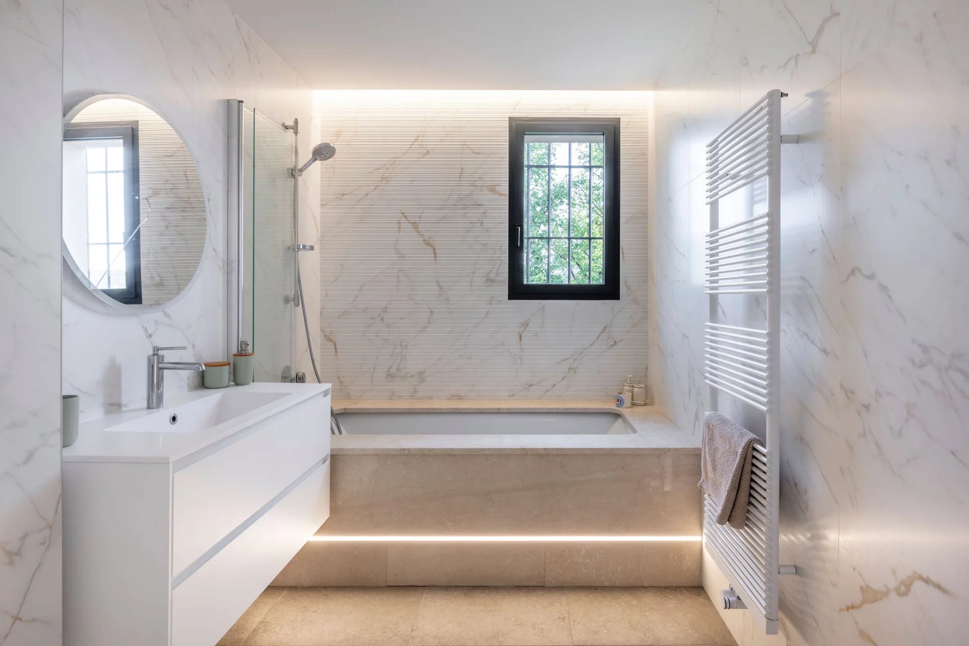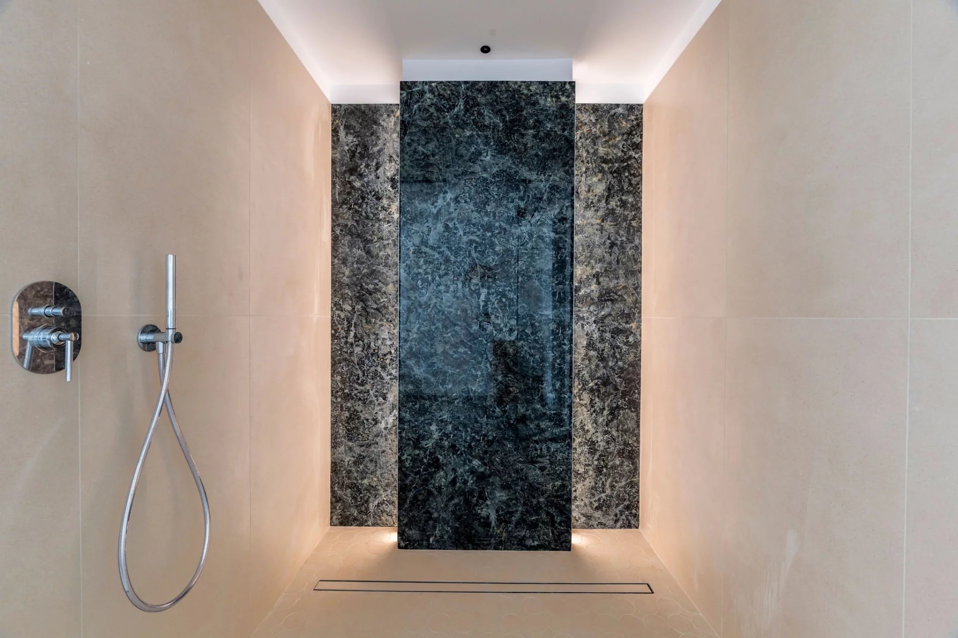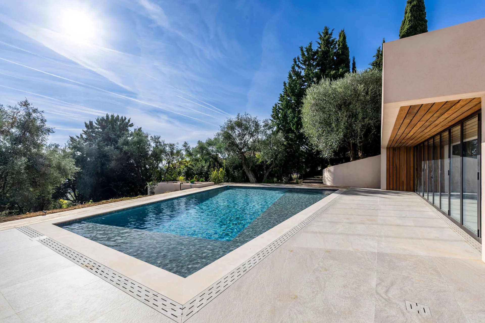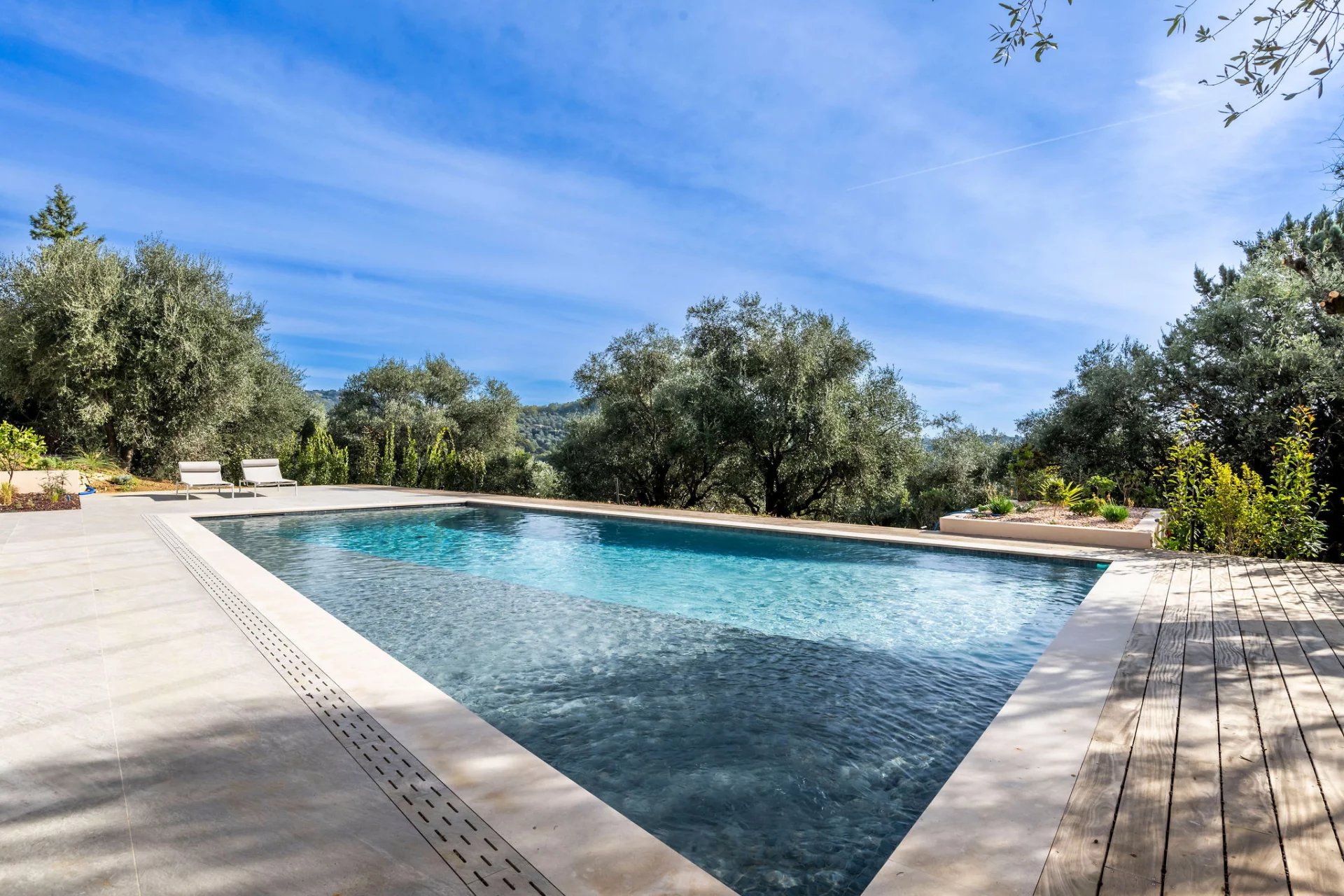 The beautifully landscaped grounds span approximately 5,000 m2, including an olive grove, meadow, and a variety of Mediterranean plants and shrubs. The poolhouse offers a stylish indoor-outdoor living and dining area, with space for a summer kitchen, and opens onto the swimming pool, complete with an outdoor shower.