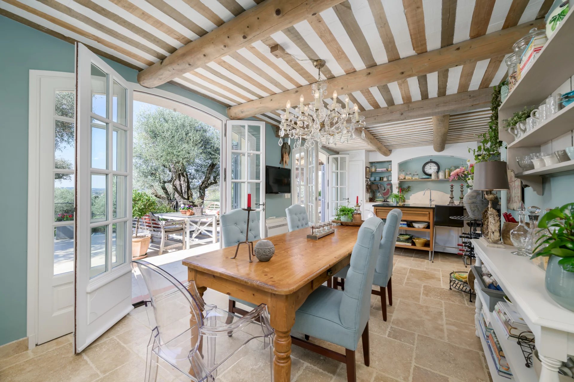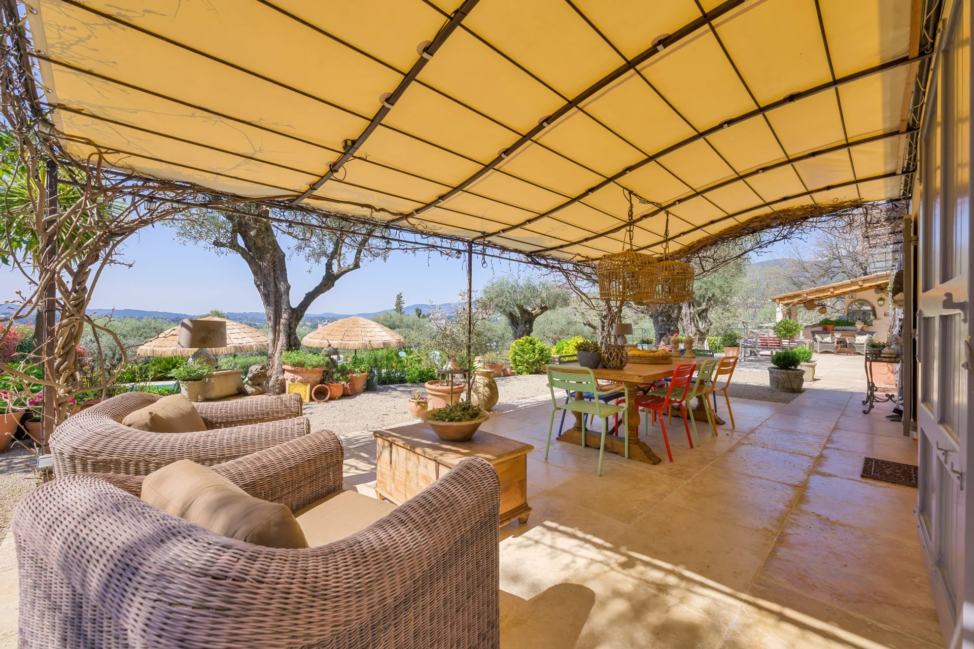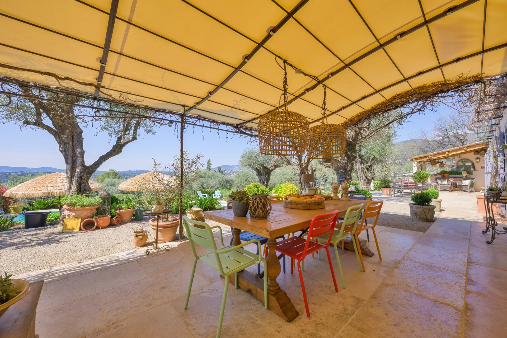 Outside, a magnificent shaded terrace with a pergola overlooks the swimming pool and garden, creating an idyllic outdoor living space.