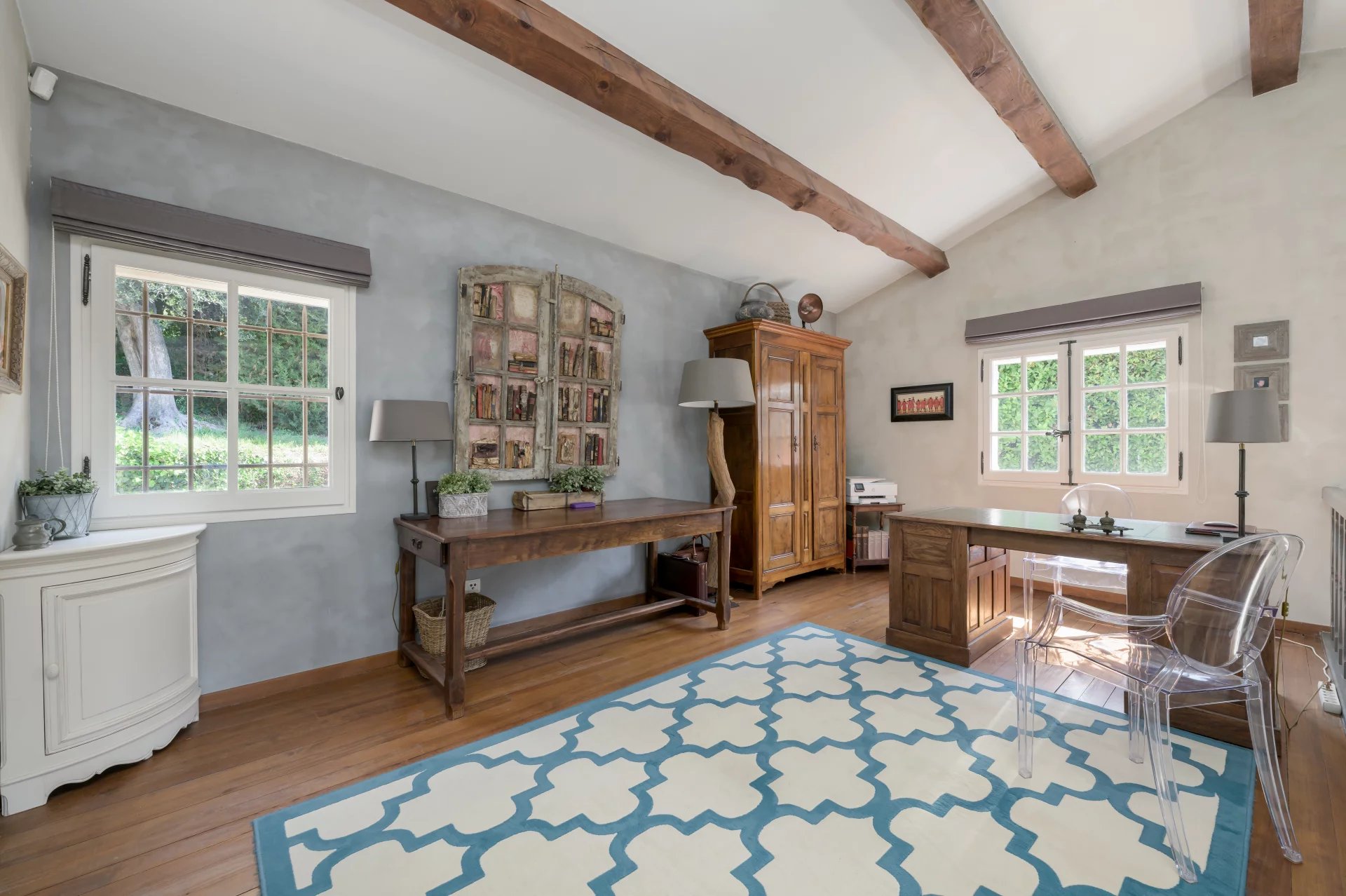 With a living area of 233 m2 (excluding annexes), the house comprises: an entrance hall with guest toilets, a spacious fully equipped kitchen with a pantry, a welcoming dining room, a bright living room with impressive ceiling height, a cozy lounge featuring a fireplace.