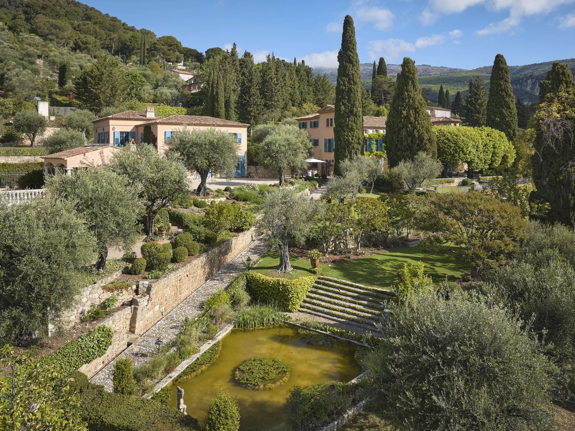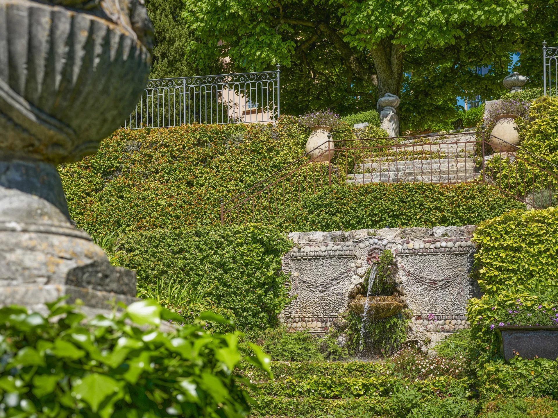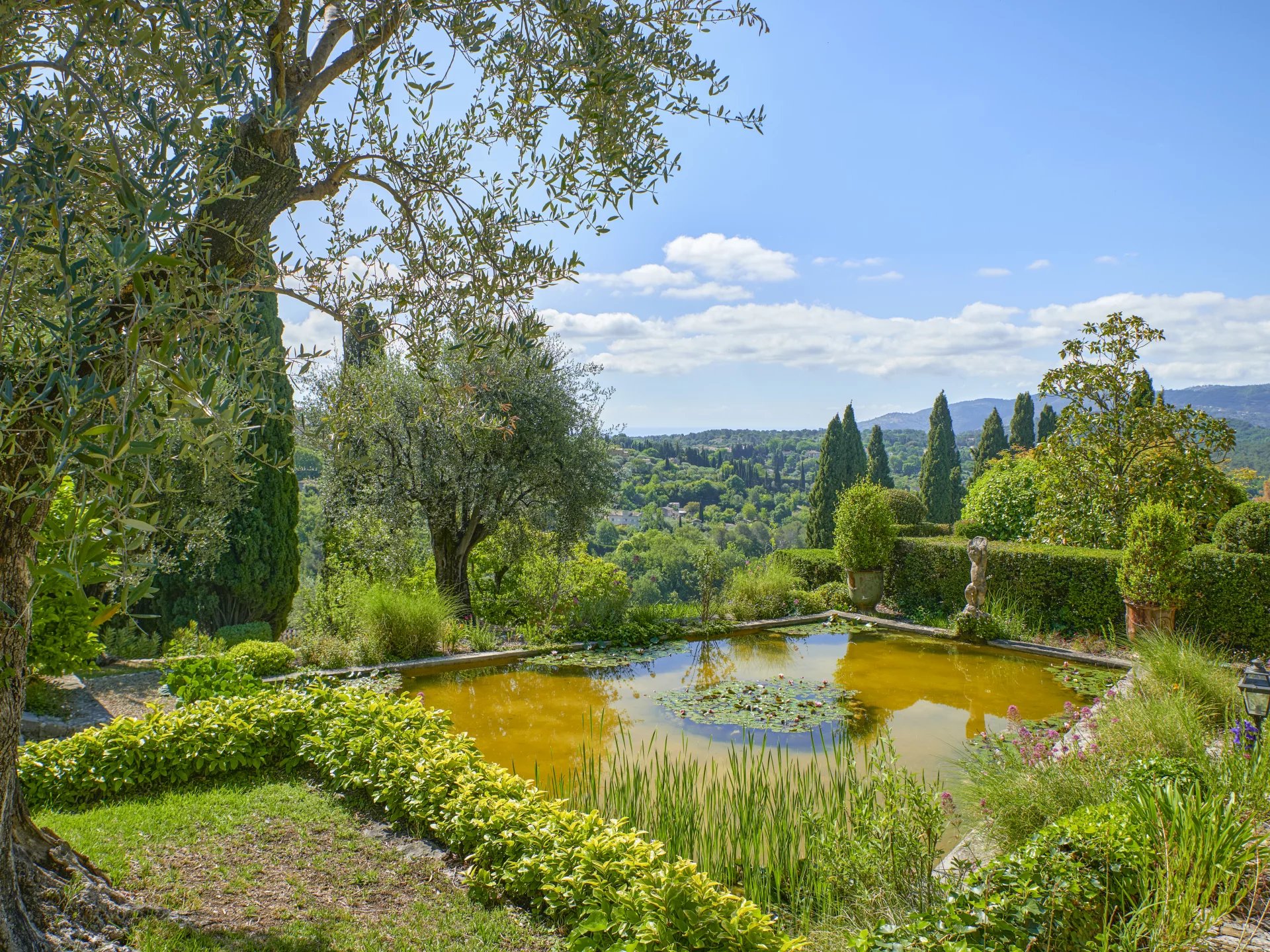 From the magnificent terraces, shaded by 180 year old lime trees, you have access to a romantic pond with koi carp, surrounded by box trees, cypresses and pines. The beautiful park also features countless fountains, an enchanting rose garden, an idyllic gazebo, an “Átang d’amour”, rare and exotic tree species and an extensive olive grove.