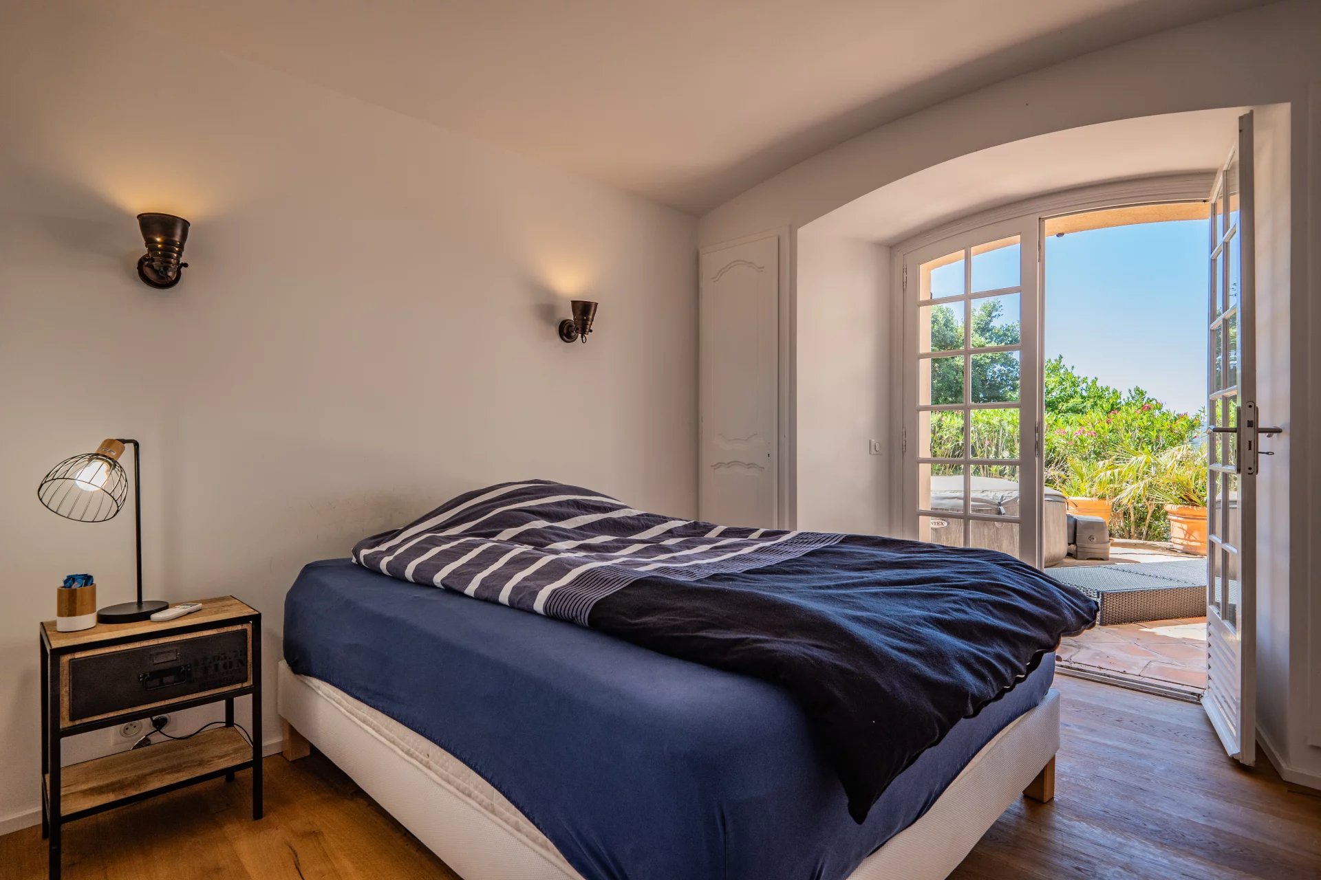 Upstairs is a master suite with bathroom and study. Heated swimming pool and jacuzzi, numerous terraces.