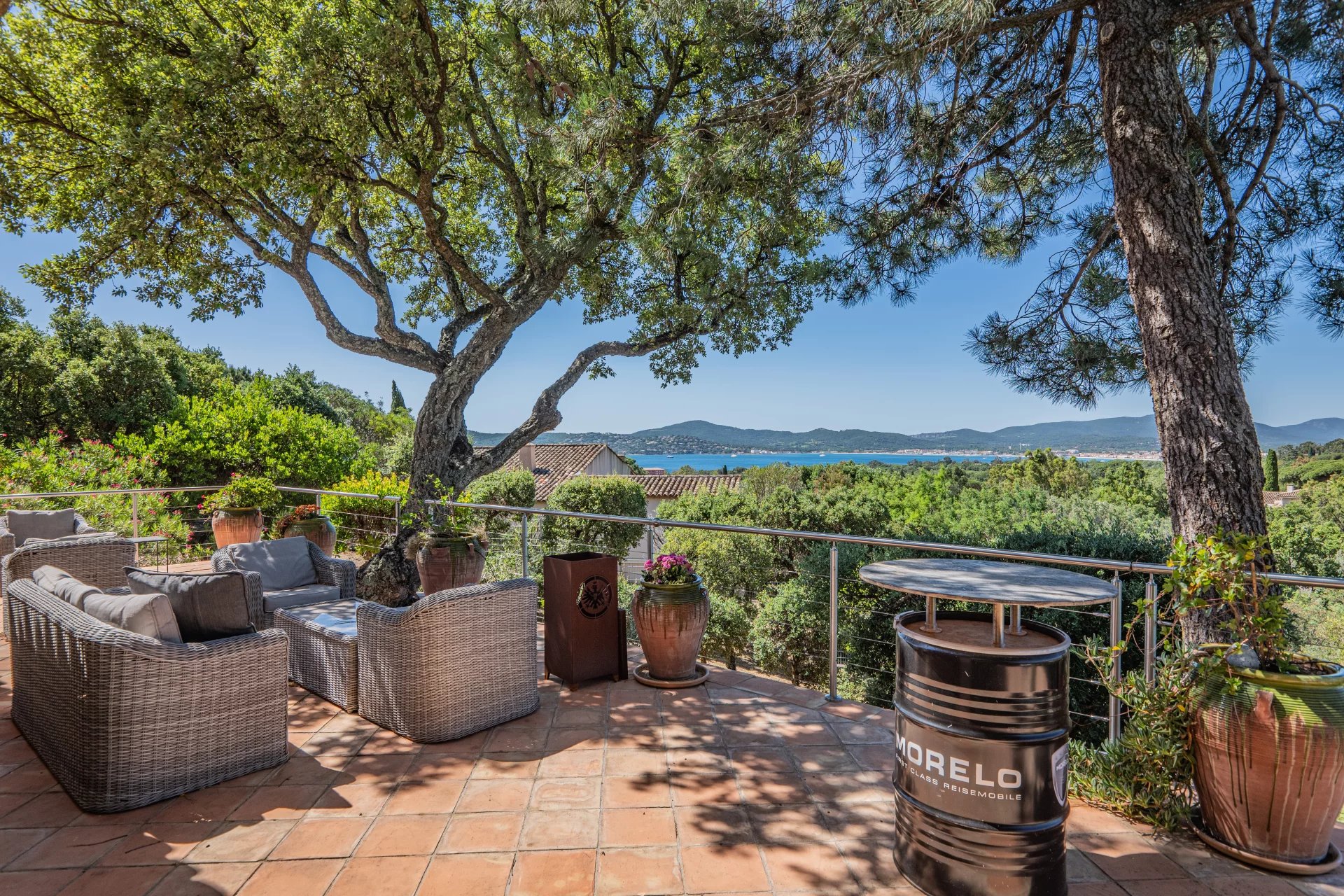 In a sought-after gated estate, this pleasant 150 m2 villa is set in 4100 m2 of attractive grounds with beautiful views over rolling countryside down to the sea.