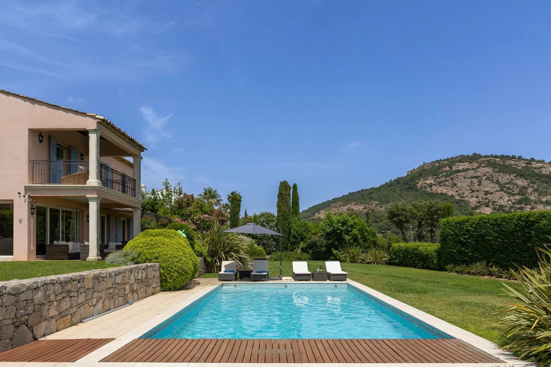 The property is set on landscaped grounds of 2500 m2, with Mediterranean shrubs, accommodating a swimming pool and large terraces offering a splendid panorama over the sea.