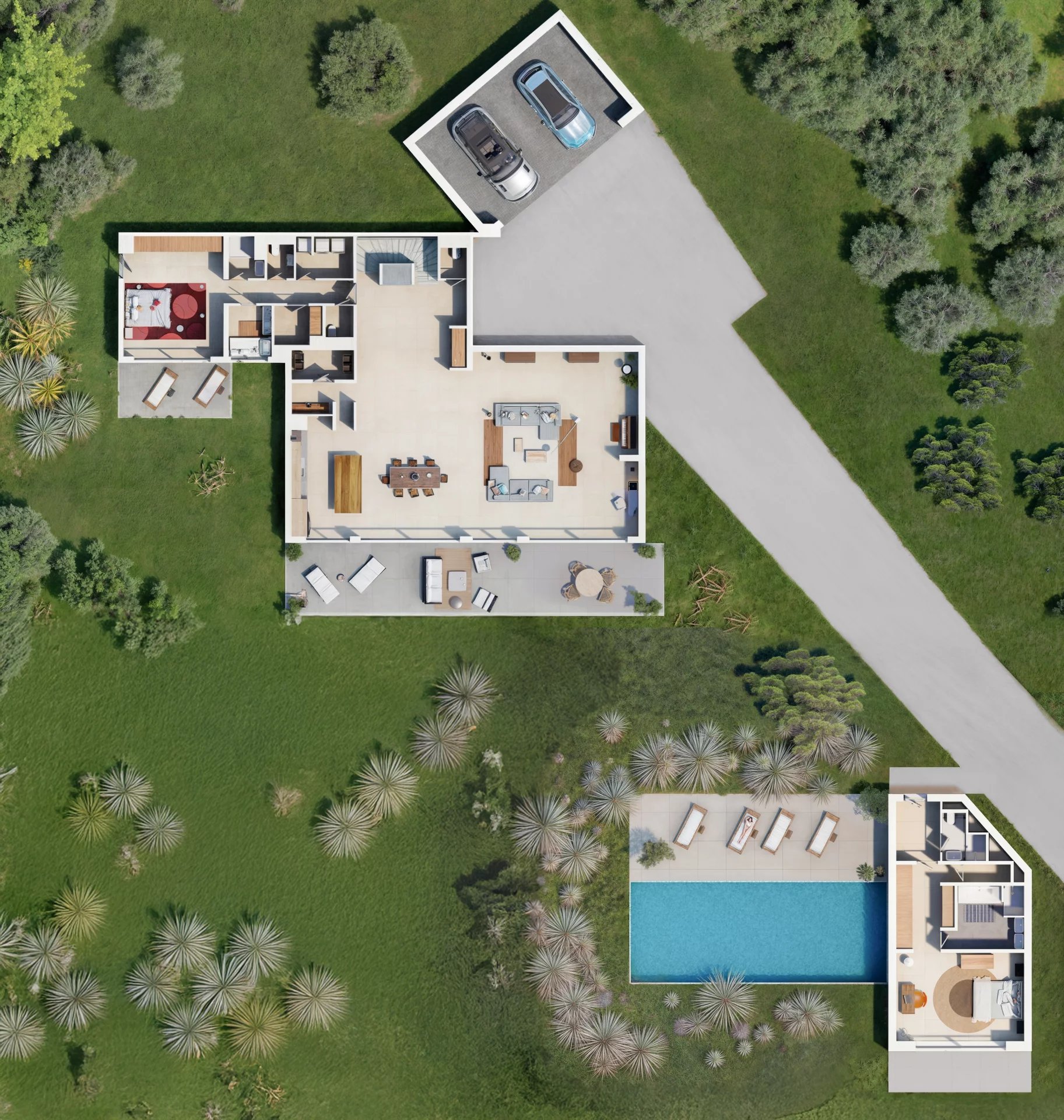 Set in 5,350 m2 of landscaped grounds, the villa opens onto a superb swimming pool, an extension of the living room terrace, and a summer kitchen ideal for relaxing and socializing.