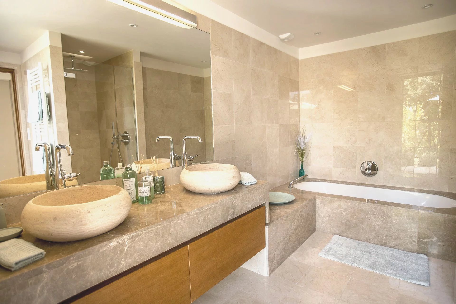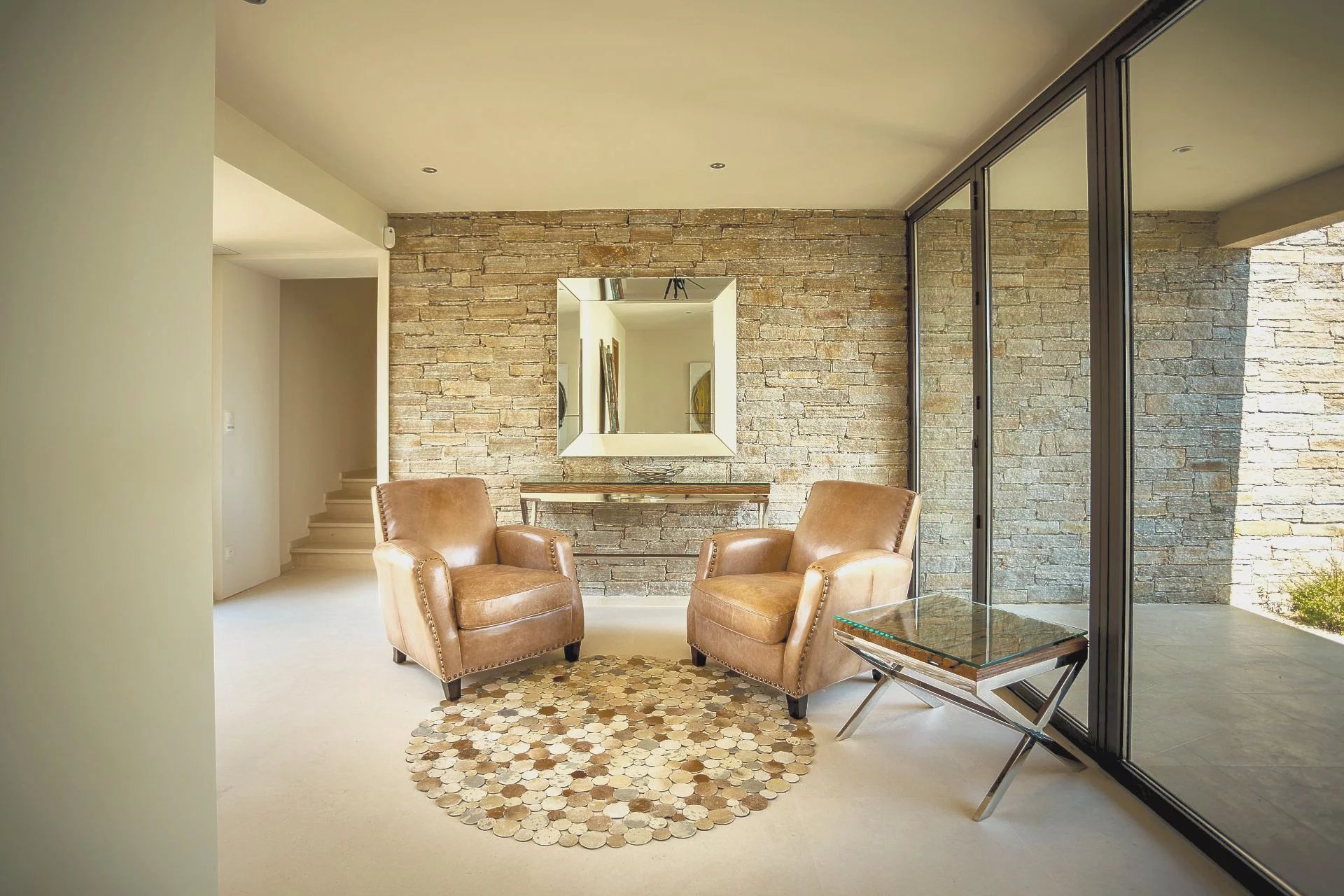 Entirely built with noble materials (natural stone, marble, precious wood, glass), the property of modern inspiration, offers generous volumes and a bright living space with a living area of about 290 m2 and a total area of about 490 m². Spread over two levels, the villa includes 5 en-suite bedrooms, each with access to a terrace or the garden