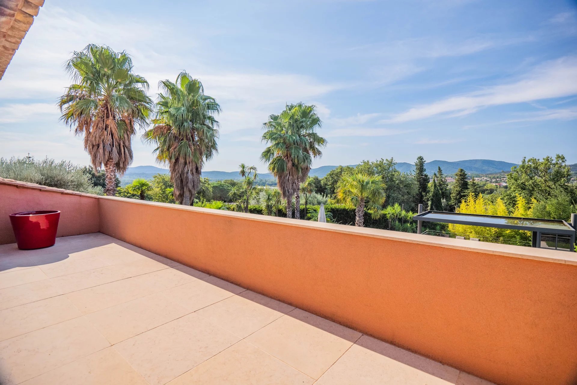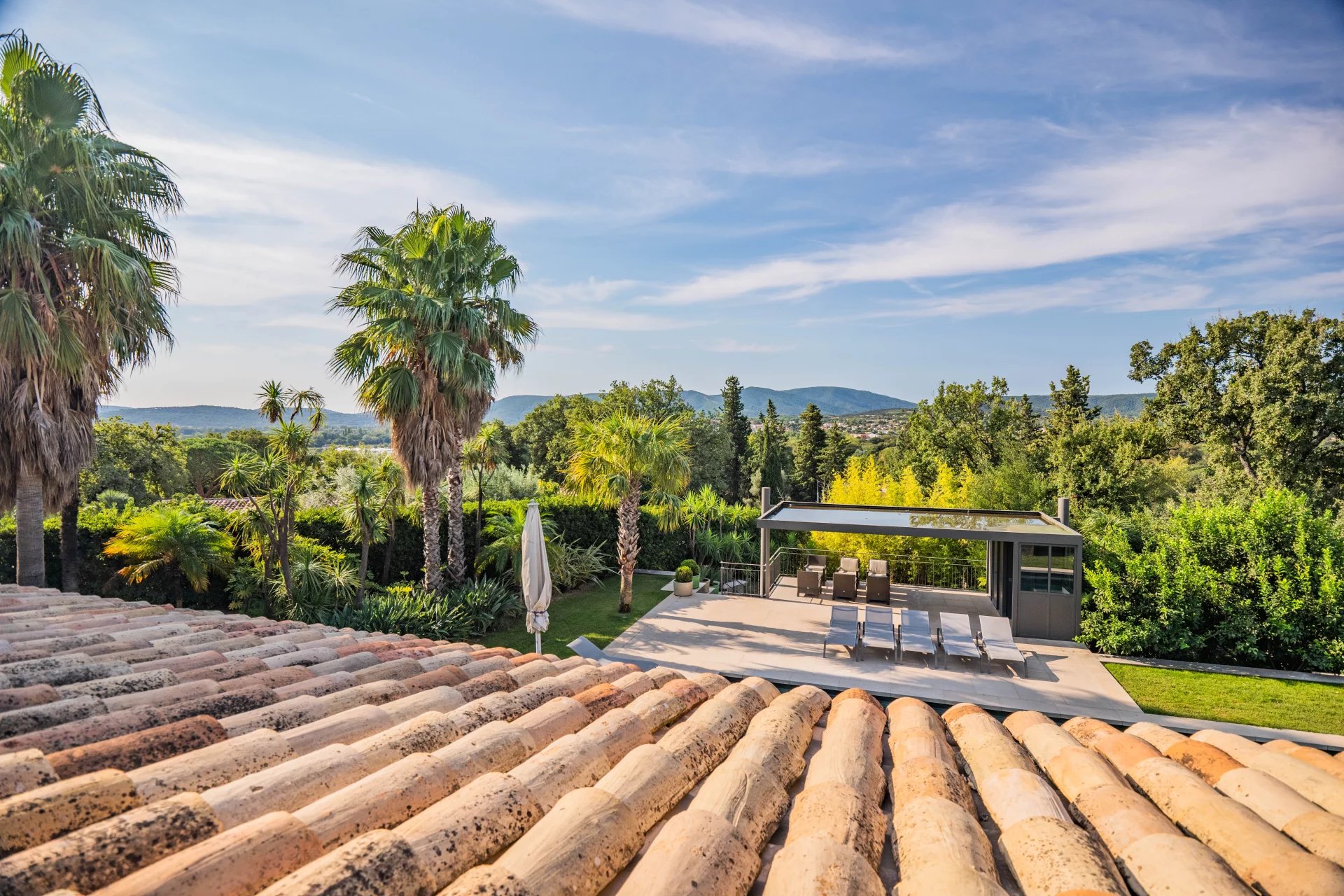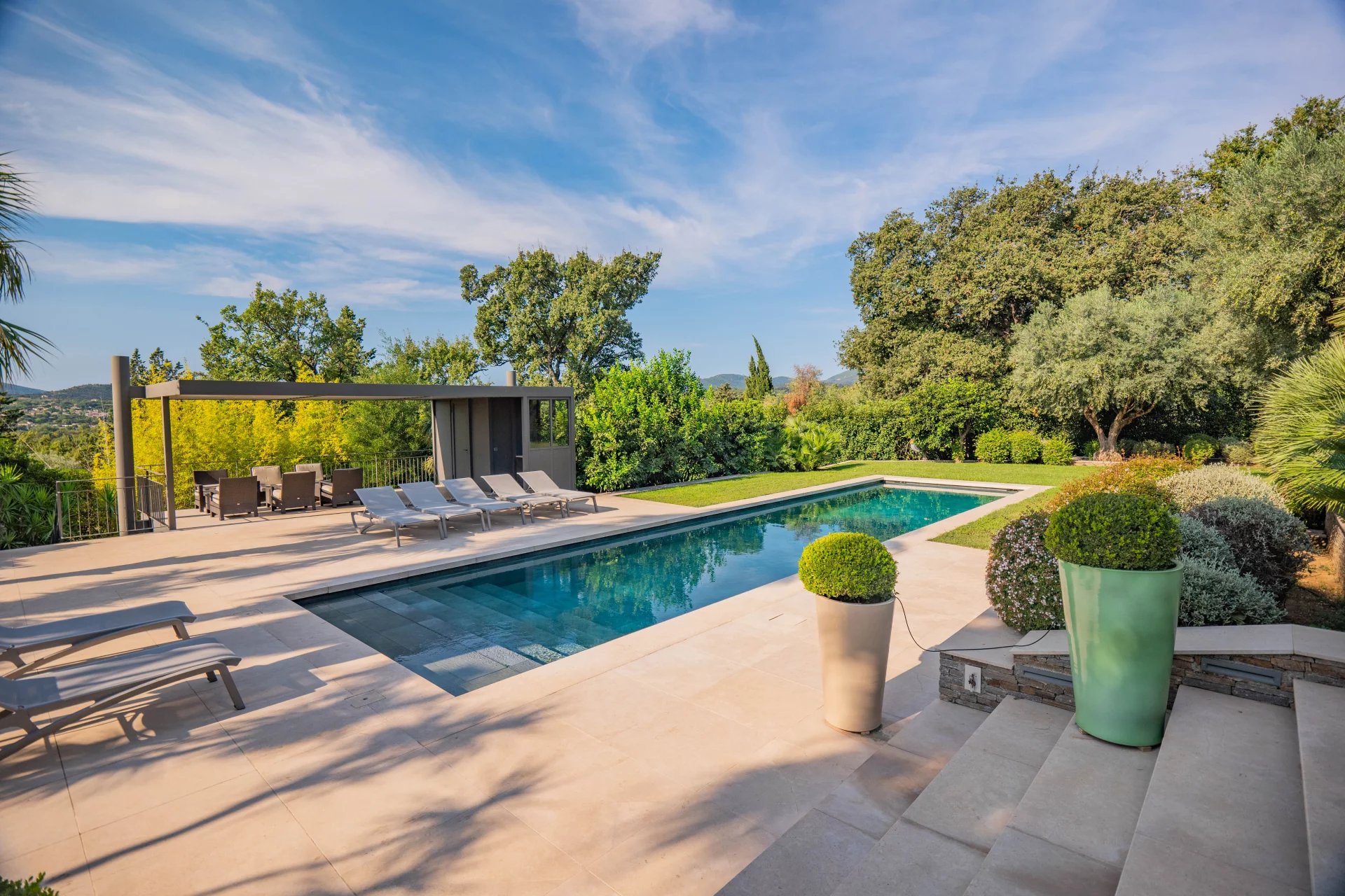Built in a green setting, close to to centre of the charming village of Grimaud, this superb villa of 360m2 with modern architecture is located on a large flat plot of 3000m2 and offers top-of-the-range services.