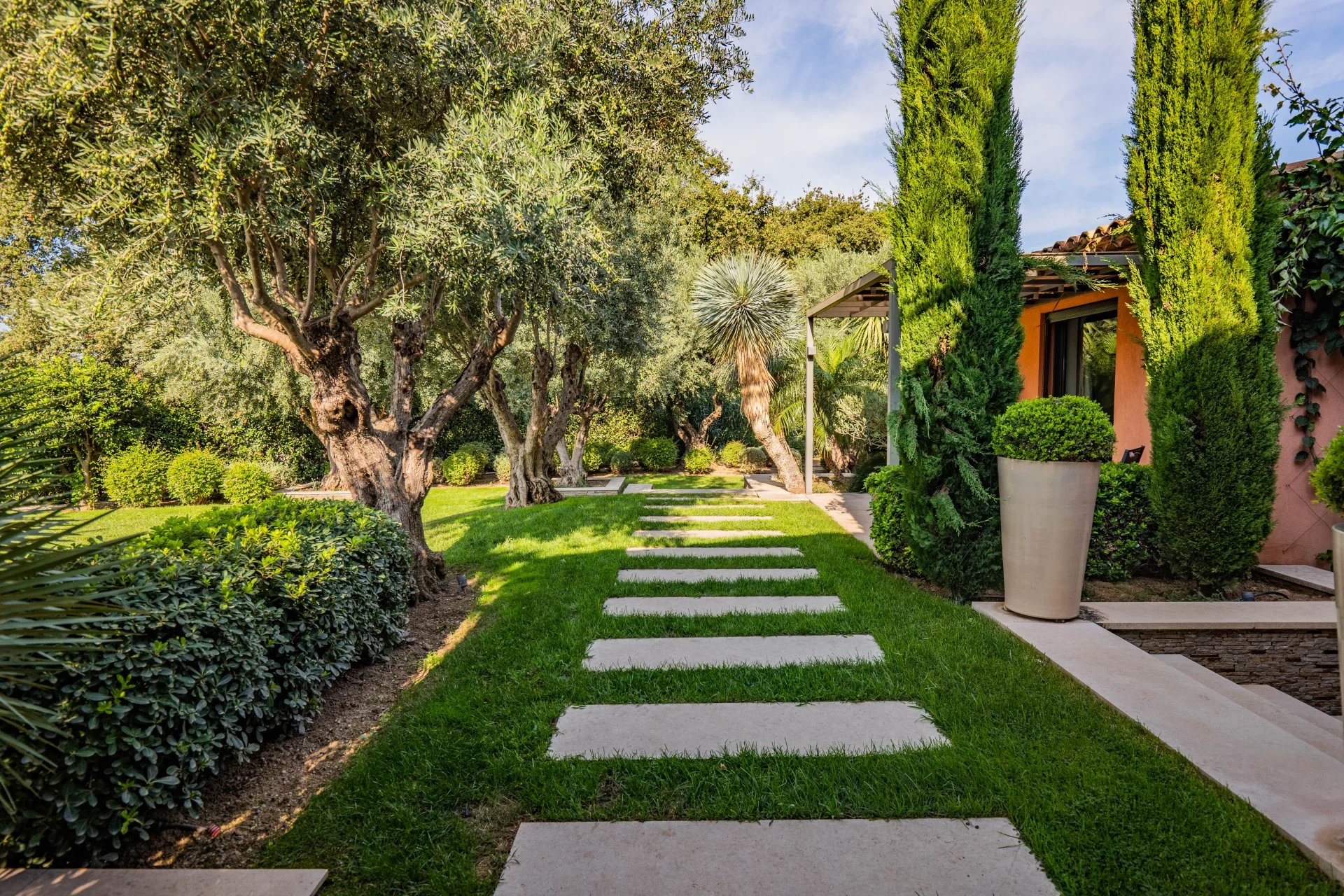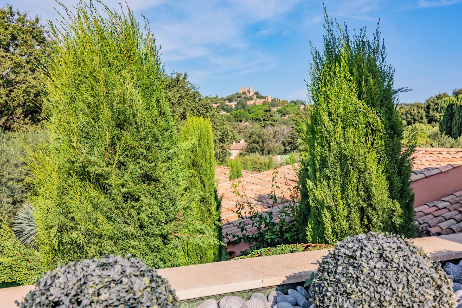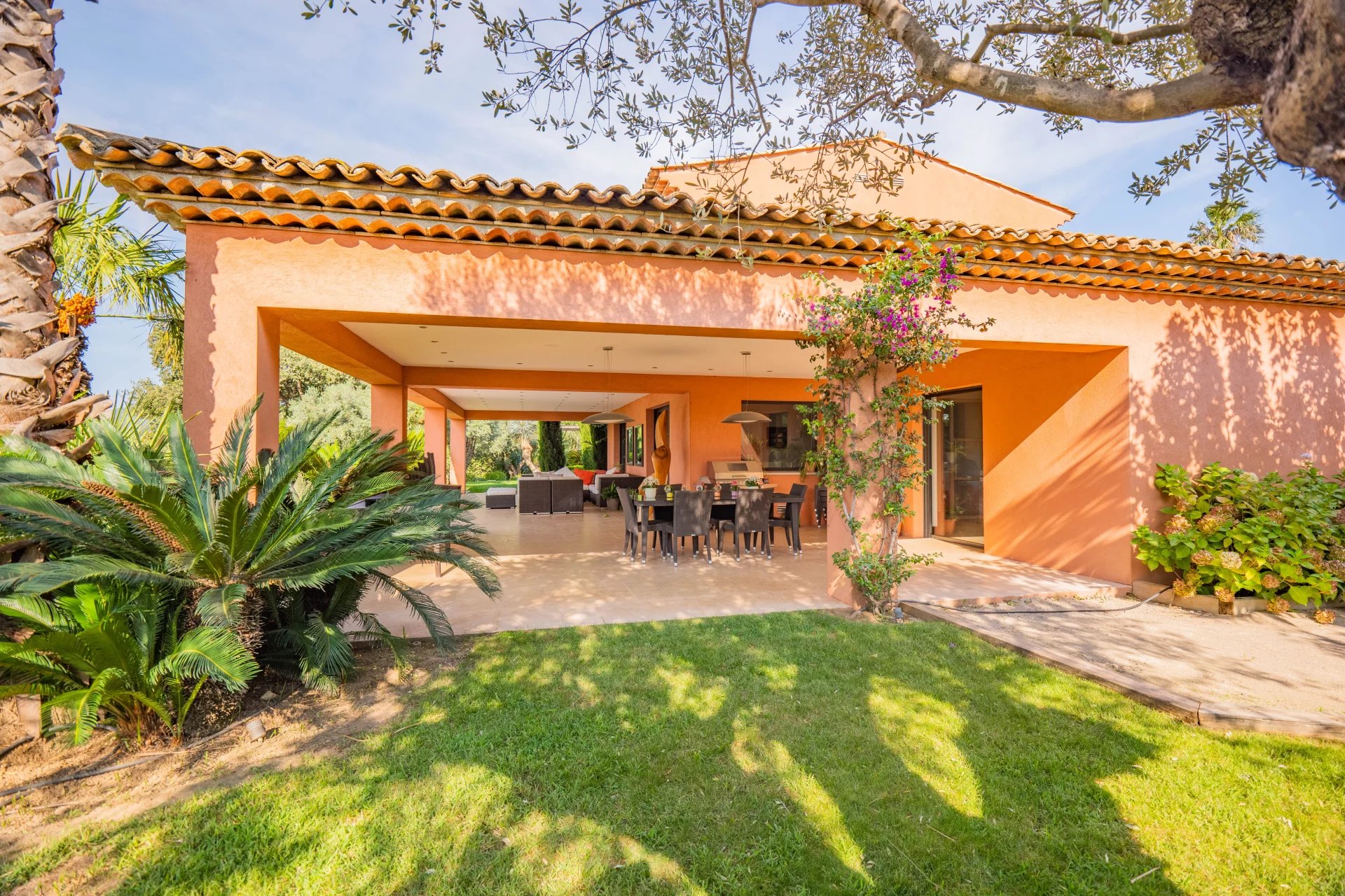 Built in a green setting, close to to centre of the charming village of Grimaud, this superb villa of 360m2 with modern architecture is located on a large flat plot of 3000m2 and offers top-of-the-range services.