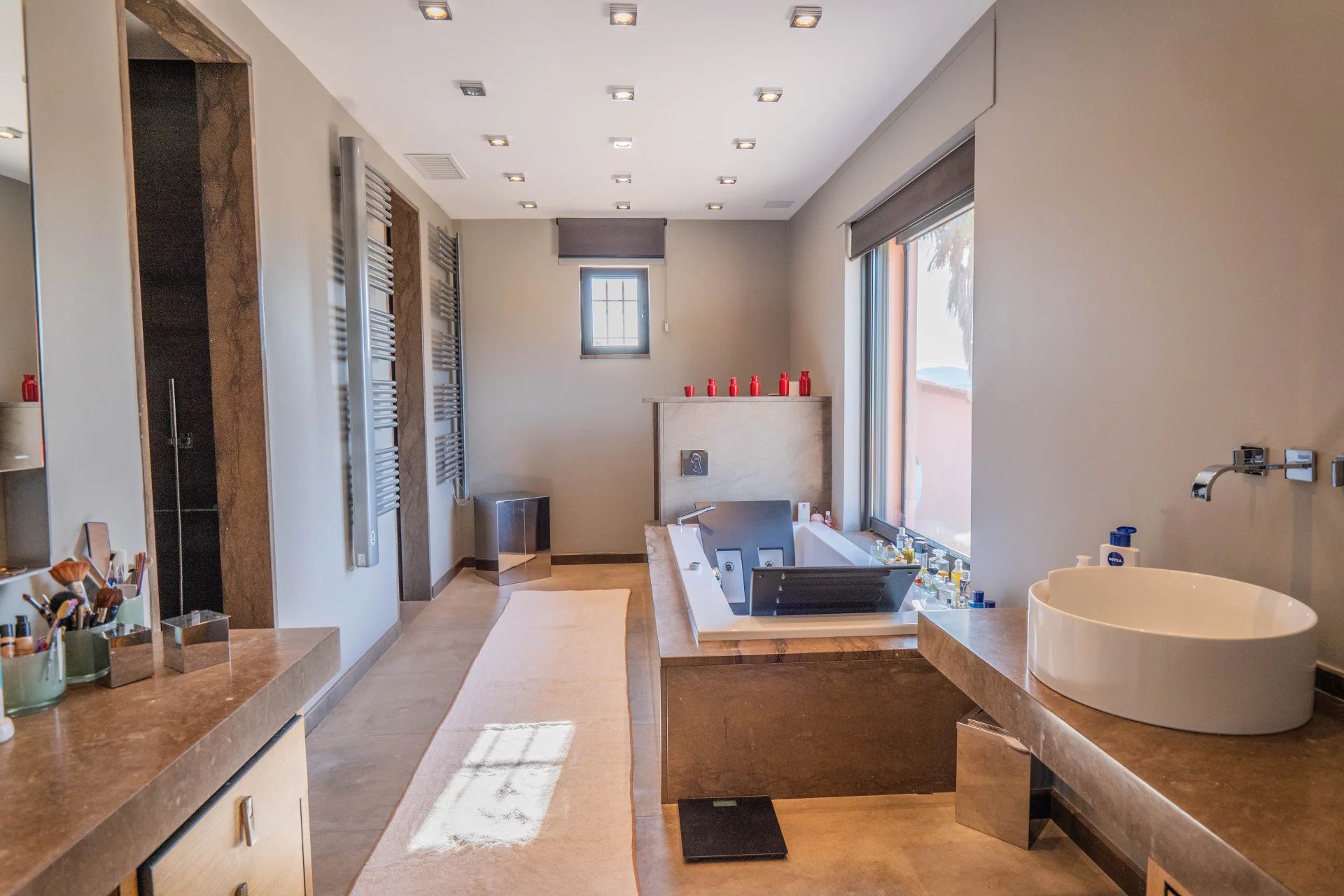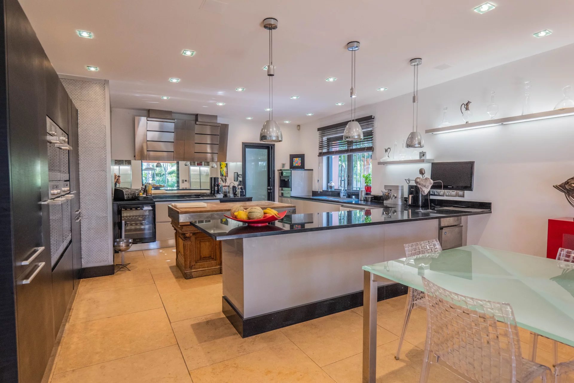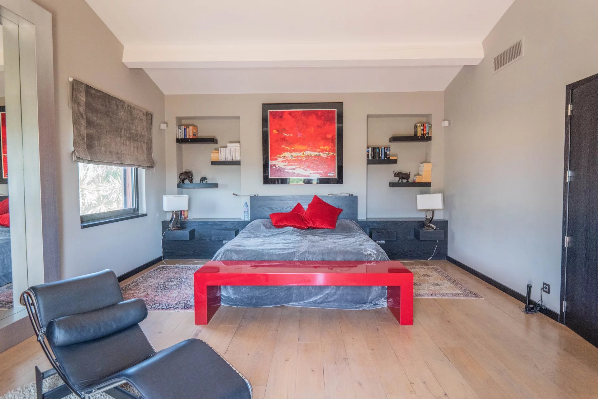 The visit of this luxurious contemporary villa will start, on the same level, by the patio located in the center of the house, you will also discover a superb living room including a living room and a contemporary American kitchen fully equipped, the property facing south and largely sunny and illuminated thanks to the large bay windows overlooking the garden and the swimming pool. 6 bedrooms with each their own shower room, dressing room, wine cellar … Garage and parking for your guests.