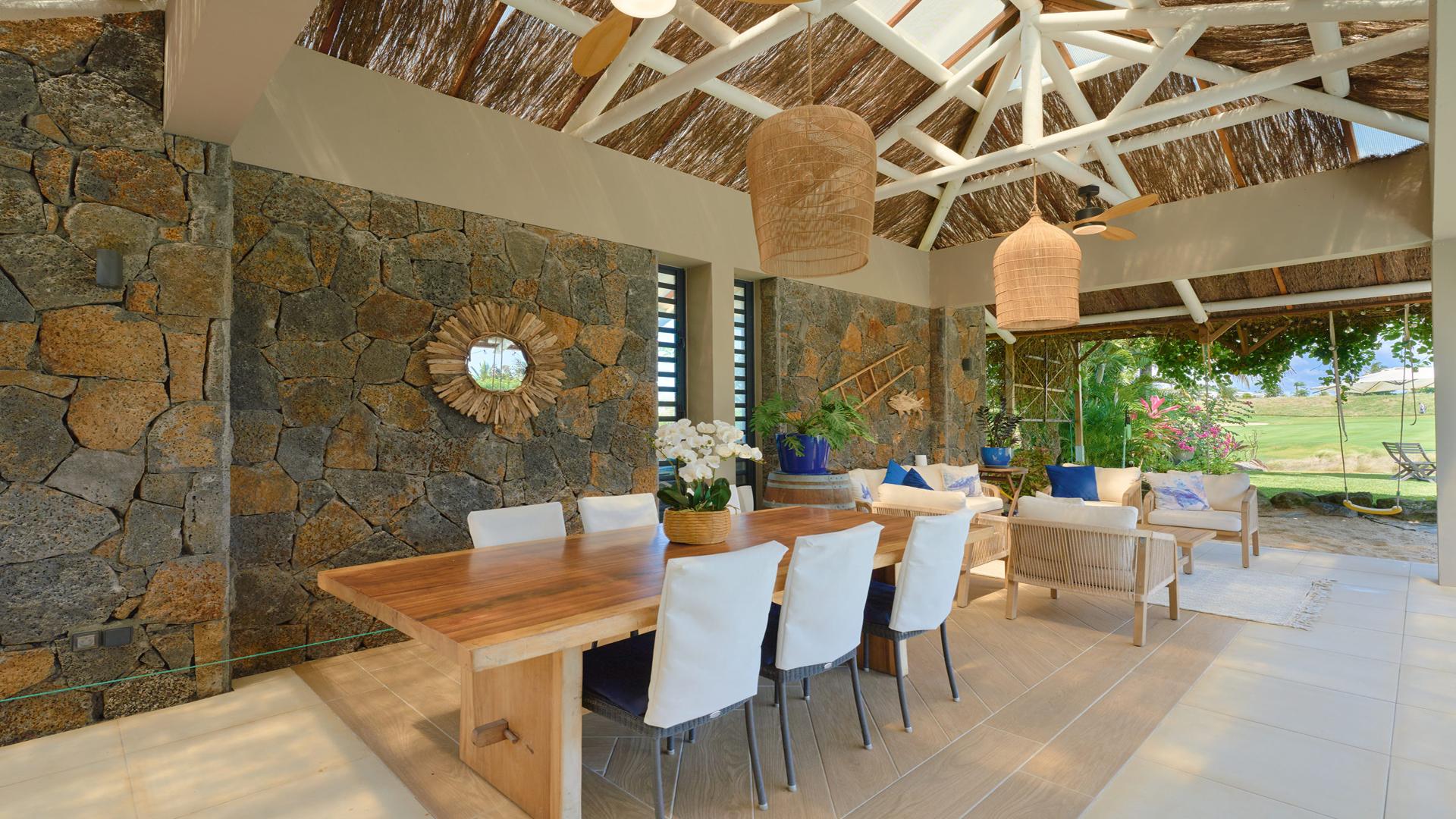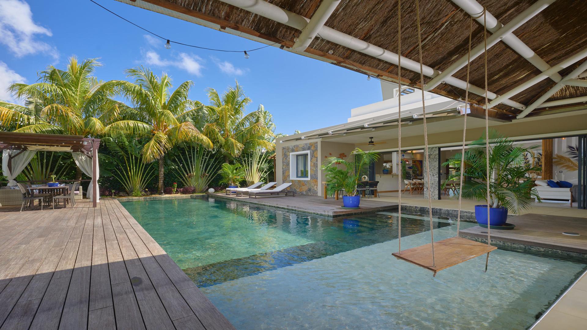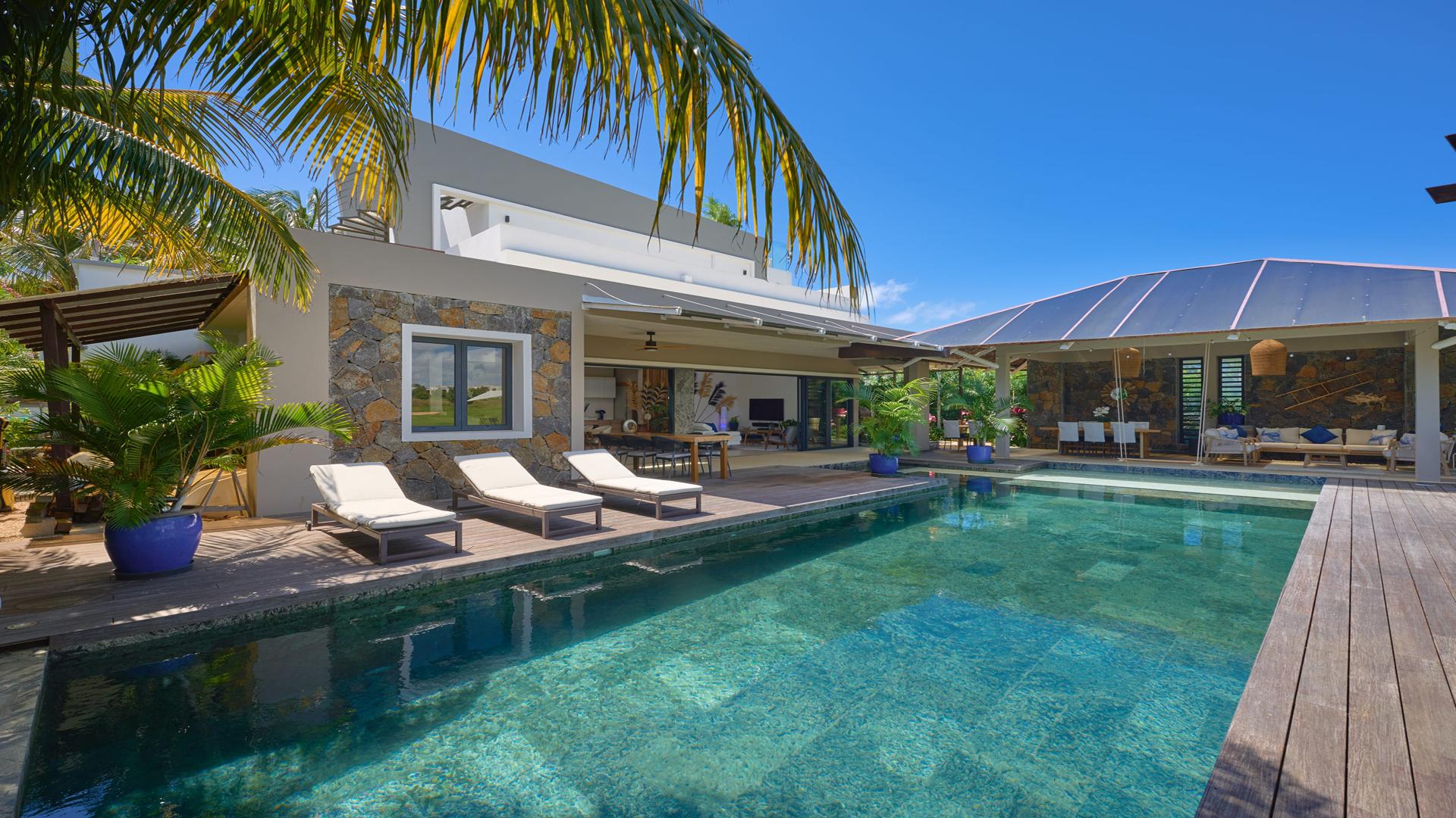 Privately set within the exclusive Azuri ocean & golf village and built in 2024, this 5-bedroom villa combines refined architecture, privacy, and lifestyle. Its private entrance immediately sets the tone for an exclusive experience.The interiors unfold with an open-plan concept, where the living and dining spaces flow seamlessly toward the pool and garden. The modern kitchen with it’s pantry, is complemented by a practical design, ensuring that functionality blends seamlessly with elegance.Each of the five bedrooms is a serene retreat, bathed in natural light and designed with understated sophistication. Find also a study.The villa overlooks the golf course, creating a calm yet sophisticated ambiance. The outdoor spaces are made for leisure and gatherings: a beautiful swimming pool framed by a landscaped garden, shaded terraces for relaxation, and an upper deck with a Jacuzzi, the ideal spot for sunsets and cocktails overlooking the fairways.As a rare advantage, this villa includes a golf membership.This property captures the art of refined living in Mauritius: exclusivity, elegance, and the harmony of nature and leisure.Contact us for a visit.
