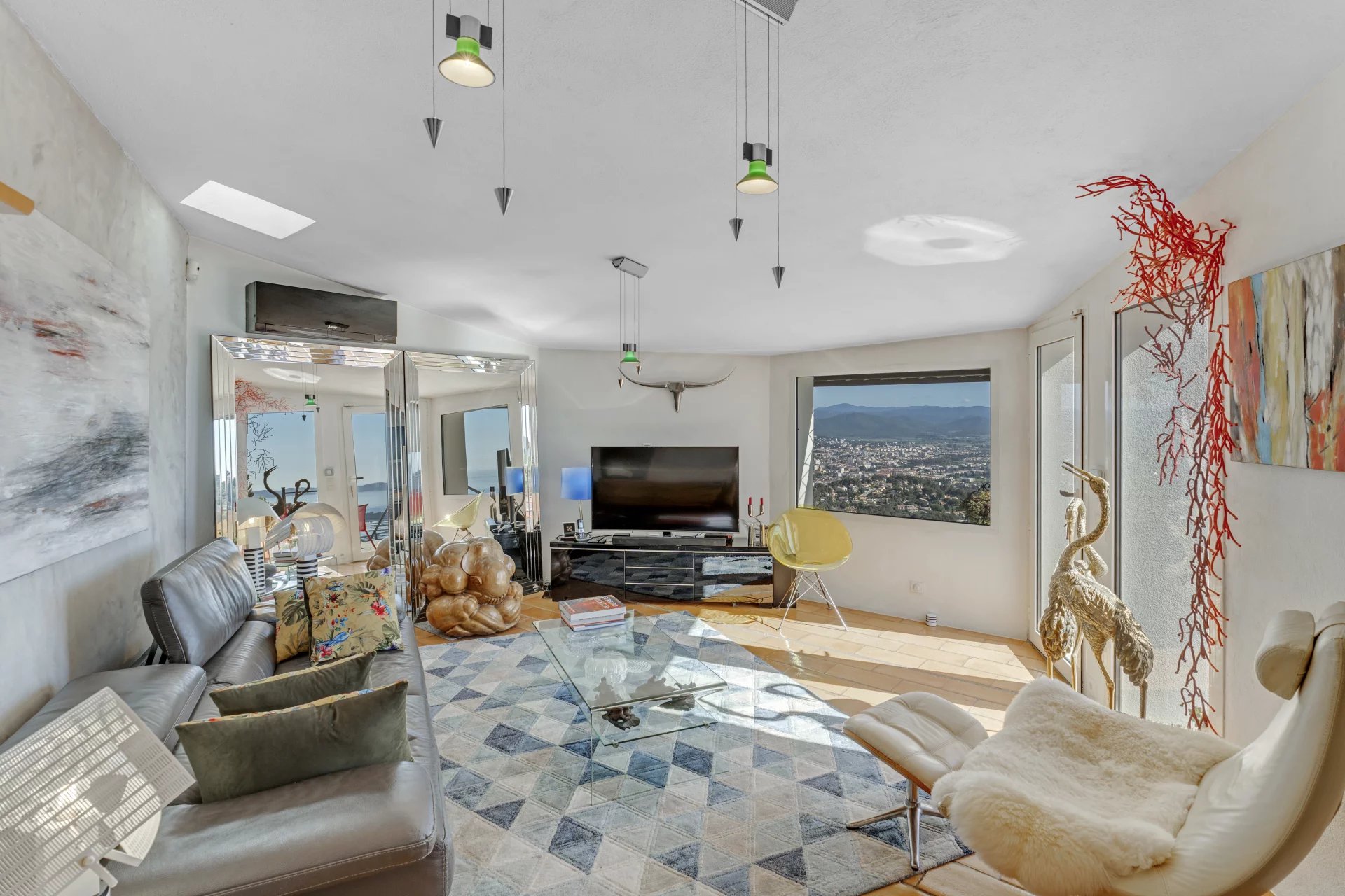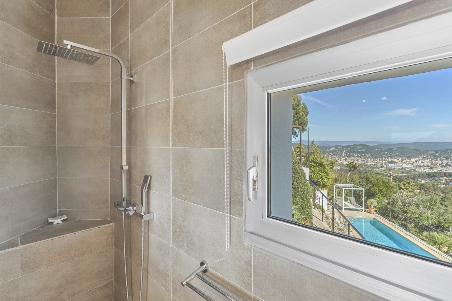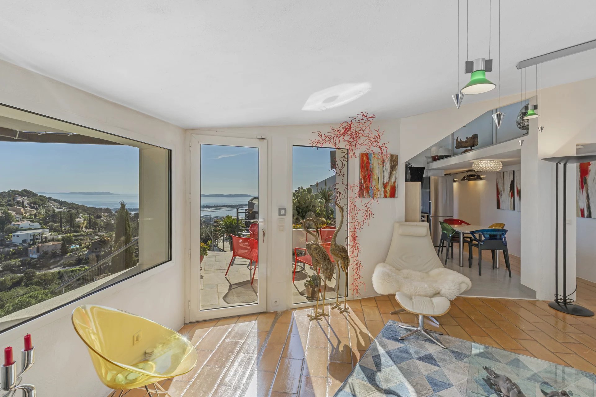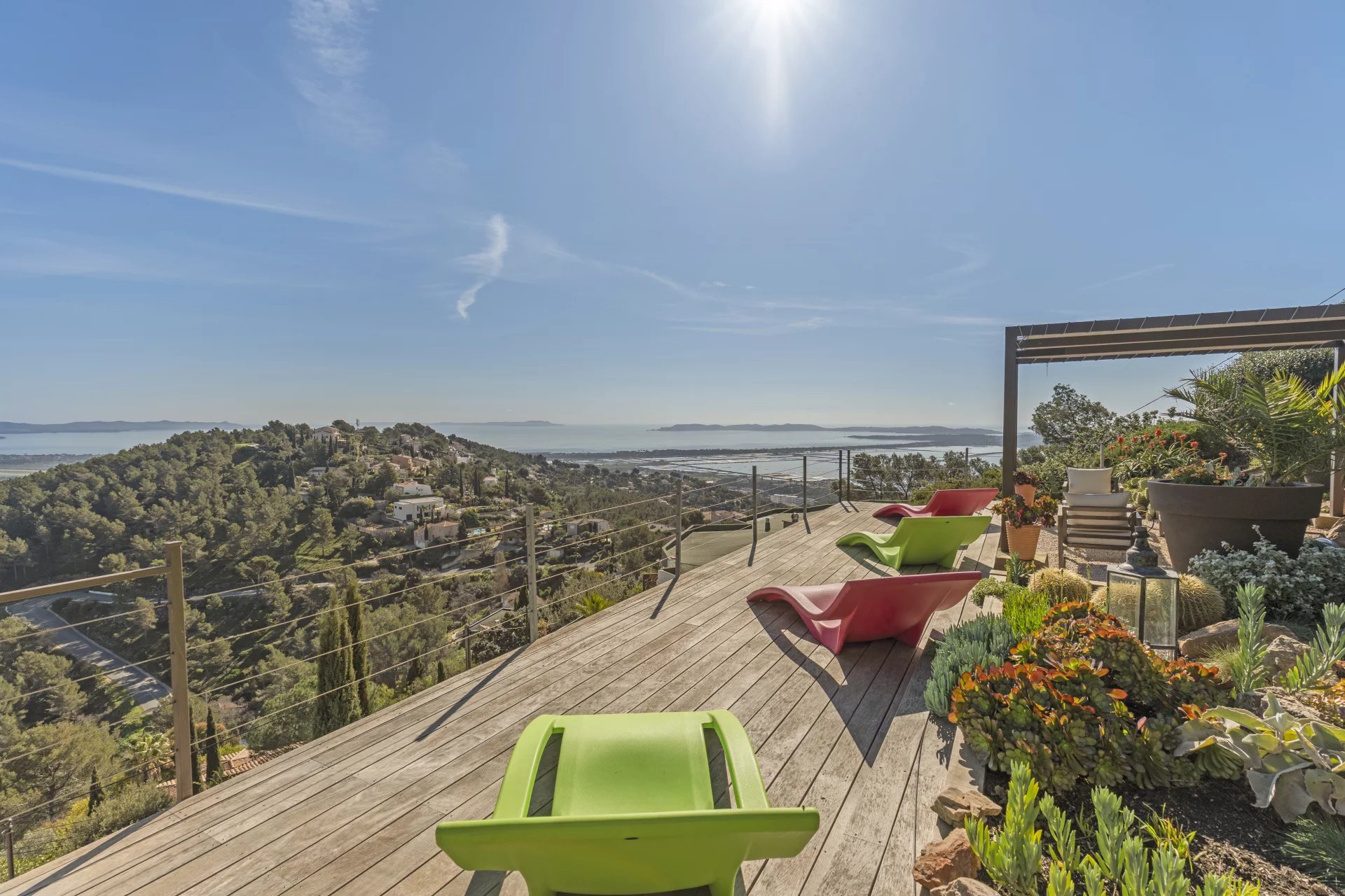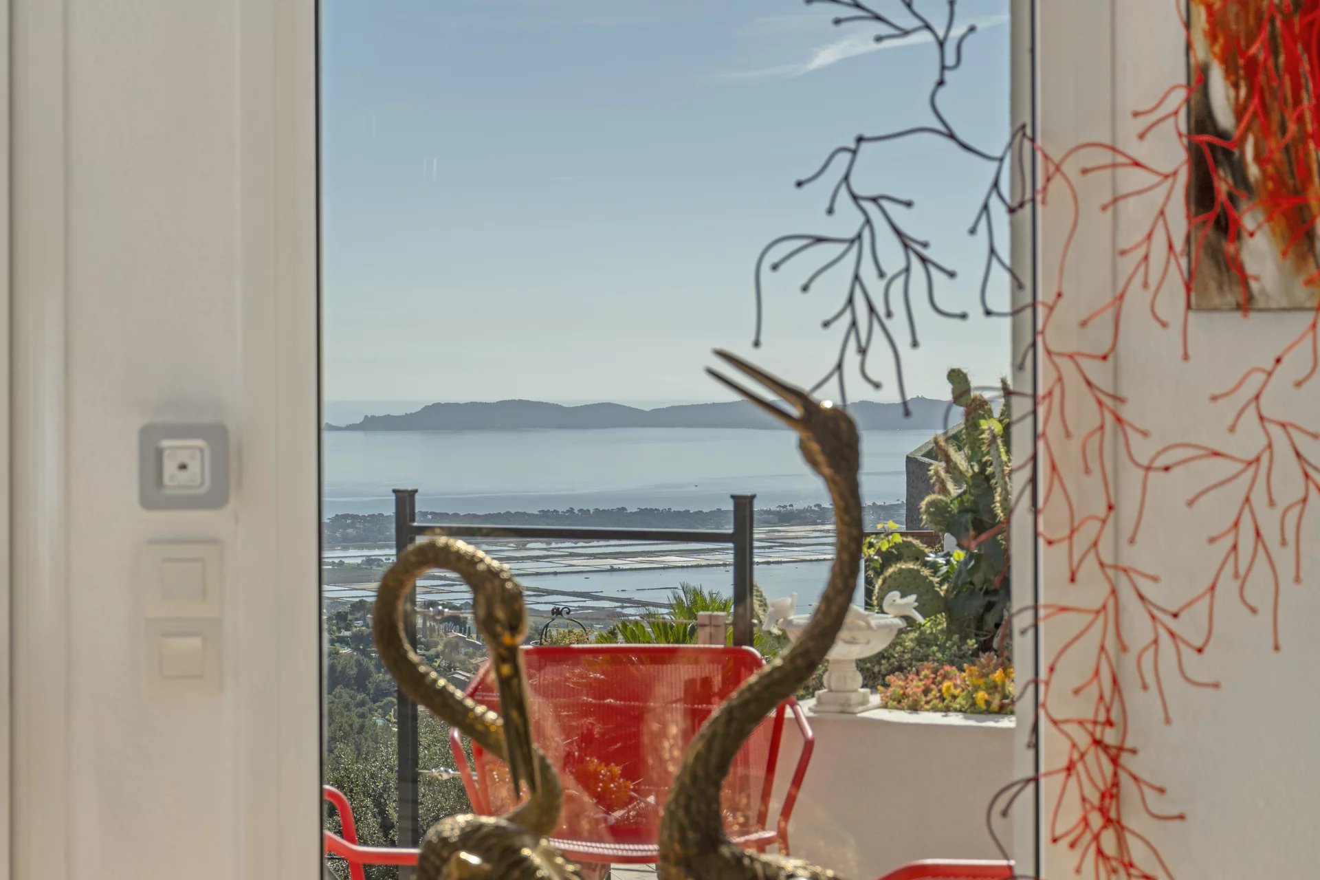 Outside, the swimming pool blends harmoniously into the landscape, while the solarium, a true lookout point, reveals one of the most spectacular views of Hyeres.