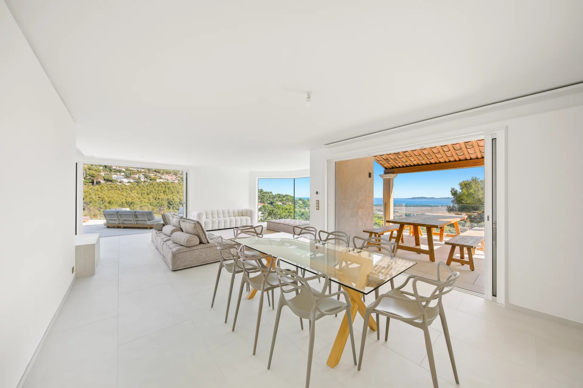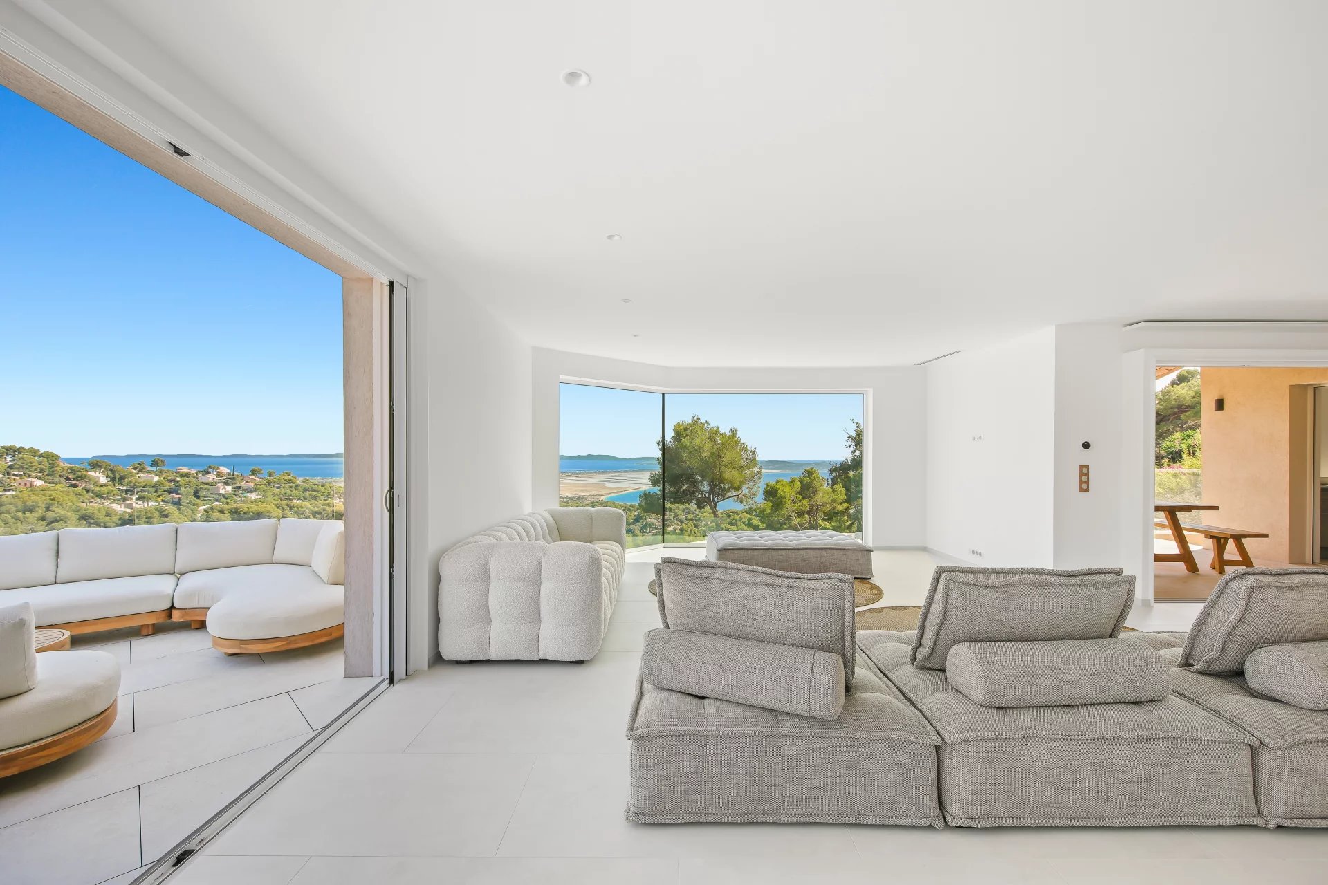 The bright living area opens onto two main terraces – one of which extends to the pool area – offering unobstructed views of the Iles d’Or bay.