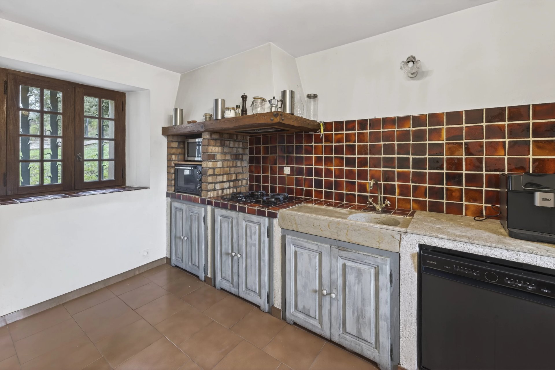 A basement garage provides parking for one vehicle. The house is equipped with reversible air conditioning in all rooms, canal water and a septic tank.