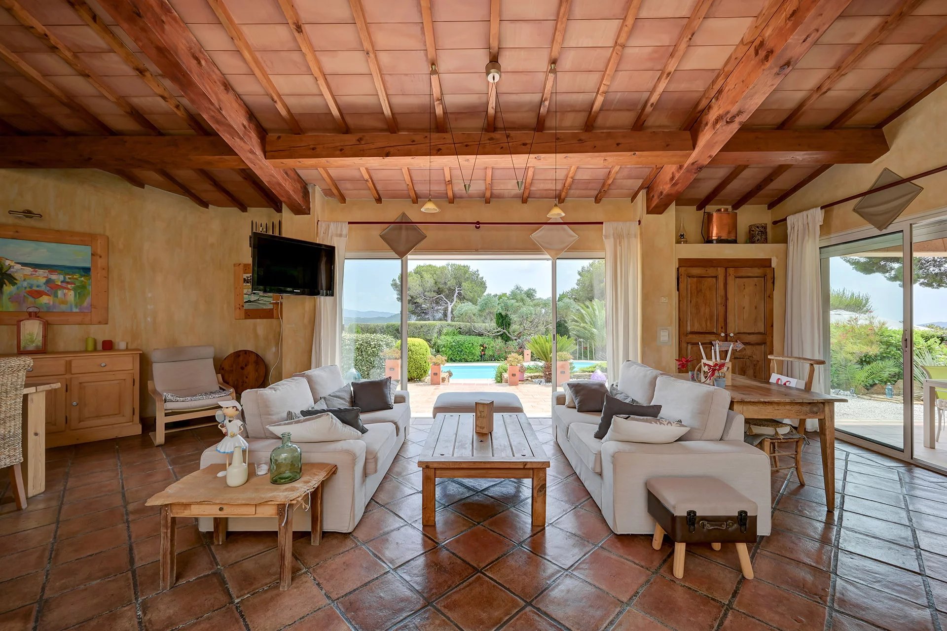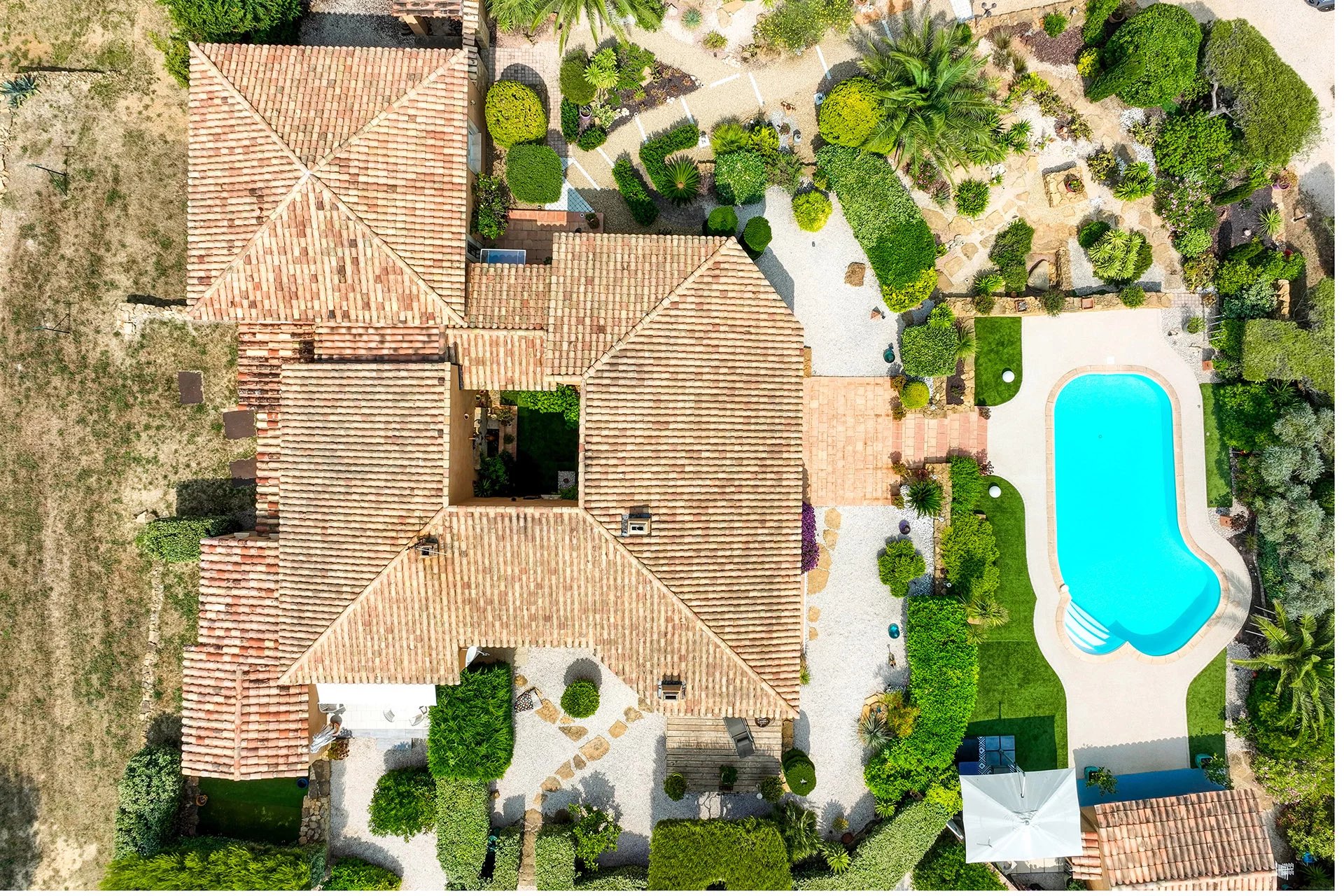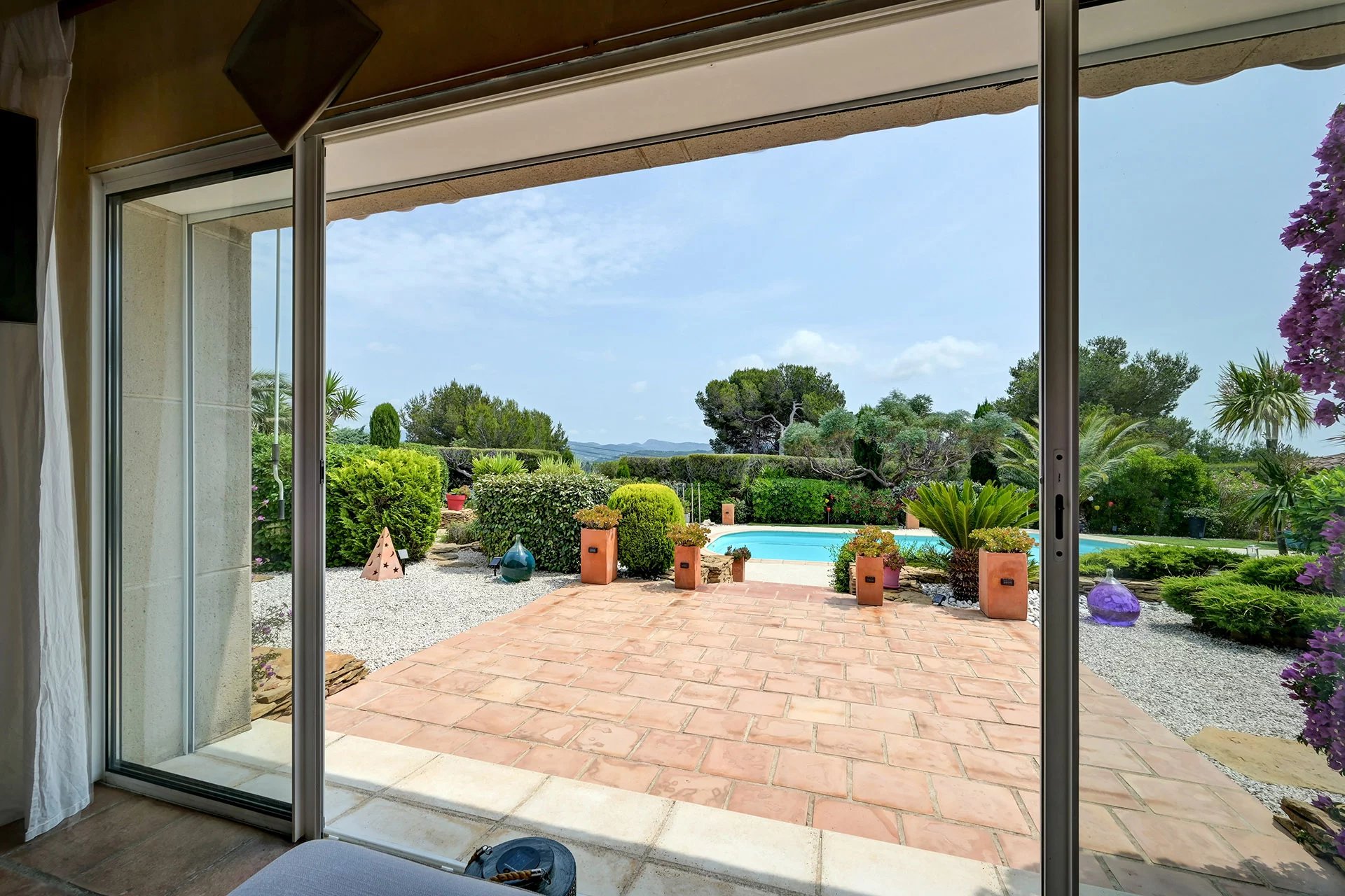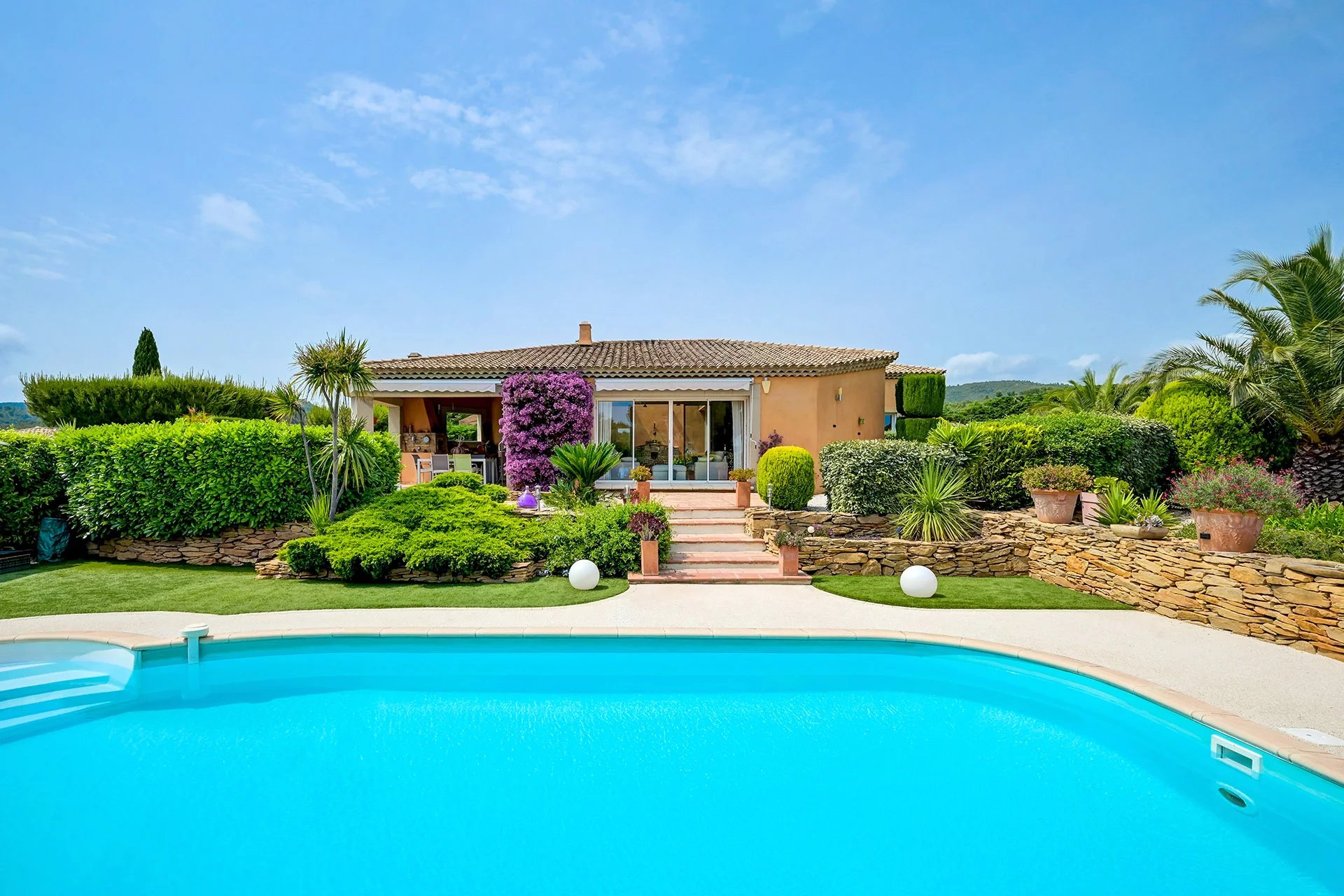 The meticulous architecture blends noble materials with Provencal tradition. The majestic entrance with its solid wood door opens onto a vast living room with a fireplace, arranged around a central open-air patio, a true light-well at the heart of the house. The family kitchen with its dining area opens onto an elegant covered terrace, equipped with a summer kitchen with pizza oven, ideal for entertaining.