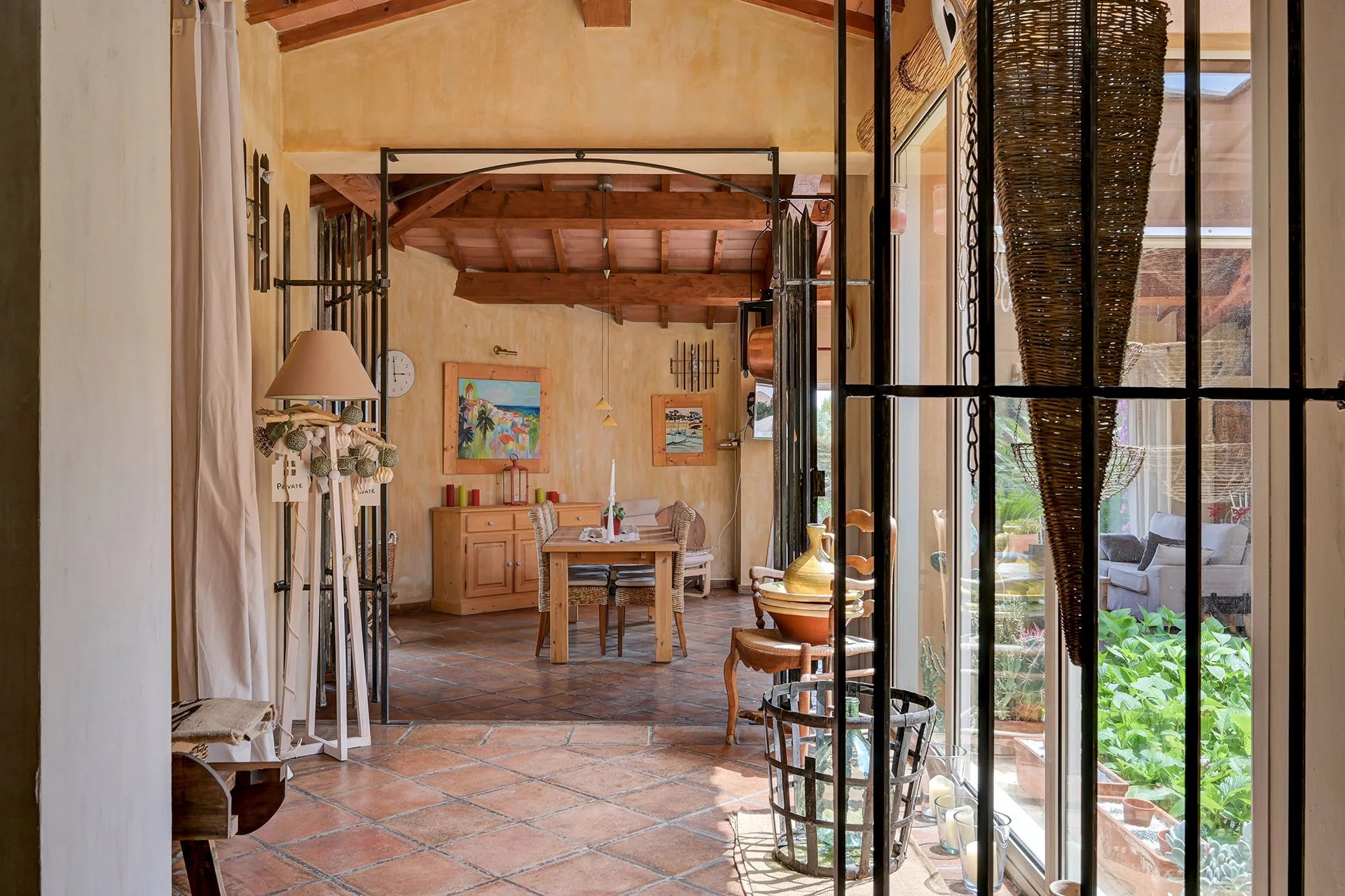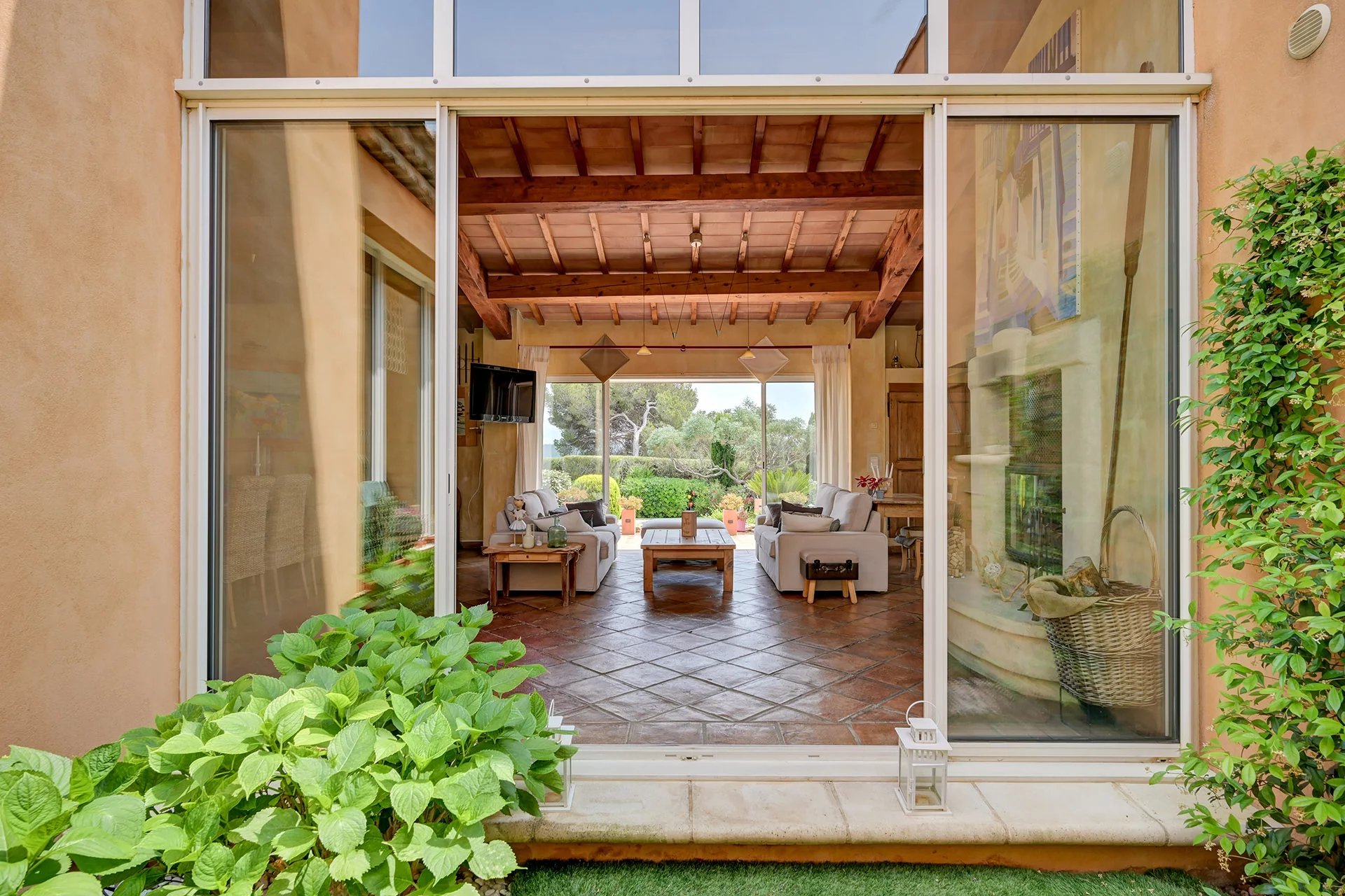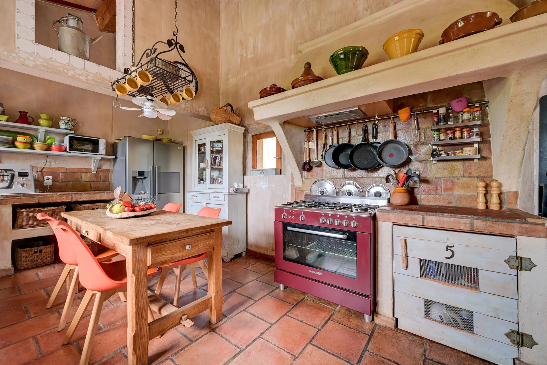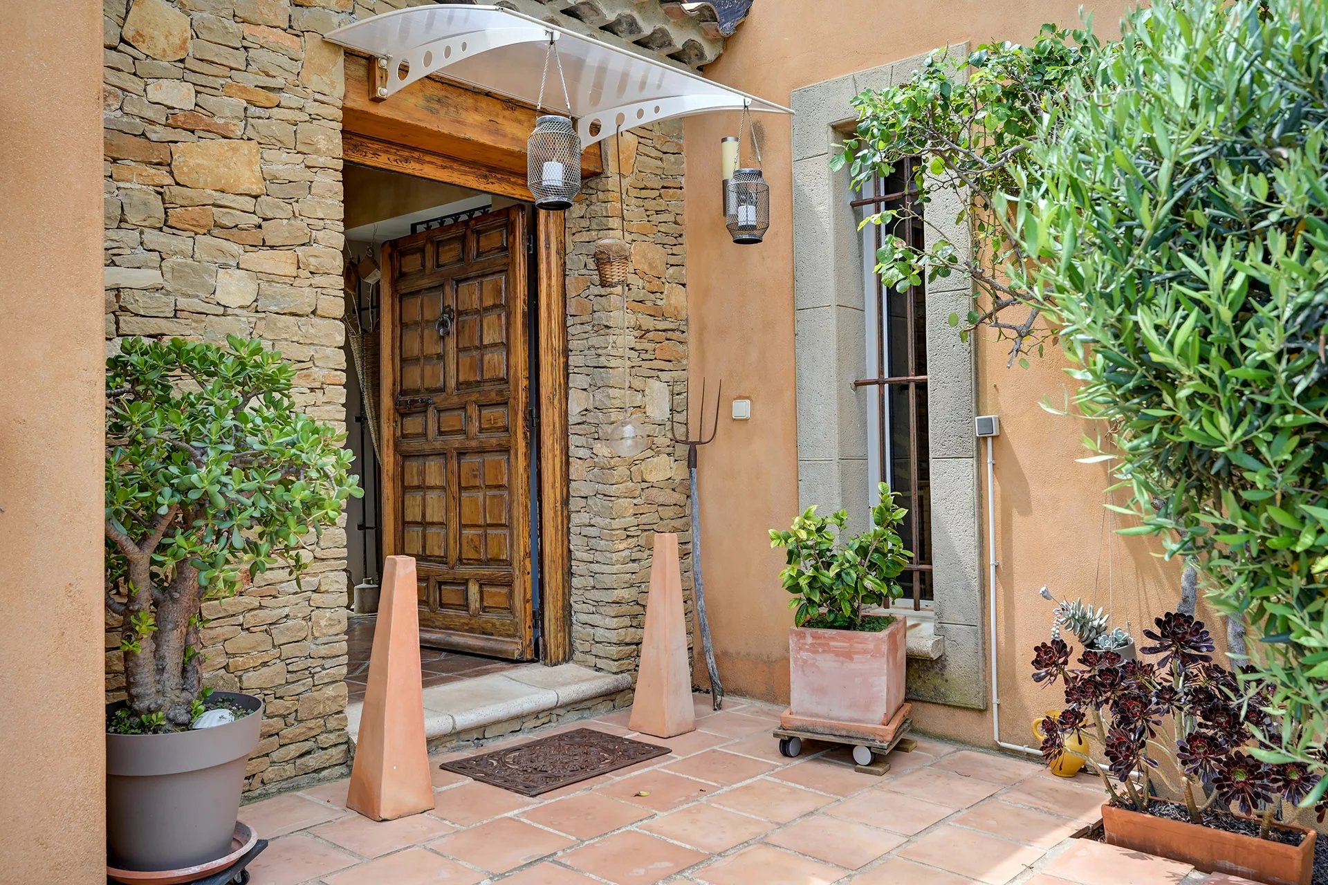 The meticulous architecture blends noble materials with Provencal tradition. The majestic entrance with its solid wood door opens onto a vast living room with a fireplace, arranged around a central open-air patio, a true light-well at the heart of the house. The family kitchen with its dining area opens onto an elegant covered terrace, equipped with a summer kitchen with pizza oven, ideal for entertaining.