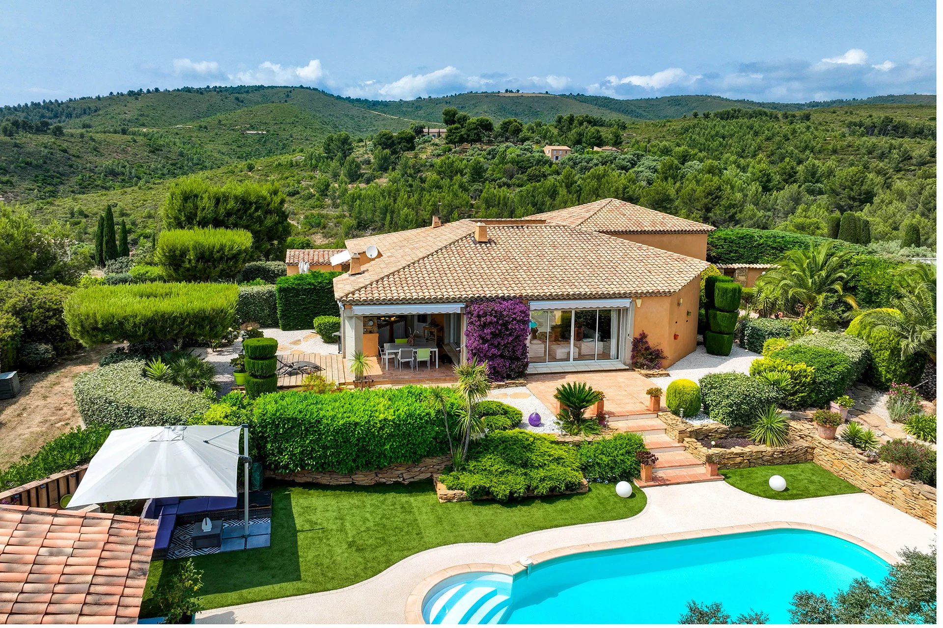 Nestled on the sought-after hills between Saint-Cyr-sur-Mer and La Cadiere d’Azur, this sumptuous single-story villa embodies Provencal refinement in a natural and unspoiled setting, offering an exceptional living environment nestled between the sea, vineyards, and forests.
