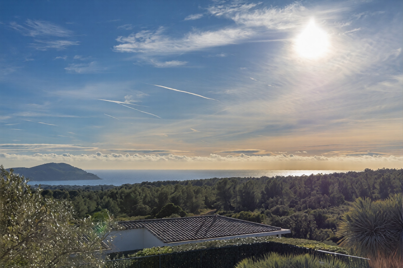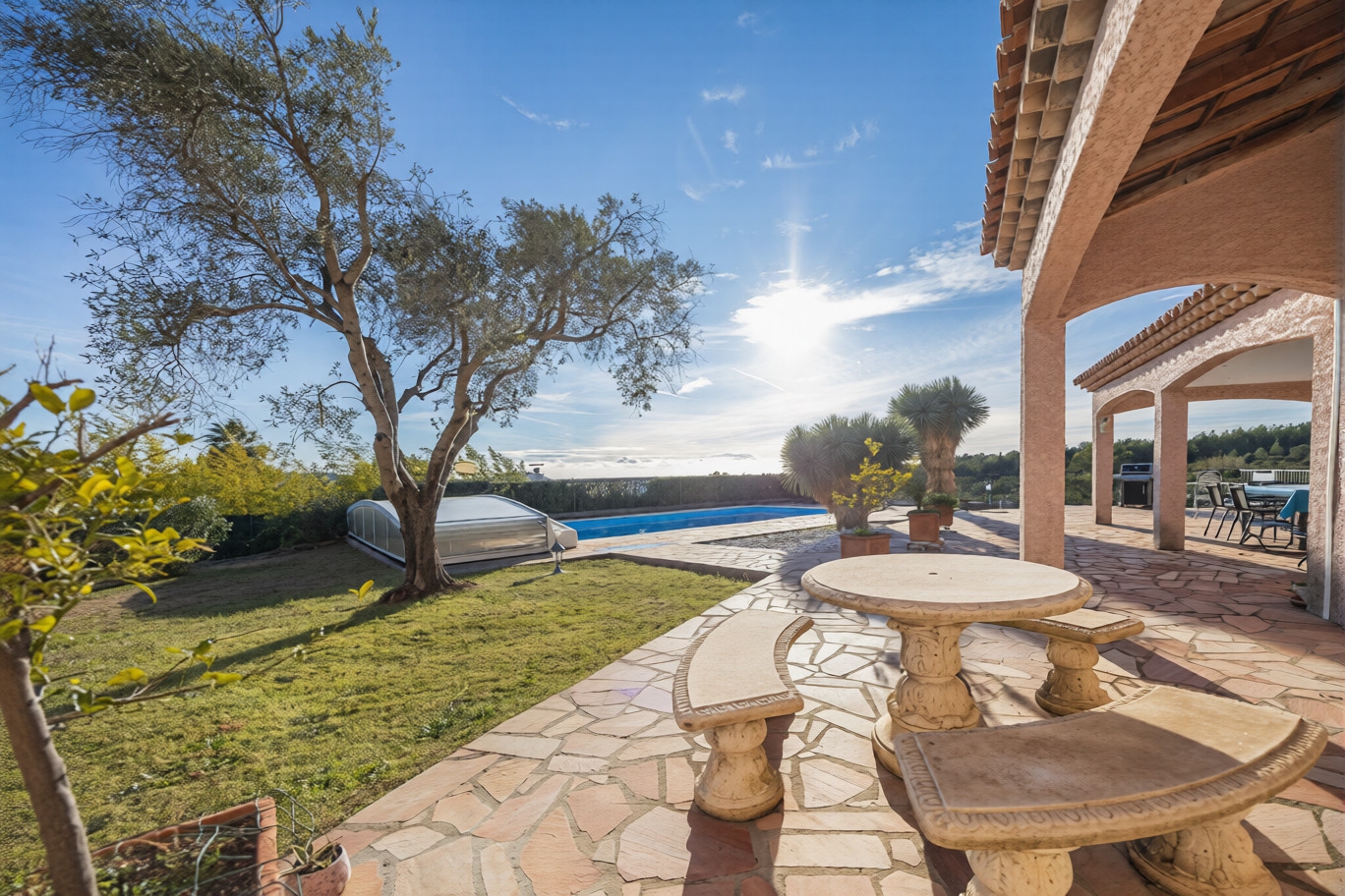 Built on a 2,000 m2 enclosed, landscaped, and wooded plot, it offers a privileged living environment with magnificent views of the sea and the hills.